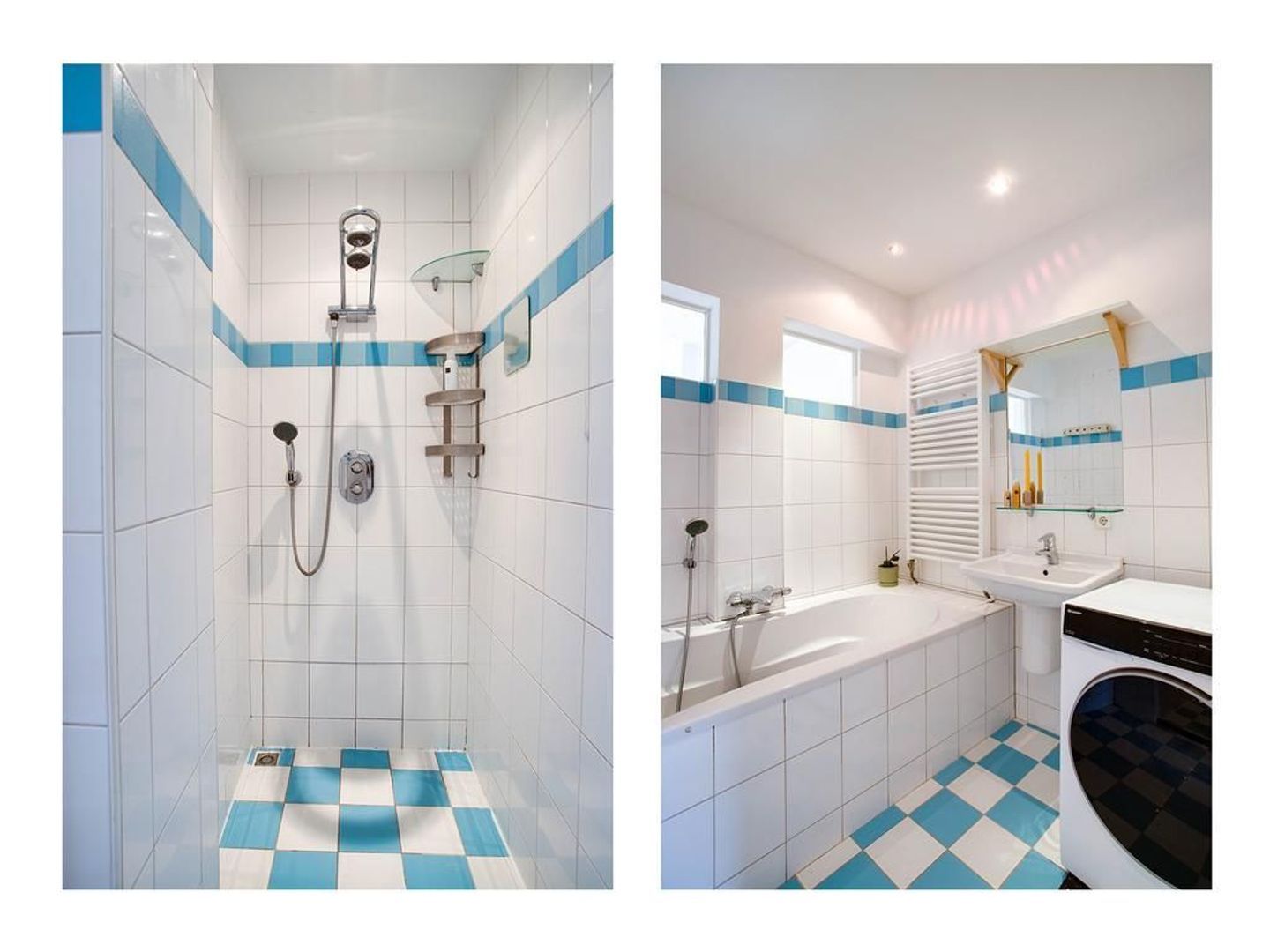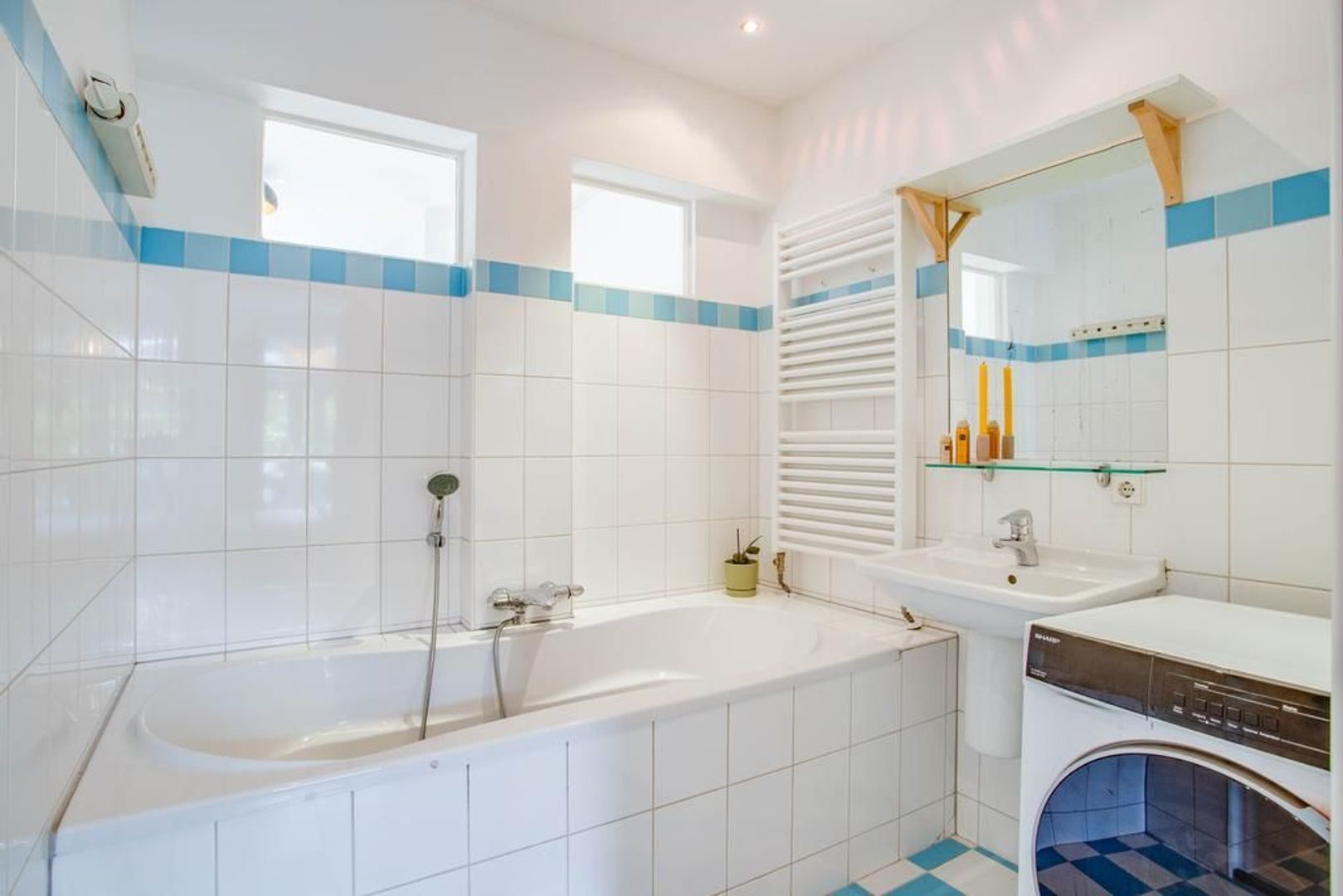 De badkamer is verzorgd en voorzien van een ligbad, inloopdouche, wastafel en opstelplaats voor de wasmachine.