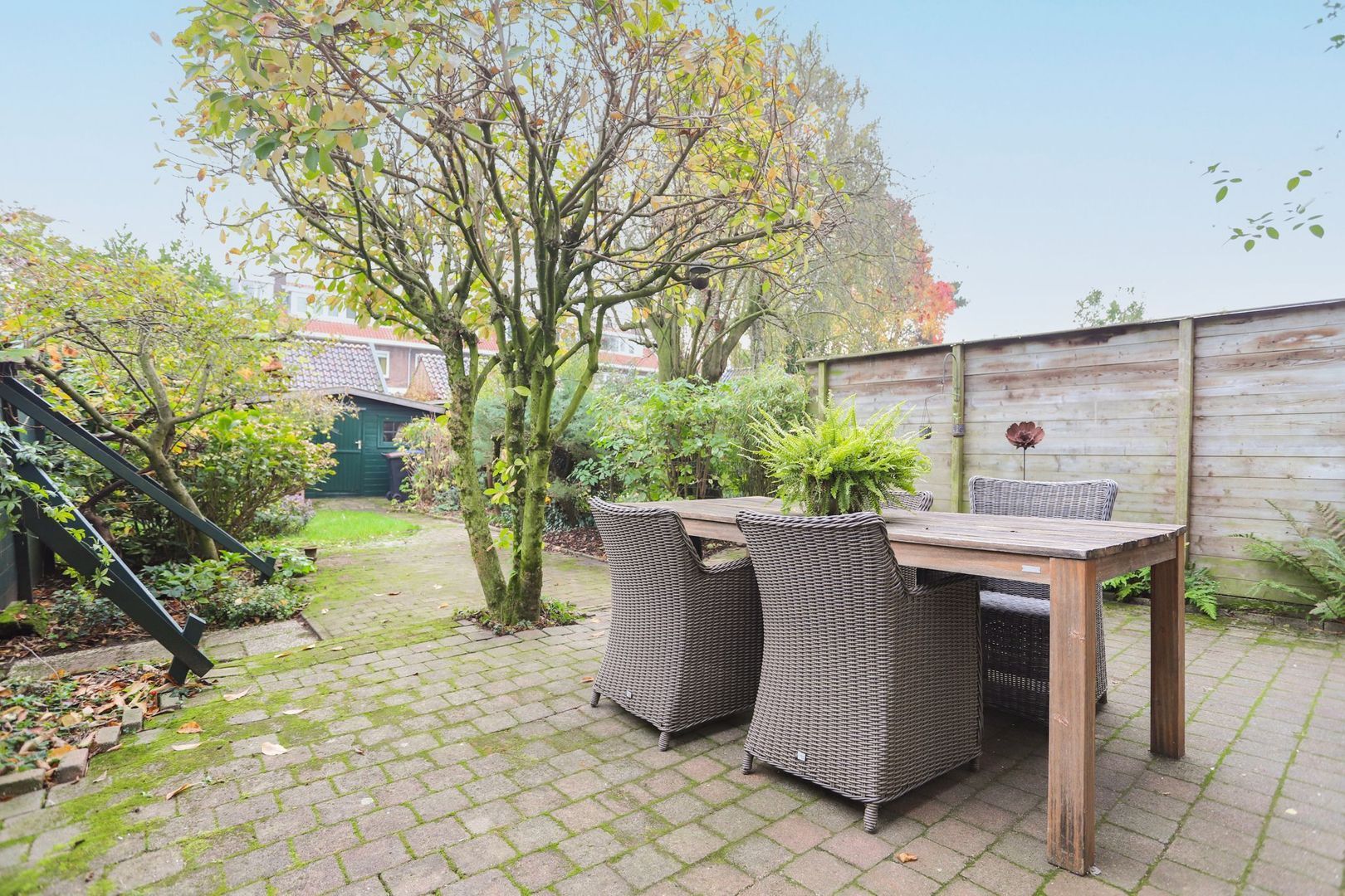 Begane grond: Entree met trapopgang naar de eerste verdieping, toiletruimte, kelderkast (met meterkast) en toegang tot de woonkamer en keuken. De doorzonwoonkamer is heerlijk ruim, de erker aan de voorzijde en de schuifpui aan de achterzijde zorgen voor veel lichtinval. De keuken is voorzien van een wandopstelling met zowel boven- en onderkasten. De losse apparatuur gaat mee, de afzuigkap blijft achter. De achterdeur in de keuken biedt toegang tot de groene ruime achtertuin, welke is gelegen op het zuidoosten. De tuin is ingericht met een terras, gazon en veel groen. Het tuinhuisje achter in de tuin biedt veel opbergmogelijkheden. Door de ligging op een hoek is de achterom aan de zijkant van de tuin gelegen, ideaal voor de fietsen!