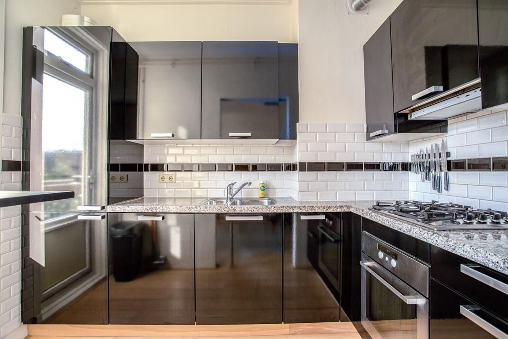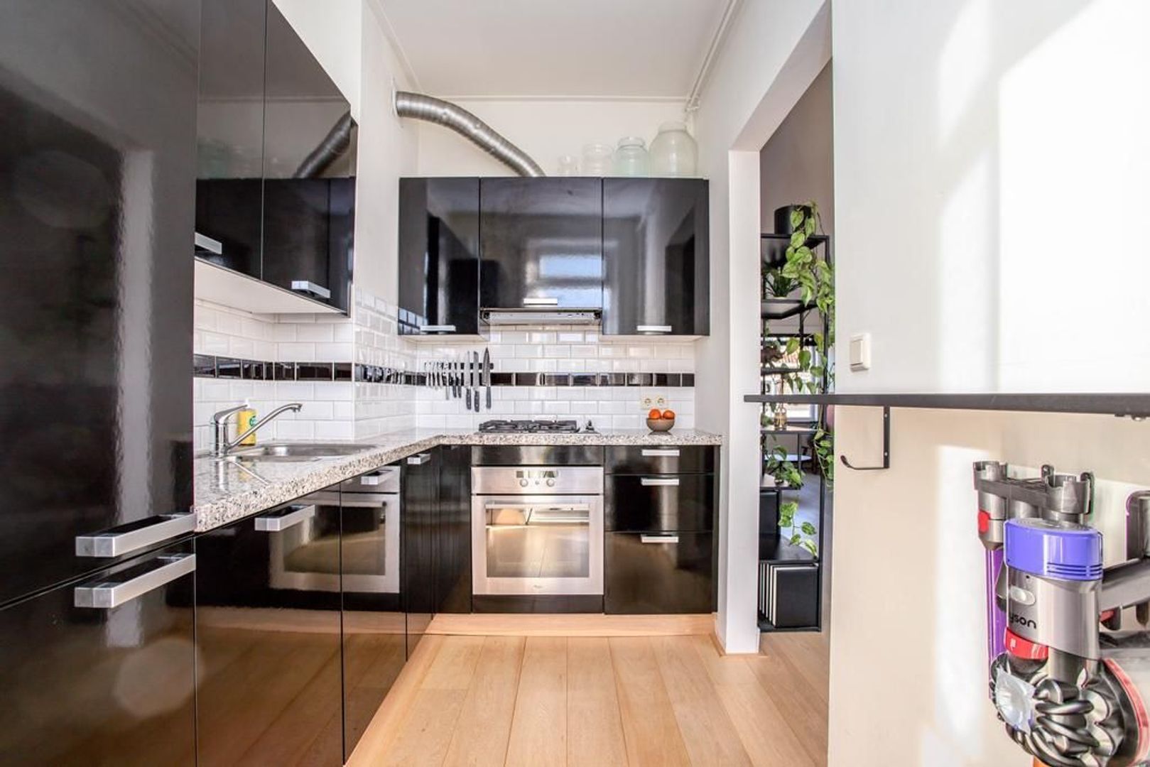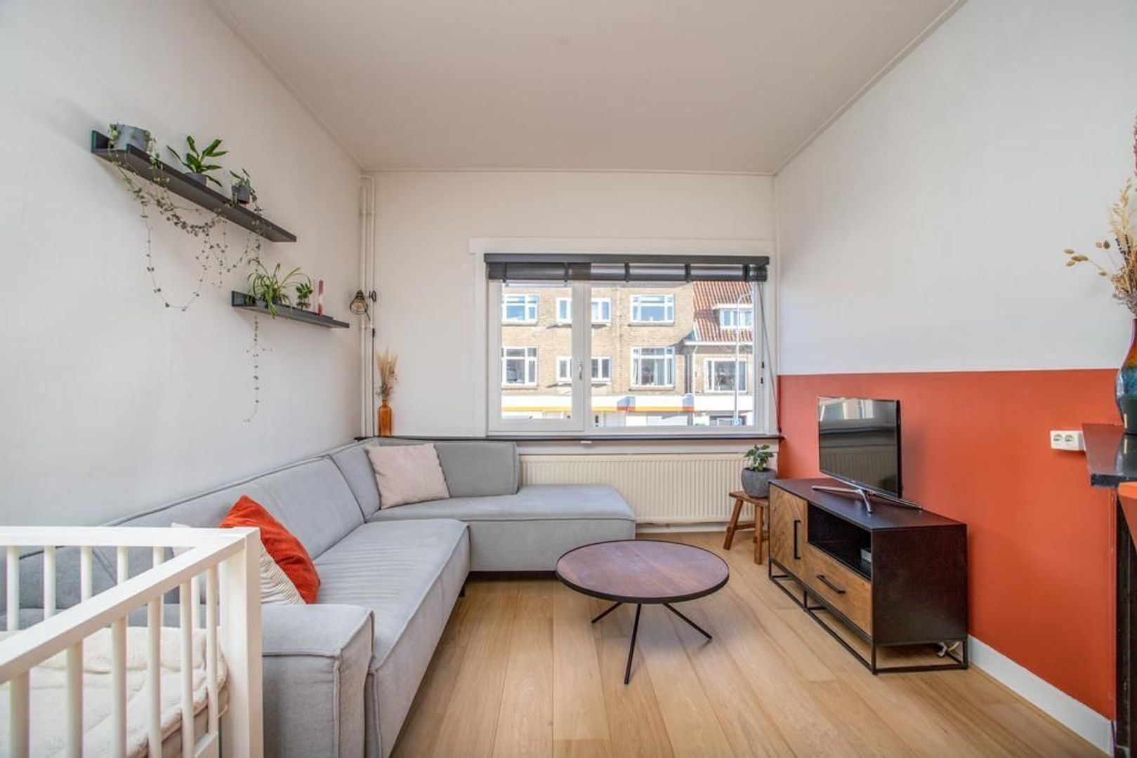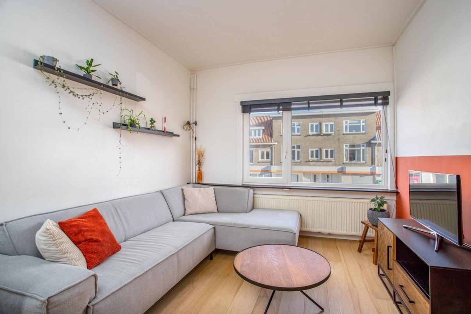 Centrale hal met toegang tot de badkamer, het toilet en de woonkamer. De woonkamer kenmerkt zich door de hoge plafonds en de fijne lichtinval van zowel de voor- als achterzijde. Deze ruimte is voorzien van strak stucwerk en een stijlvolle houten vloer. Er is meer dan voldoende ruimte om een royale zit- en eethoek te creëren die in verbinding staat met de halfopen keuken. De keuken is efficiënt ingedeeld en voorzien van deels vernieuwde inbouwapparatuur. Vanuit zowel de woonkamer als de keuken is het aangrenzende balkon bereikbaar. Het balkon, gelegen op het zonnige westen, biedt voldoende privacy. Vanuit de hal zijn het toilet en de aparte badkamer bereikbaar. De badkamer beschikt over een douchecabine, wastafelmeubel en een opstelplaats voor de wasmachine.