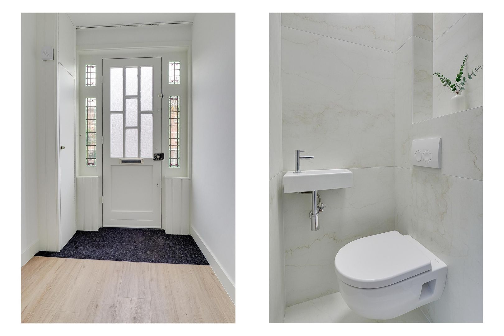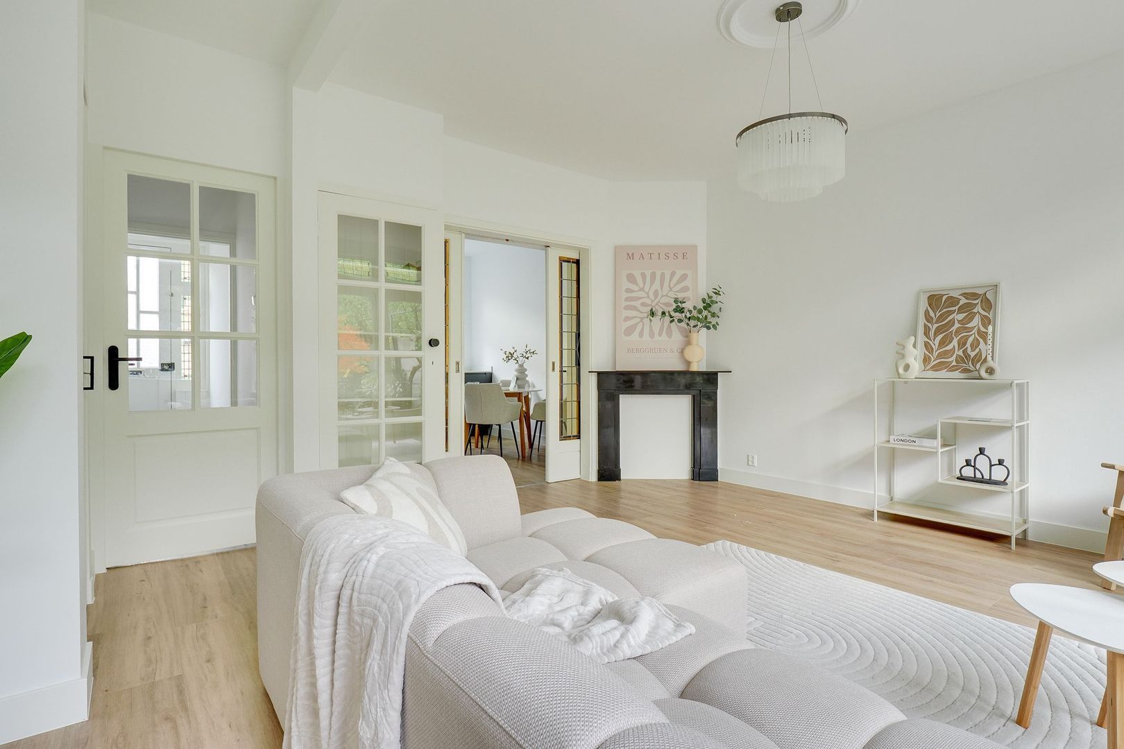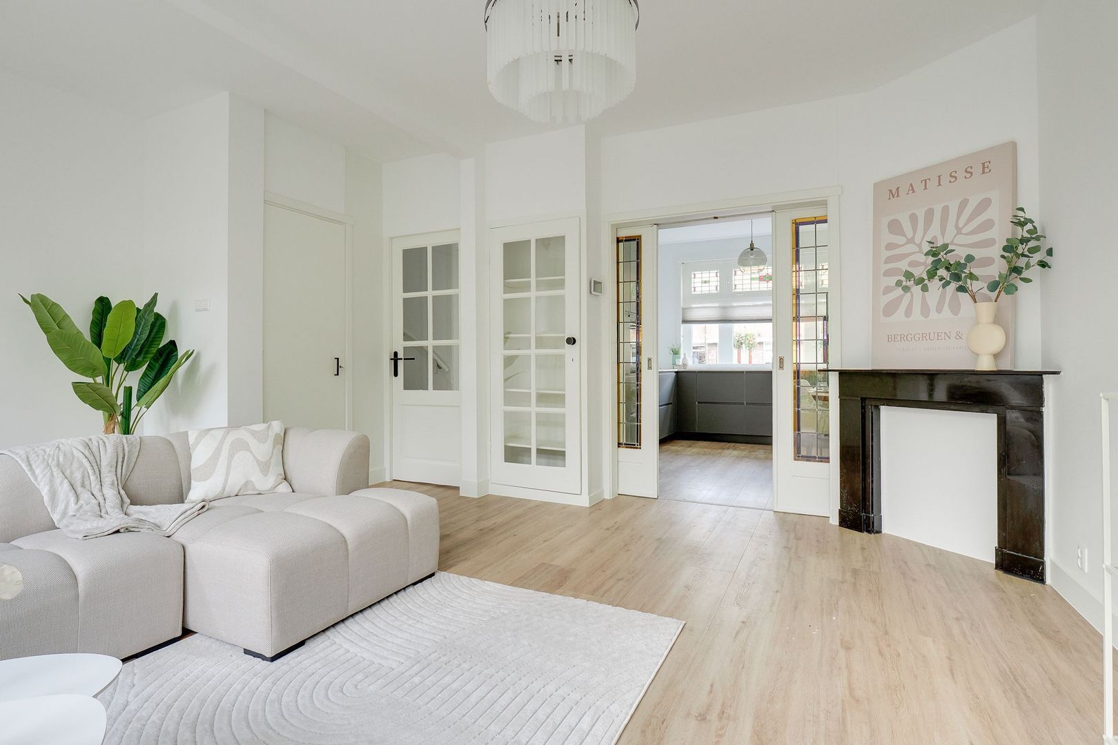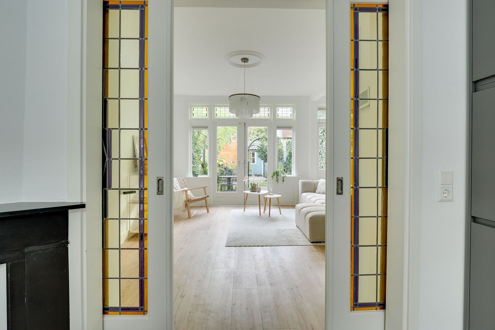 Je komt de karakteristieke jaren '30-woning binnen via de entree/hal met trapopgang naar de eerste verdieping, een trapkast en een modern toilet met fonteintje. Vanuit de hal loop je door naar de sfeervolle woonkamer-en-suite, voorzien van prachtige glas-in-lood schuifdeuren, schouwen en een nette pvc-vloer met vloerverwarming. De kamer is vrij breed opgezet en biedt mogelijkheden voor verschillende indelingsvarianten.