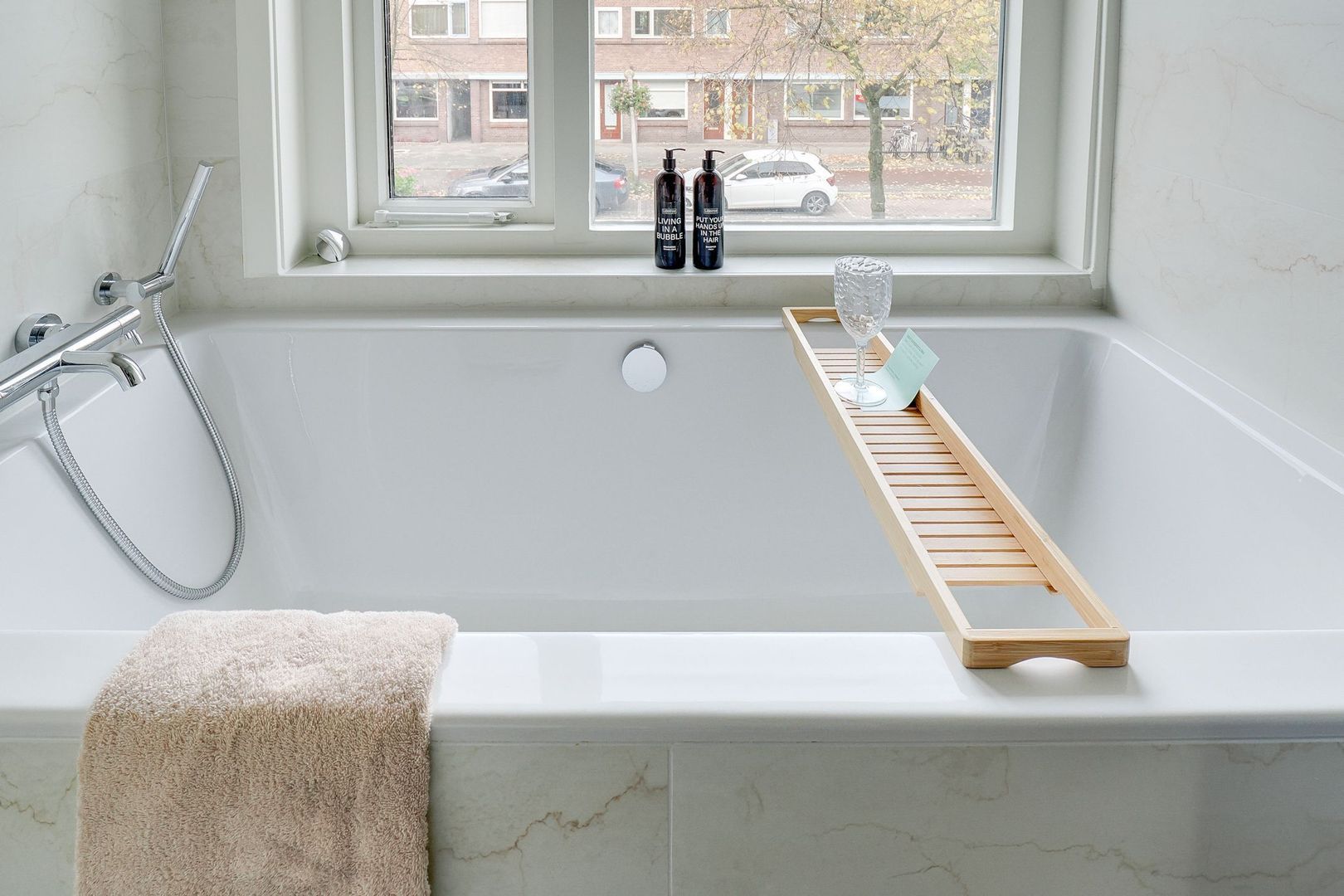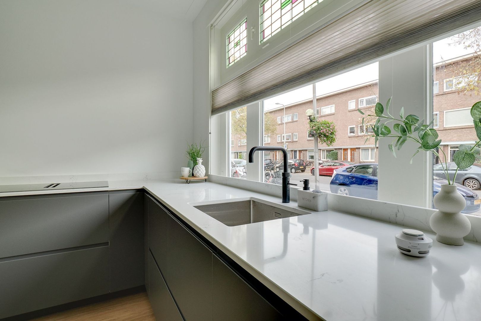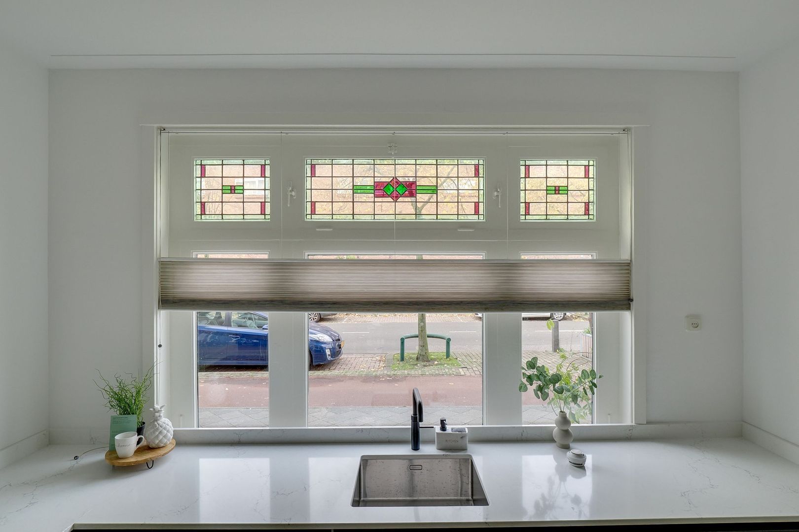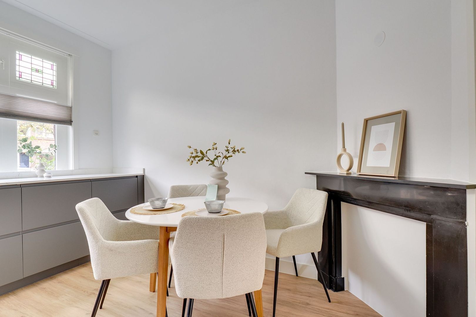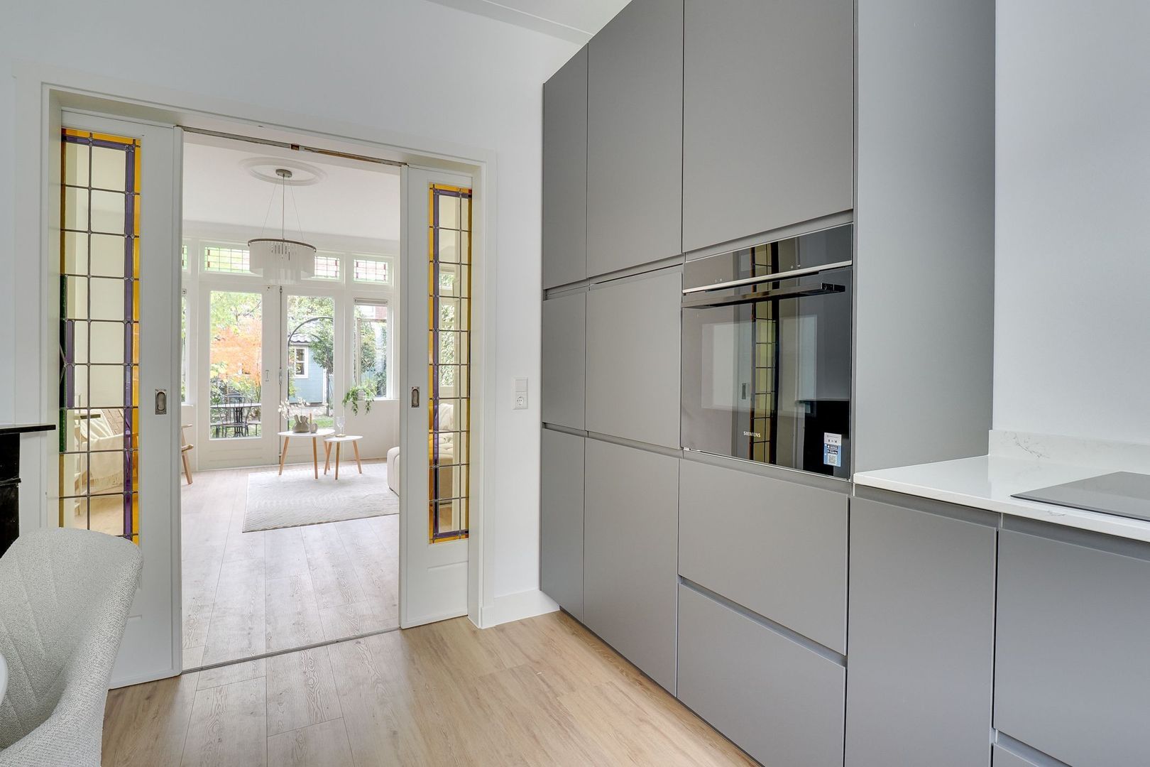 De woonverdieping is voorzien van glas-in-loodramen, charmante en-suitedeuren, een authentieke schouw en een geheel vernieuwde, luxe keuken aan de voorzijde. Deze keuken is uitgerust met hoogwaardige inbouwapparatuur, waaronder een inductiekookplaat met geïntegreerd afzuigsysteem, vaatwasser, Quooker en koel-/vrieskast.