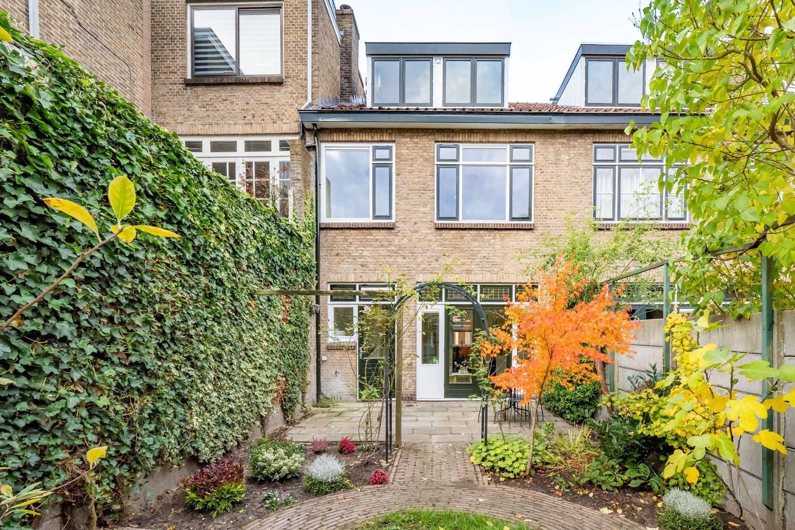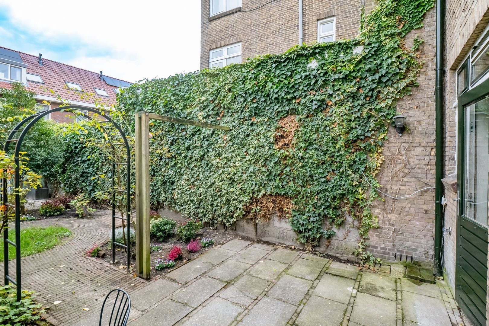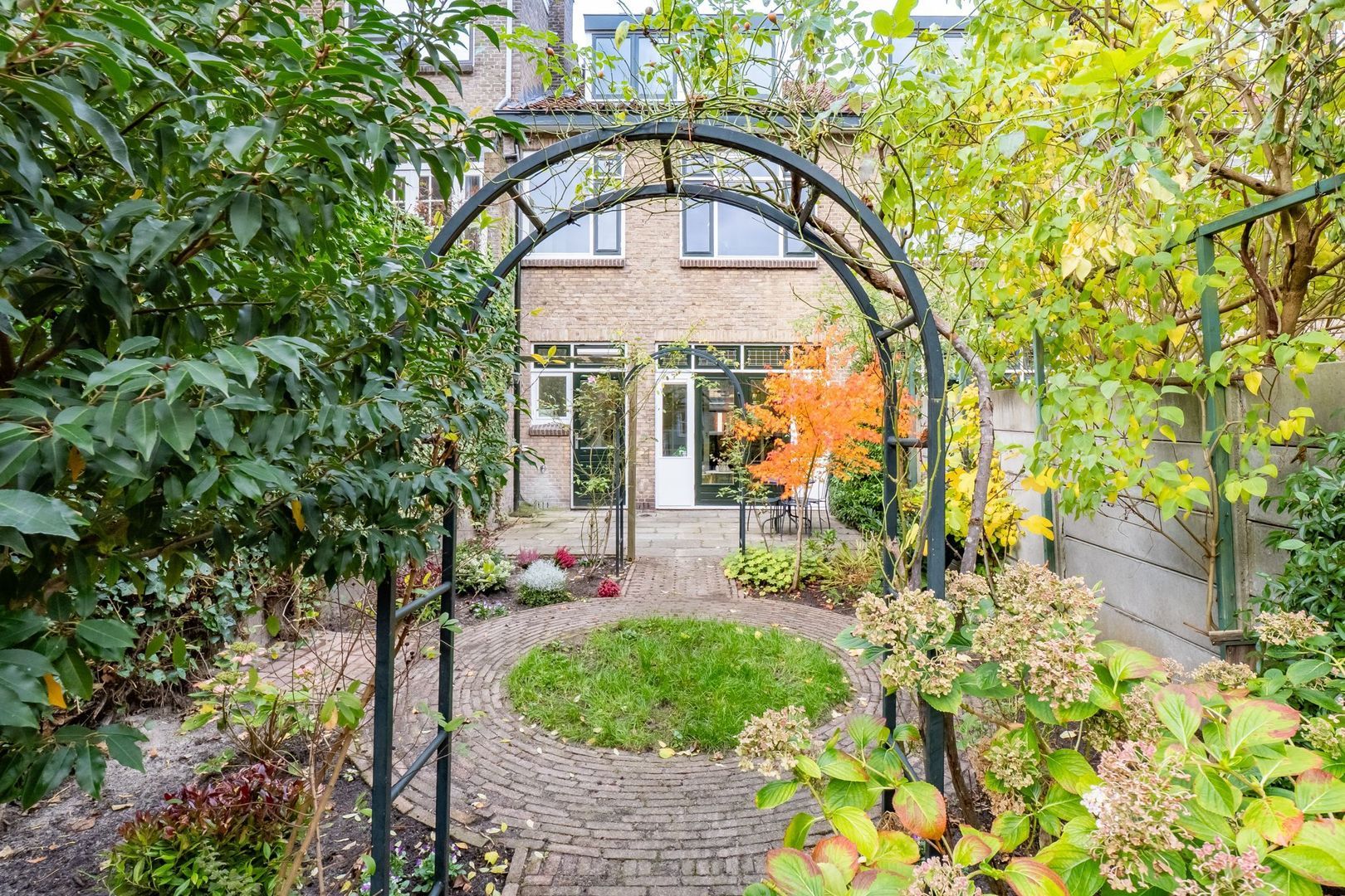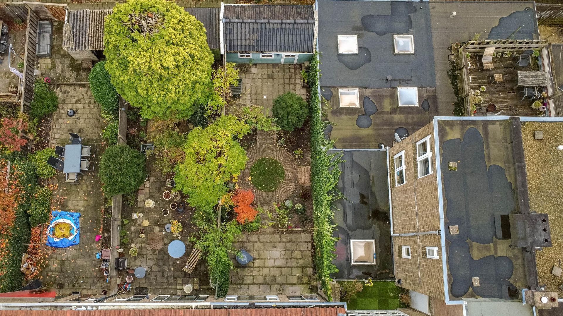 De achtertuin is verrassend ruim en fraai aangelegd. Dankzij de diepte van circa 15 meter is er vrijwel de hele dag een plekje in de zon of schaduw te vinden. De tuin is bereikbaar via een achterom en beschikt over een houten berging met elektra.