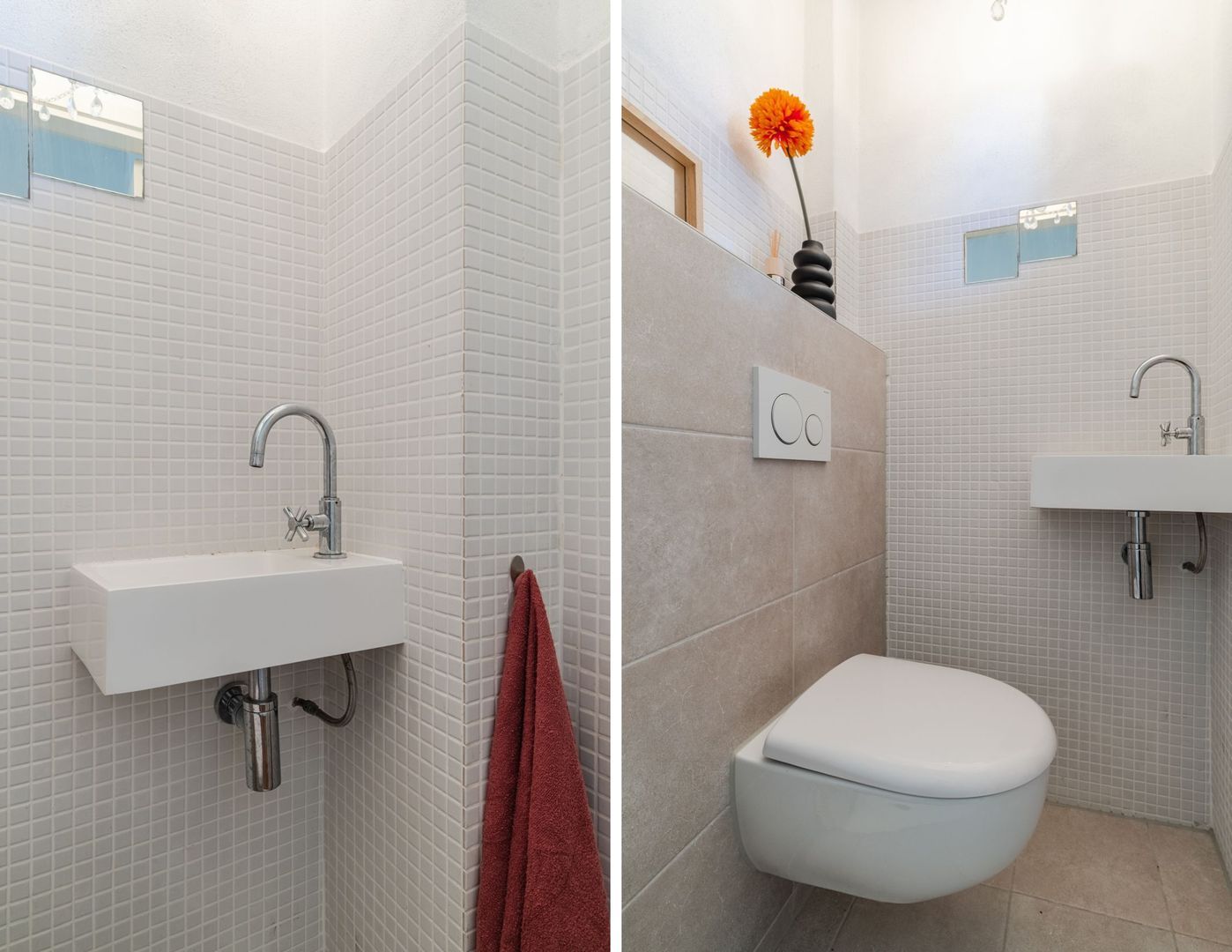 Via de hal kom je op een ruime overloop met toegang tot een inpandige berging met opstelplaats voor de cv-installatie, wasmachine en droger. Daarnaast bevindt zich hier een separaat toilet met fontein.