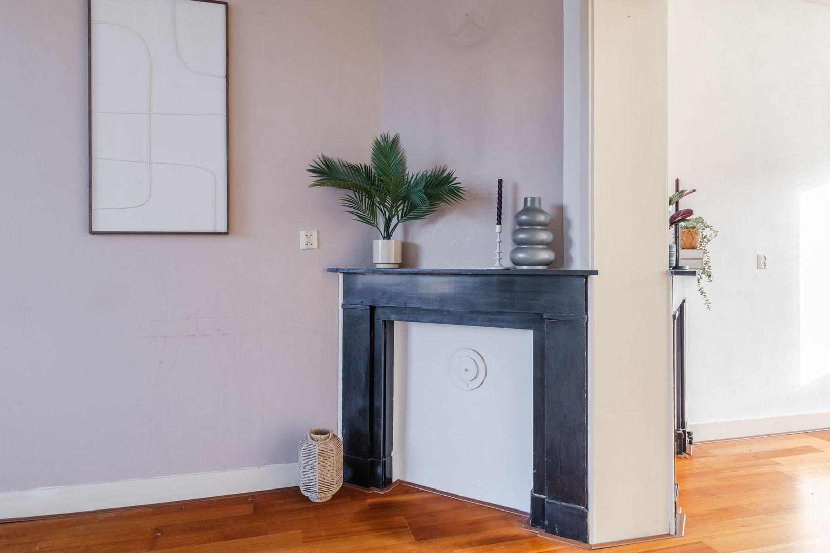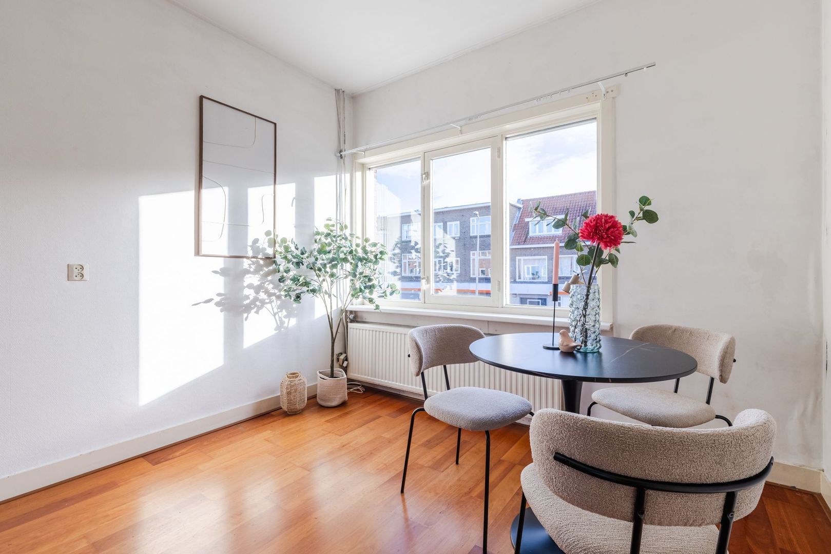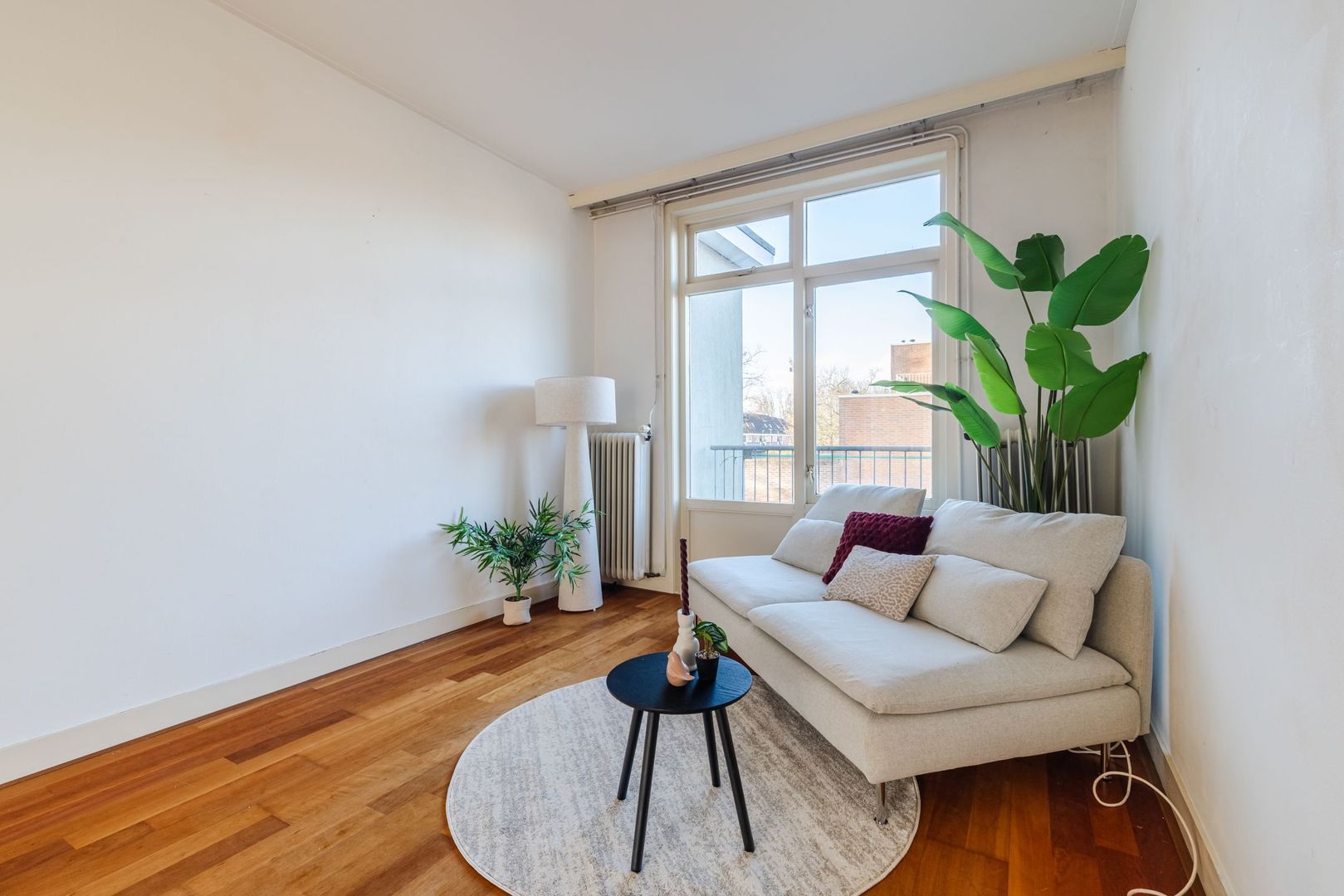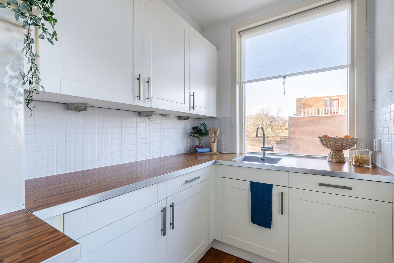 Binnen beschikt de woning over een royale, lichte woonkamer en eetkamer die door de grote raampartijen een bijzonder prettige sfeer hebben. De klassieke en-suite uitstraling – mede door de vaste inbouwkasten – geeft de ruimte karakter en biedt volop mogelijkheden voor een royale zithoek én een ruime eethoek. De gesloten keuken is netjes, praktisch ingedeeld en uitgerust met diverse inbouwapparatuur, waaronder een 4-pits gasfornuis met afzuigkap in de originele schouw (zonder mechanische afzuiging), een combi-oven, vaatwasser en koel-vriescombinatie. Vanuit de keuken stap je direct het heerlijke westelijk gelegen balkon op: ideaal voor een moment in de middag- en avondzon.