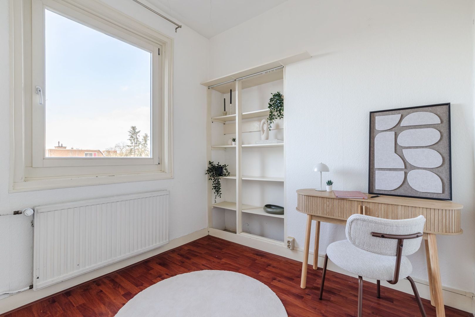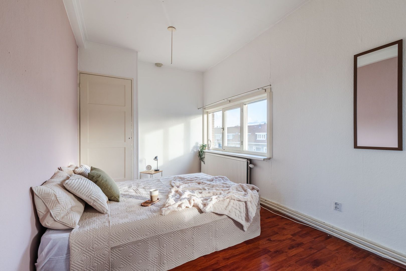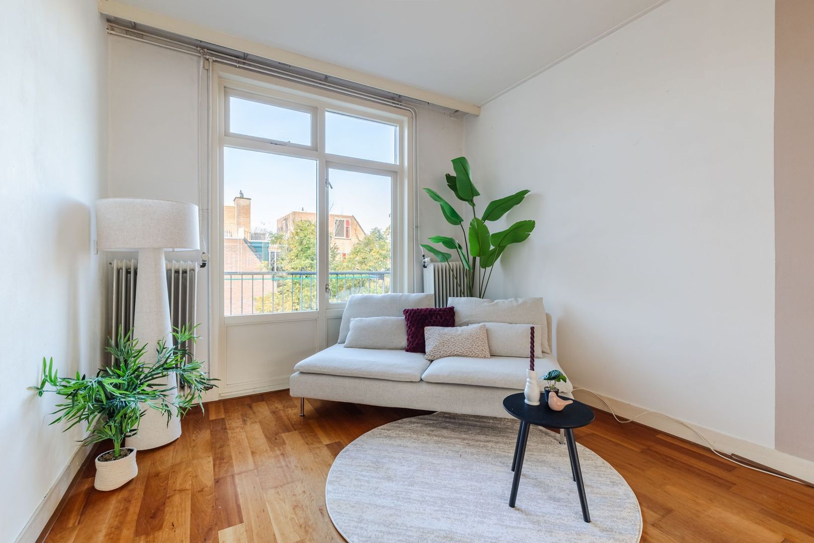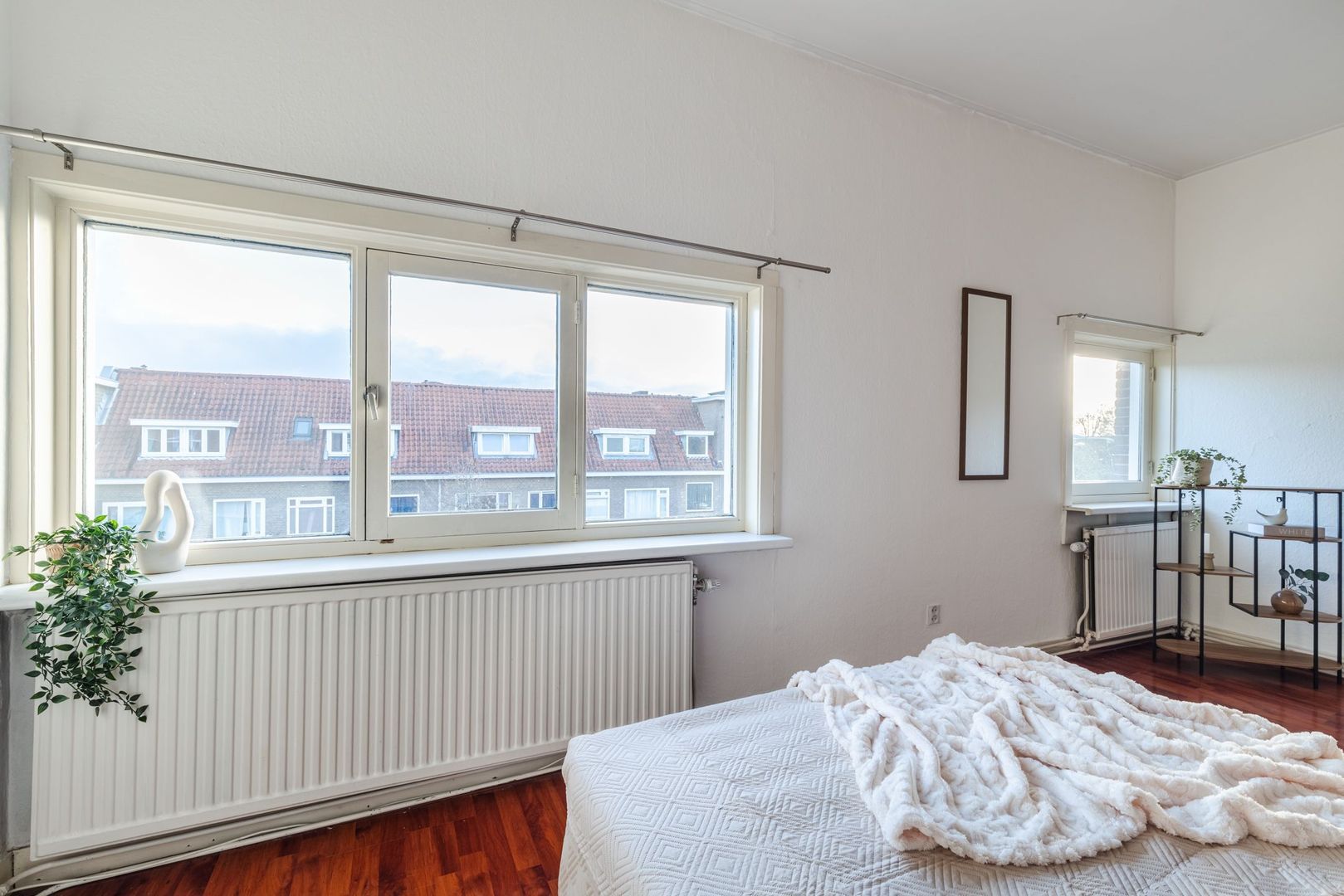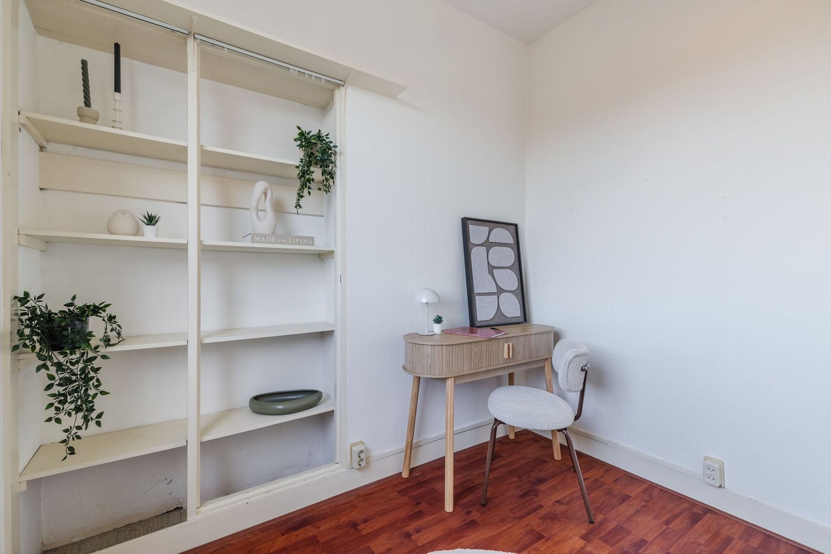 Binnen beschikt de woning over een royale, lichte woonkamer en eetkamer die door de grote raampartijen een bijzonder prettige sfeer hebben. De klassieke en-suite uitstraling – mede door de vaste inbouwkasten – geeft de ruimte karakter en biedt volop mogelijkheden voor een royale zithoek én een ruime eethoek. De gesloten keuken is netjes, praktisch ingedeeld en uitgerust met diverse inbouwapparatuur, waaronder een 4-pits gasfornuis met afzuigkap in de originele schouw (zonder mechanische afzuiging), een combi-oven, vaatwasser en koel-vriescombinatie. Vanuit de keuken stap je direct het heerlijke westelijk gelegen balkon op: ideaal voor een moment in de middag- en avondzon.