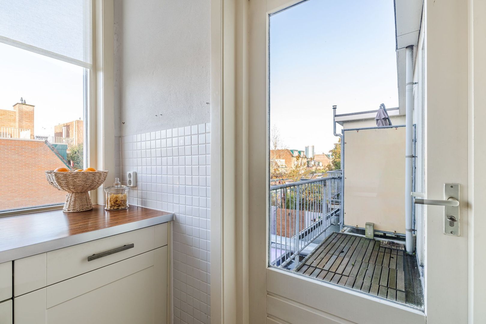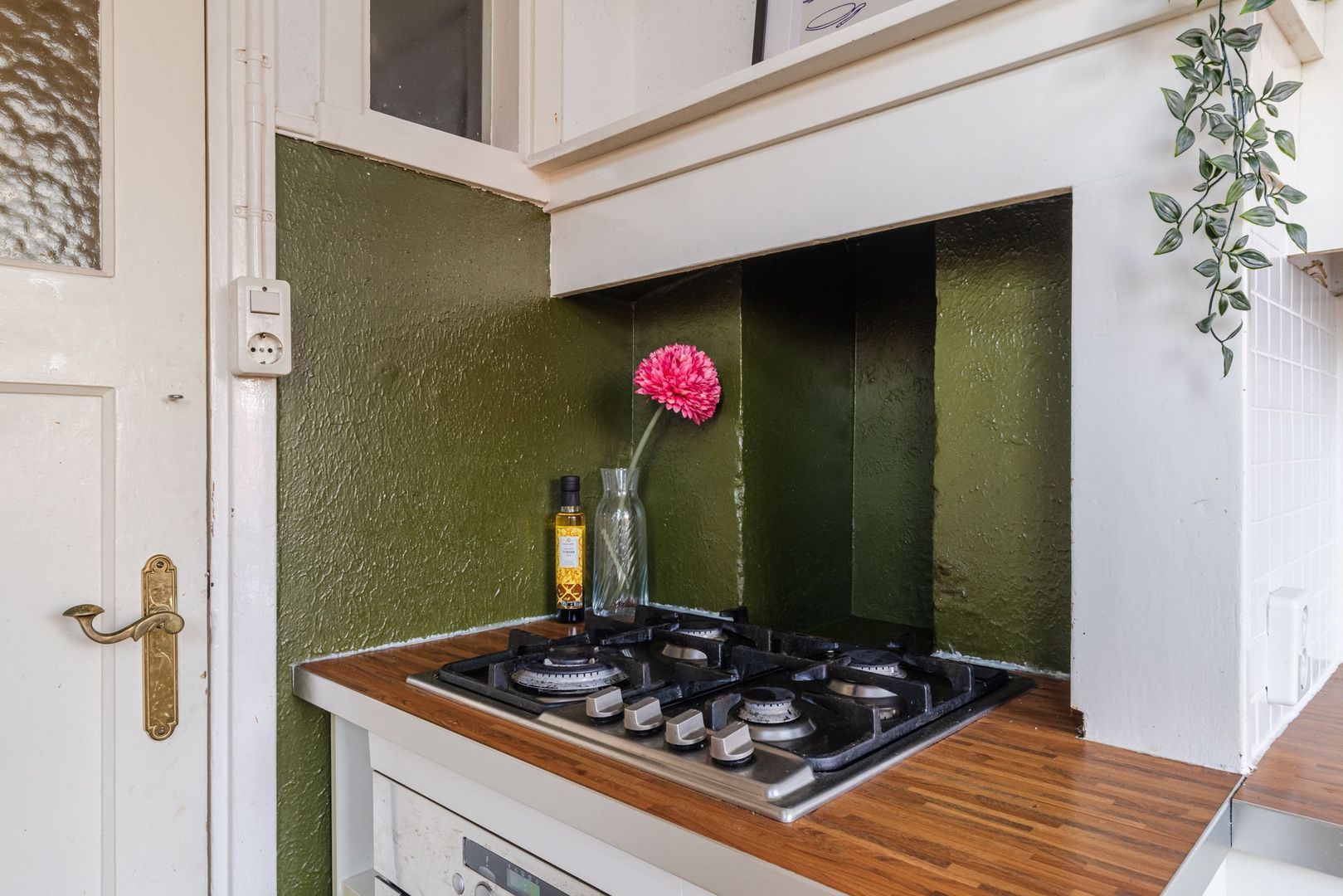 De gesloten keuken is netjes en van alle gemakken voorzien. Zo vind je hier diverse inbouwapparatuur: een 4-pits gasfornuis met afzuigkap in de originele schouw, een combi-oven, vaatwasser en koel-vriescombinatie. Vanuit de keuken heb je toegang tot het eerste balkon, gelegen op het westen.