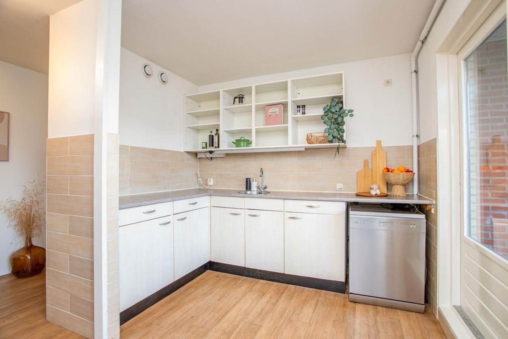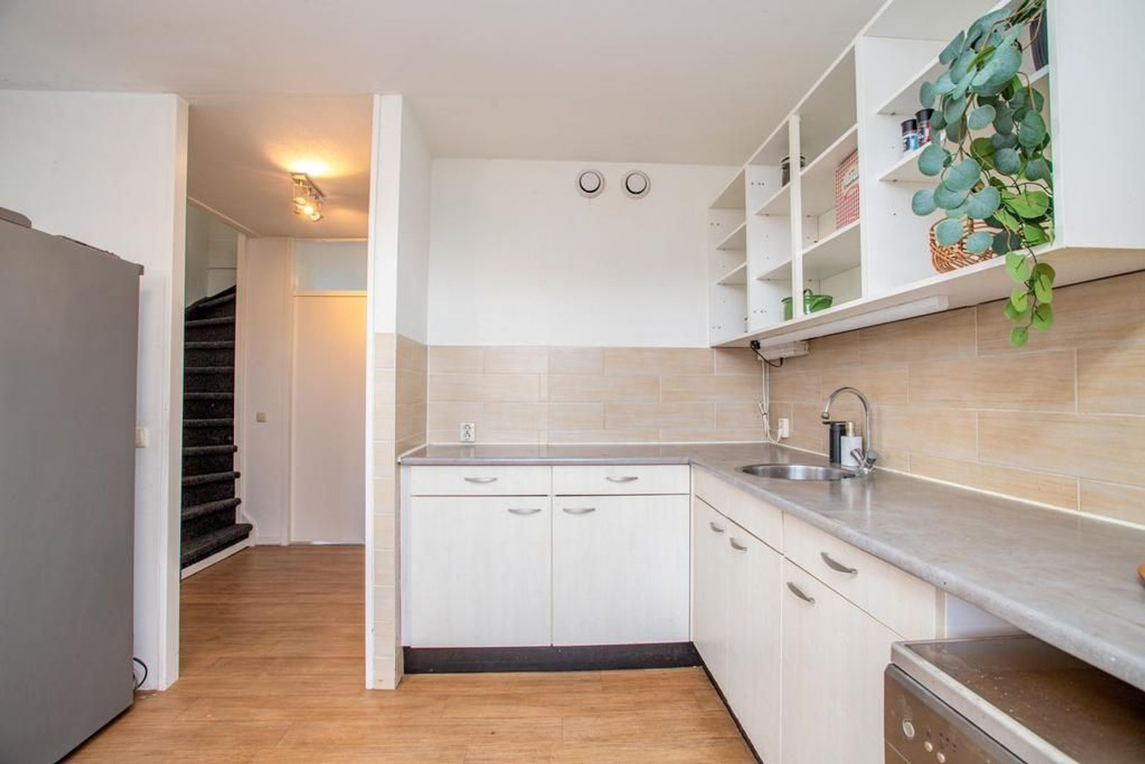 Je betreedt de maisonnette via de eigen trapopgang aan de buitenzijde van het pand. Bij binnenkomst in de woning kom je in de hal, die toegang biedt tot de woonkamer, de keuken, het toilet, de meterkast en de trapopgang. De ruime en lichte woonkamer biedt de perfecte gelegenheid om een sfeervolle zithoek te creëren. Het aansluitende balkon, ideaal gelegen op het zuidwesten, is een heerlijke buitenruimte om te genieten van de frisse lucht en de zon. De ruime keuken met hoekopstelling biedt veel opbergruimte en geeft toegang tot de loggia; deze ruime, overdekte buitenruimte is een prettige tweede buitenruimte waar je droog kunt zitten.