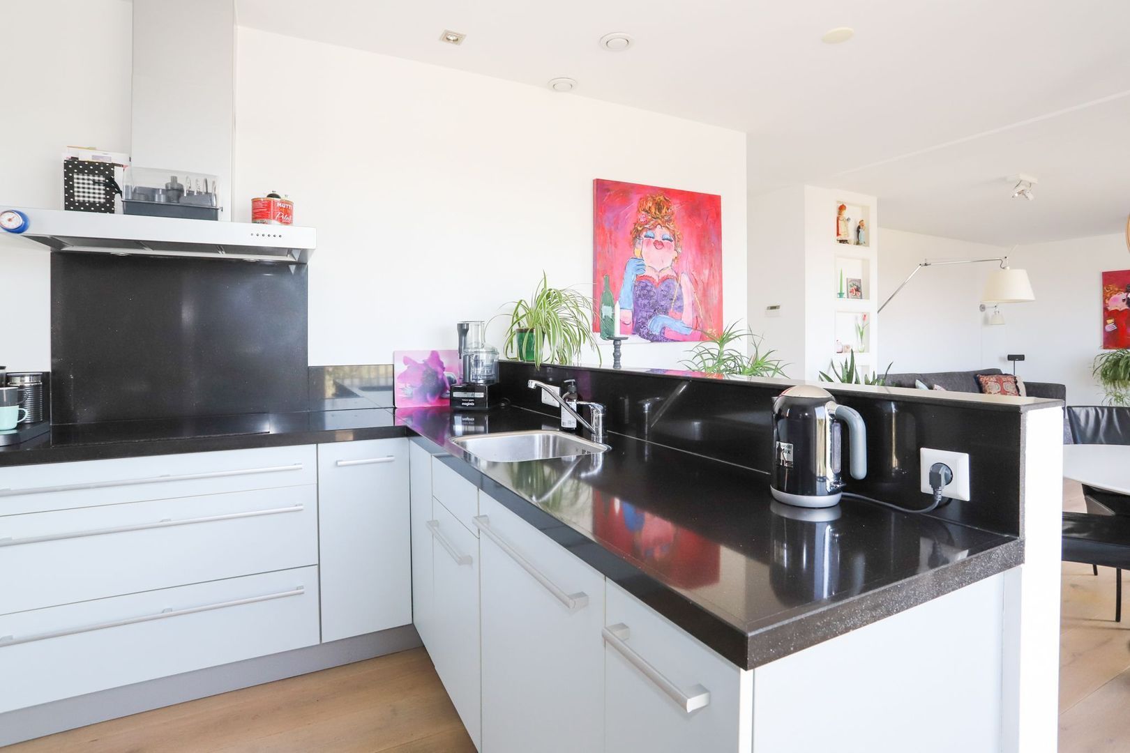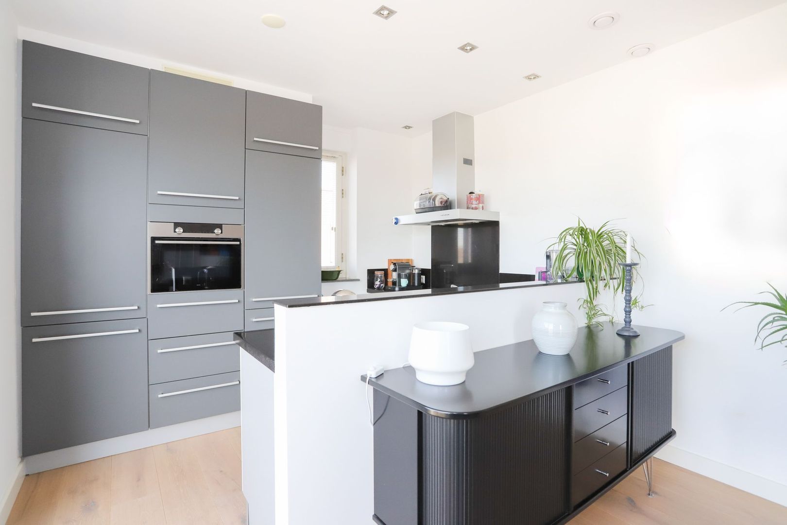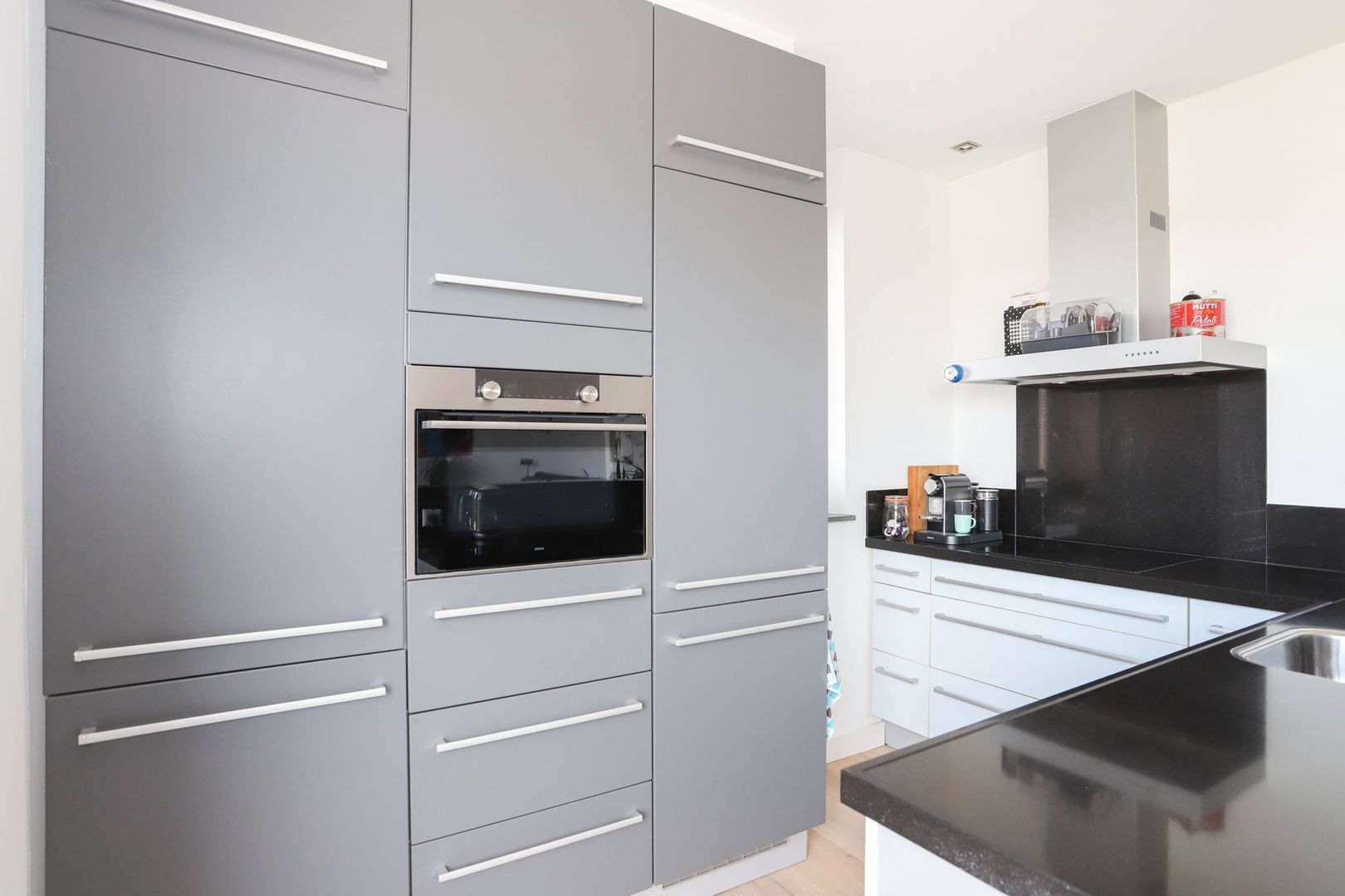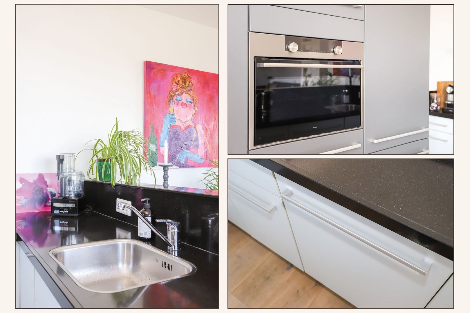 De open keuken is in een hoekopstelling uitgevoerd met witte lades, een donker blad en een strakke wandkast met inbouwapparatuur, waaronder een combimagnetron, koelkast, vriezer, 4-pitsinductiekookplaat, afzuigkap en een vaatwasser.