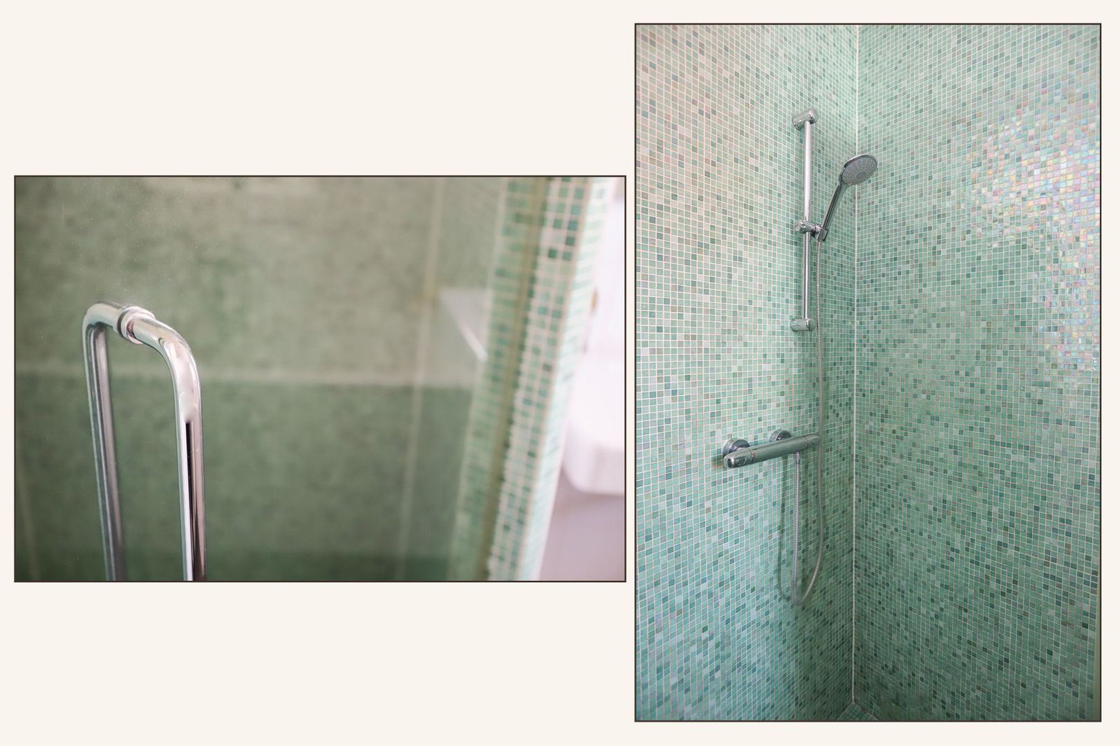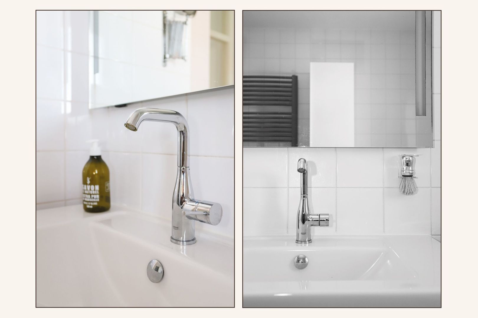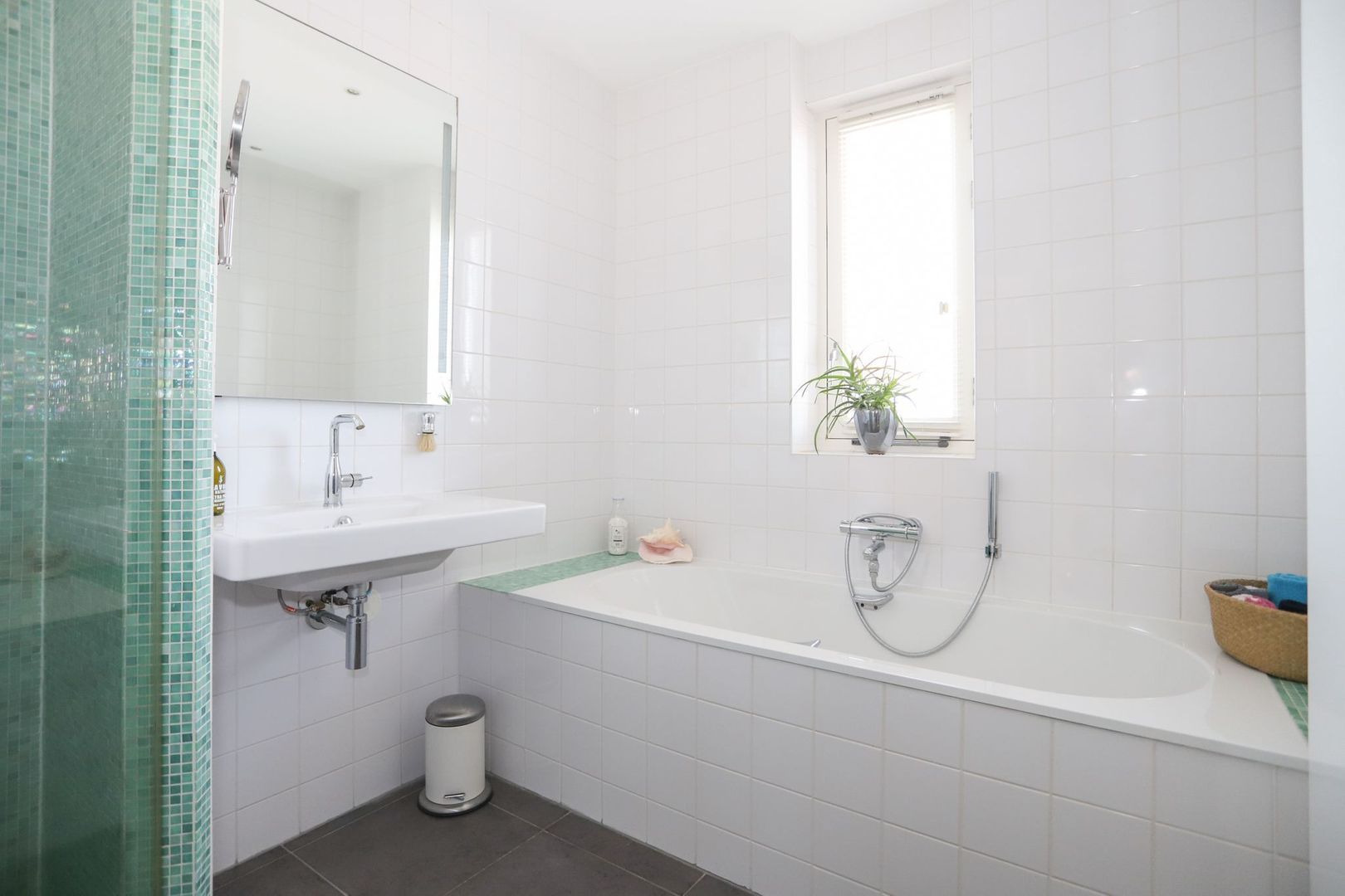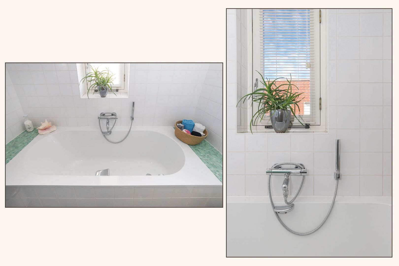 Zowel de badkamer als het separaat toilet zijn voorzien van fris, modern tegelwerk. Daarnaast heeft de badkamer zowel een douchecabine als een ligbad, en een nette wastafel.