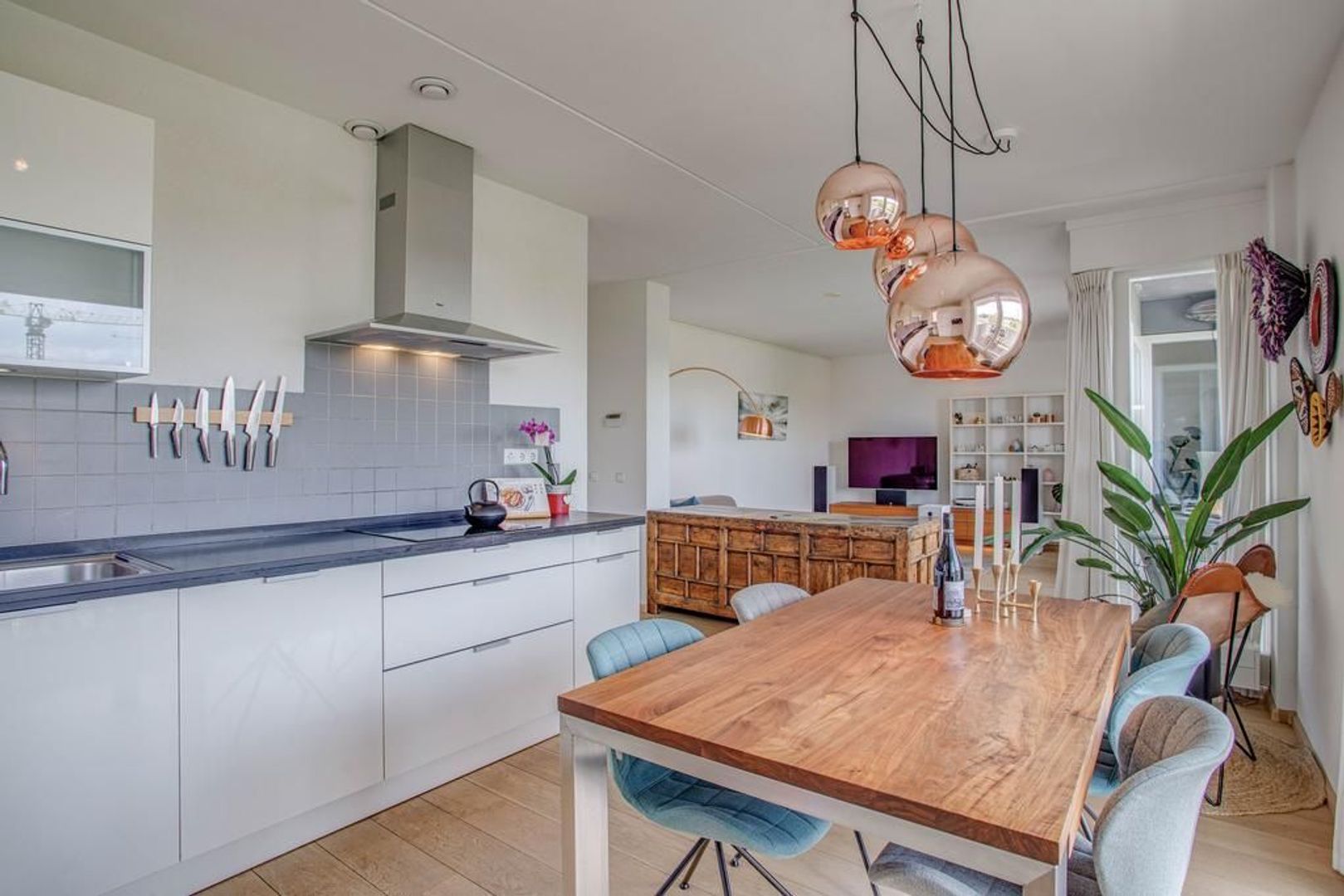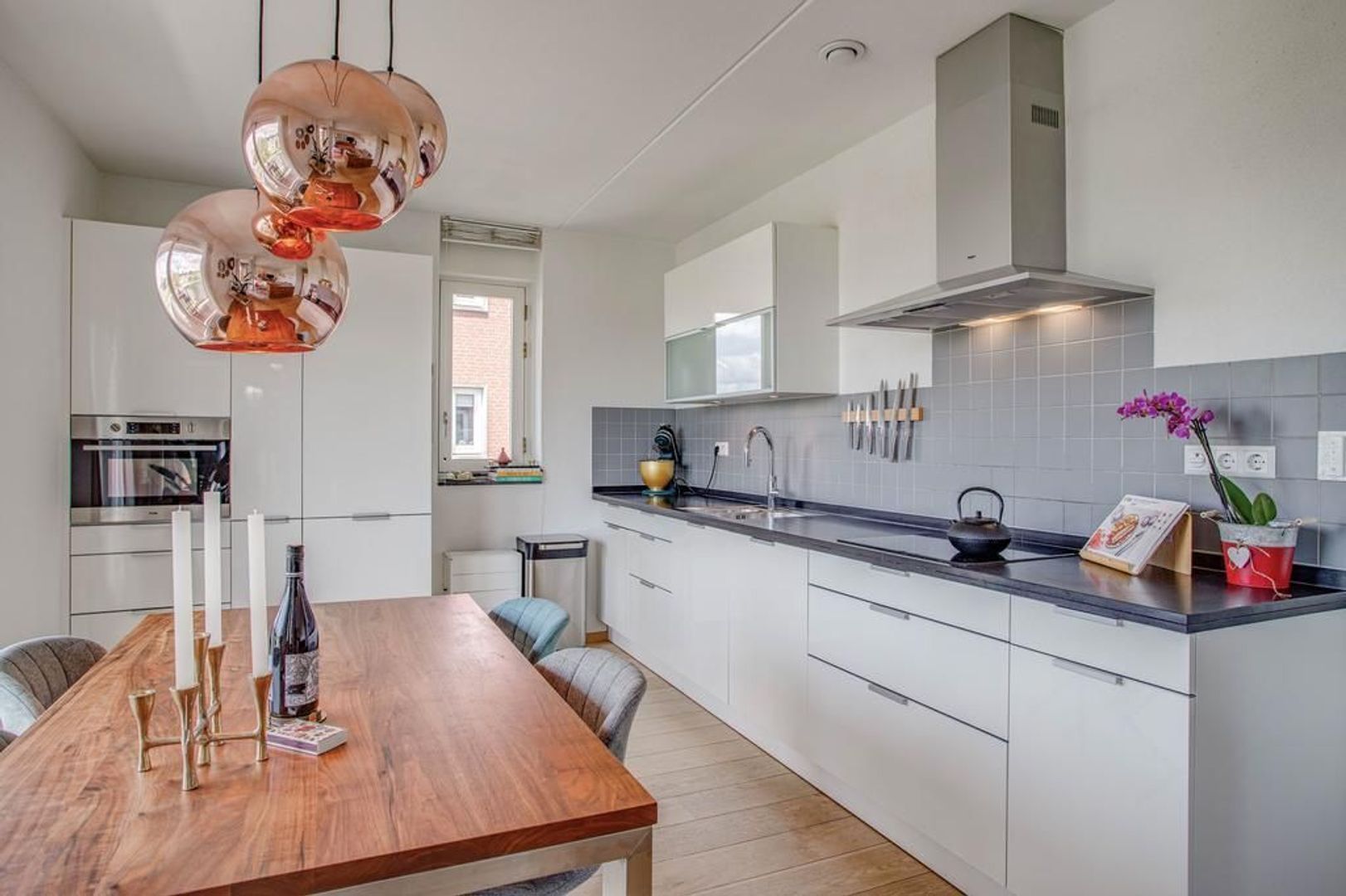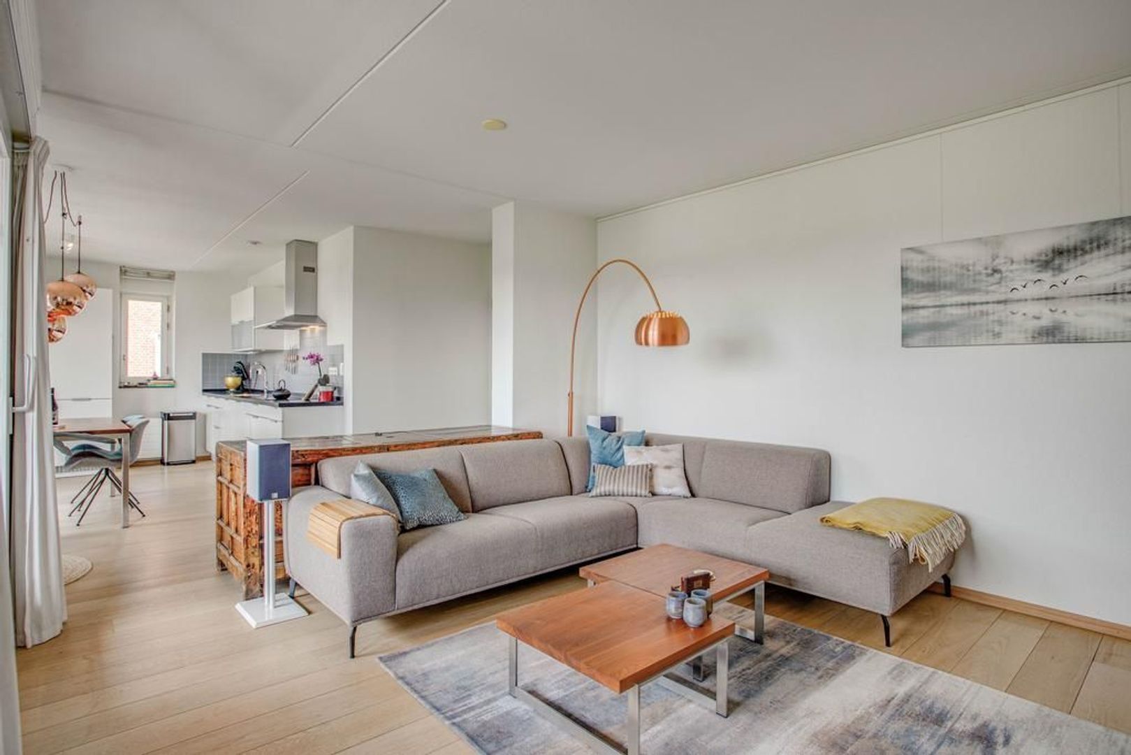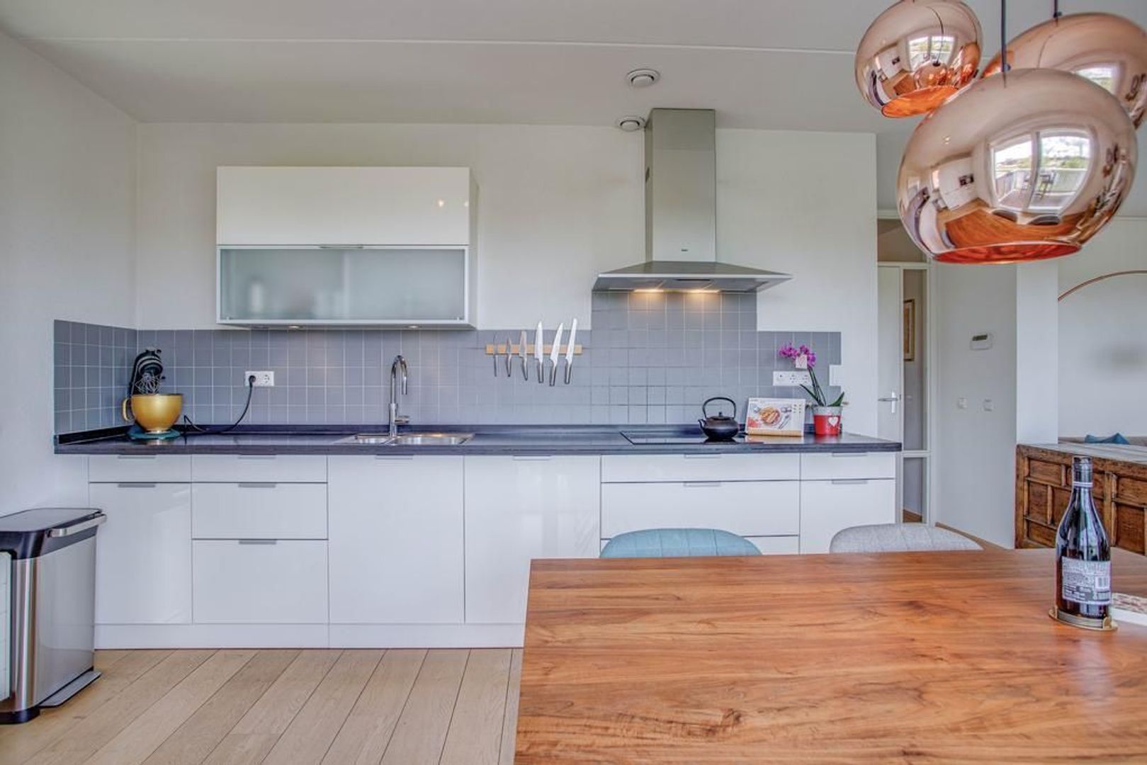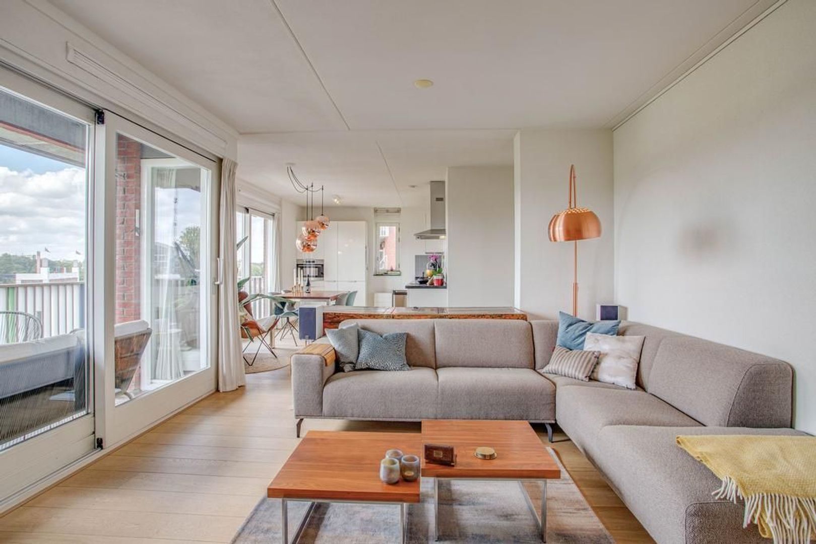 Bij binnenkomst op de vierde verdieping kom je in een ruime hal met videofooninstallatie, een berging met witgoedaansluiting en een separaat toilet. Via de hal bereik je de sfeervolle woonkamer met een prachtige goed onderhouden houten vloer. De woonkamer is ruim opgezet en laat diverse inrichtingsmogelijkheden open. Dankzij de aanwezigheid van de grote raampartijen heb je fijn lichtinval met een uniek uitzicht op het Merwede-kanaal. Aan de woonkamer grenst de open keuken met eetkamer ideaal om te tafelen met vrienden en familie. De keuken heeft een moderne uitstraling en is voorzien van de volgende inbouwapparatuur: inductiekookplaat, afzuigkap, combi-oven, vaatwasser, koelkast, vriezer en Quooker kraan.