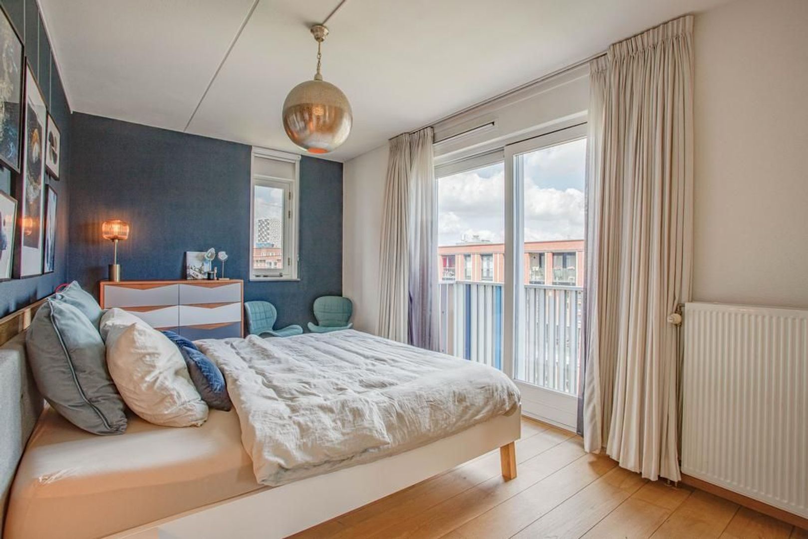 Het appartement beschikt over 2 slaapkamers. De eerste slaapkamer is aan de voorzijde van de woning gelegen en kenmerkt zich door de ruime opzet. In deze slaapkamer is voldoende ruimte voor het plaatsen van een groot tweepersoonsbed. Deze slaapkamer heeft een grote inbouwkast over de volledige breedte van de kamer. Daarnaast is de kamer voorzien van een frans balkon met ligging op het noordoosten. De tweede slaapkamer heeft een fijn formaat en is tussen de woonkamer en de badkamer in gelegen ideaal als tweede slaapkamer of een kantoor. Beide slaapkamers zijn hoogwaardig afgewerkt en zijn door de goede isolatie fijn van temperatuur in de zomer en in de winter. De badkamer is goed onderhouden en is voorzien van een ligbad, douche en een wastafel met wastafelmeubel.