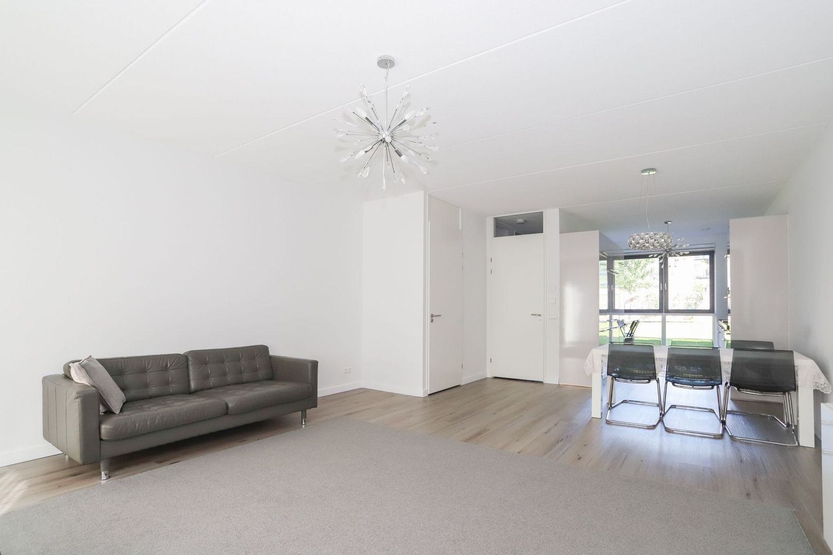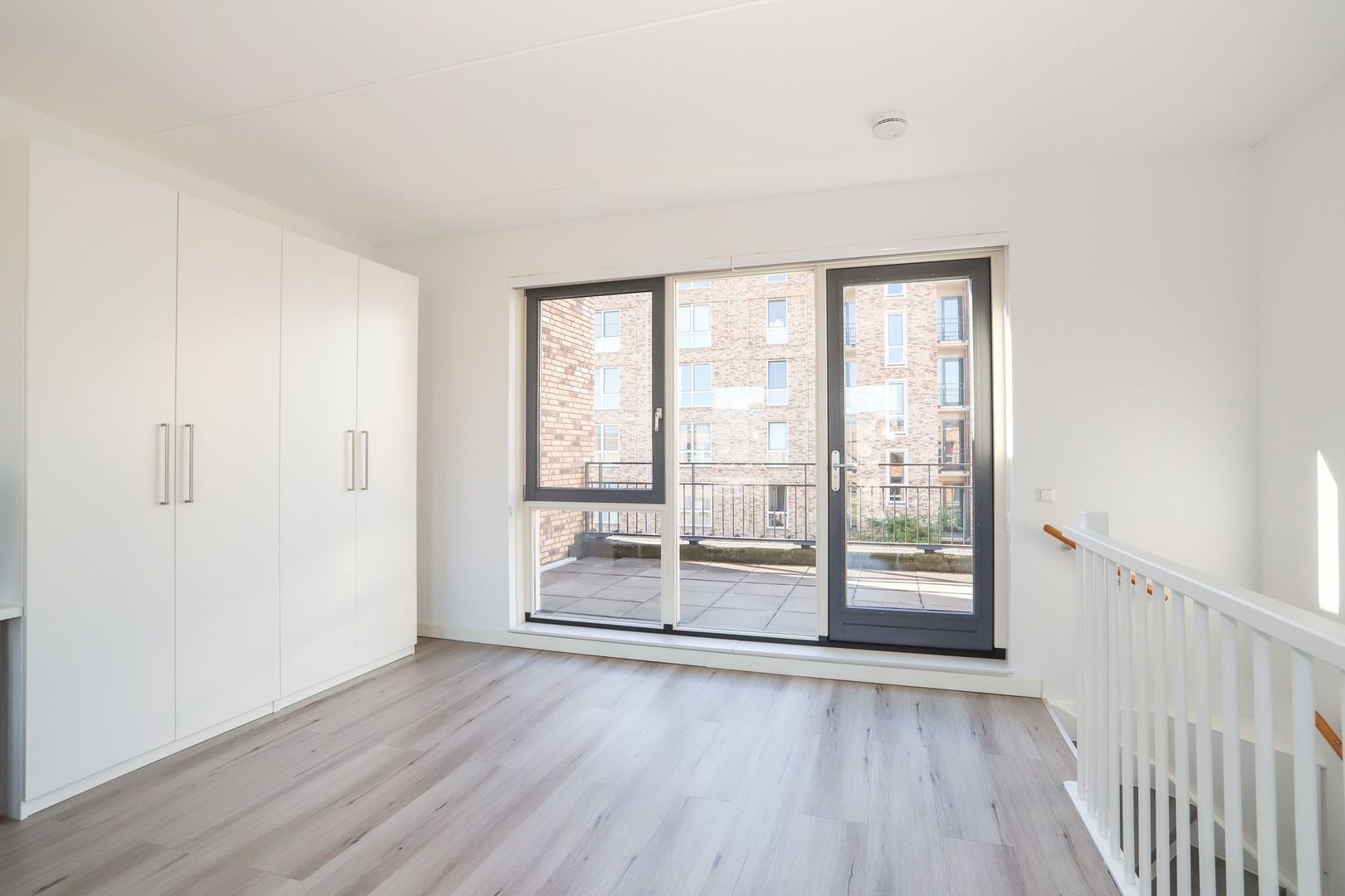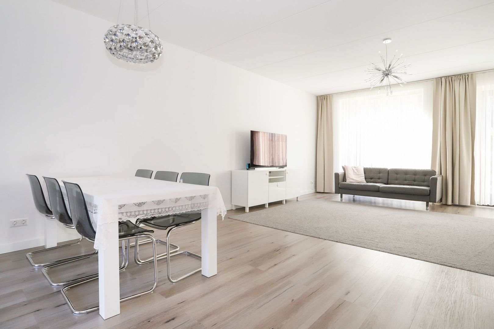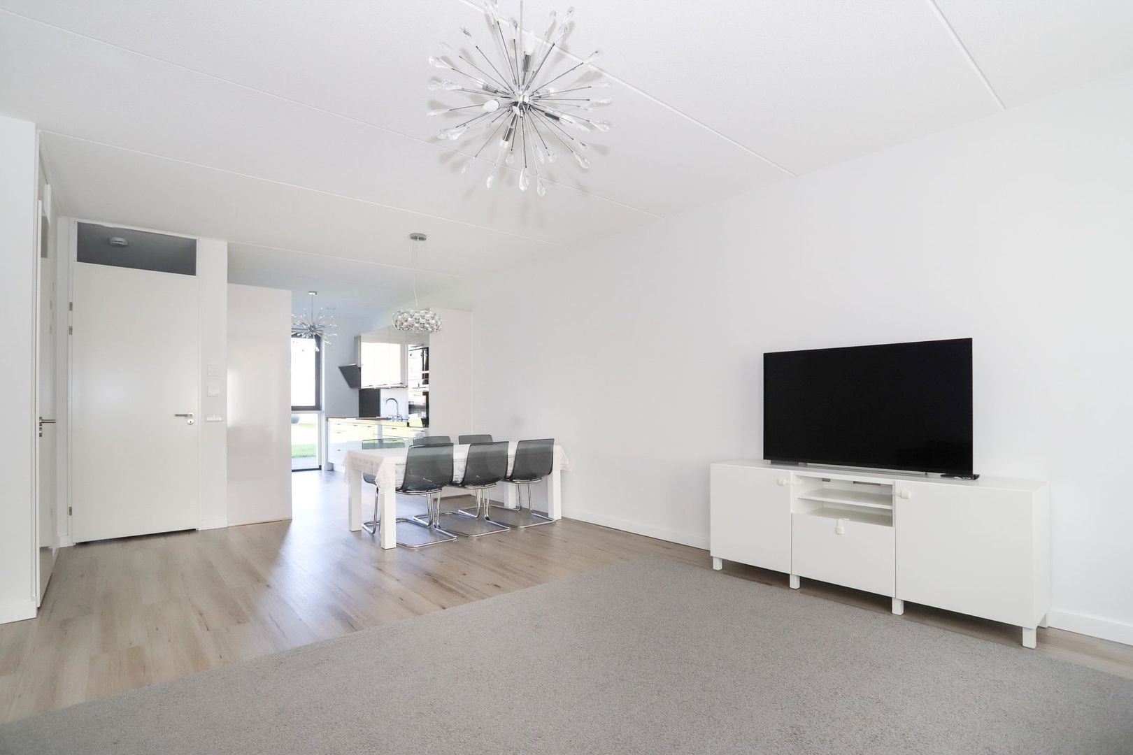 De woon-en eetkamer zijn heerlijk licht door de grote raampartijen aan zowel de voor als achterzijde van de woning. De wanden en het plafond zijn strak gestukt en er ligt een nette PVC vloer in. De woon-en eetkamer zijn praktisch in te delen met aan de voorzijde van de woning de moderne witte keuken met hoge kastenwand en een bar. De keuken is uitgevoerd met inbouwapparatuur zoals een inductiekookplaat, afzuigkap, oven, magnetron, koelkast en een vaatwasser. Verder is hier voldoende opbergruimte aanwezig.