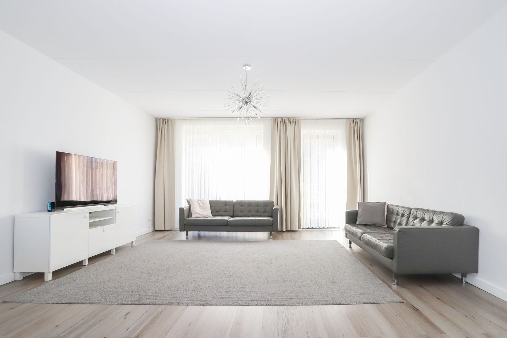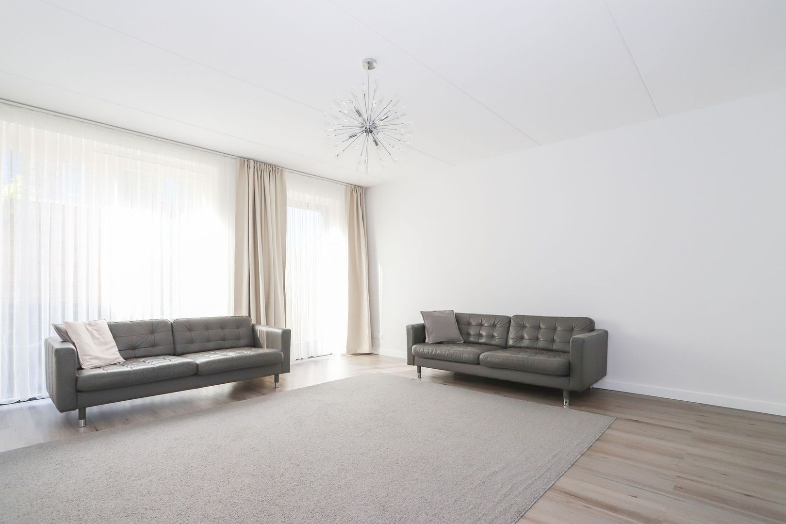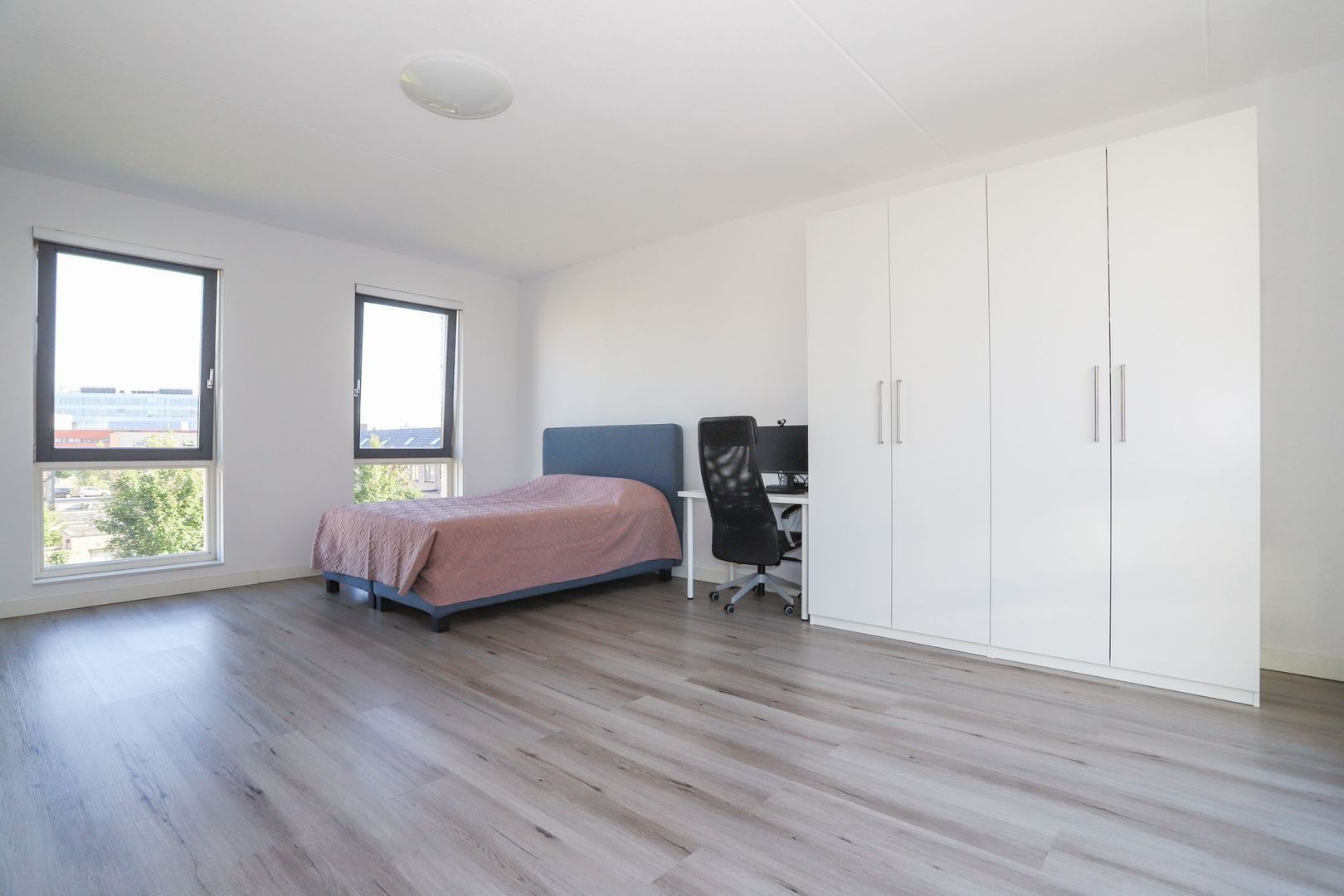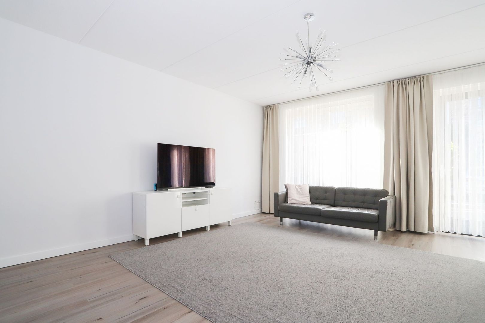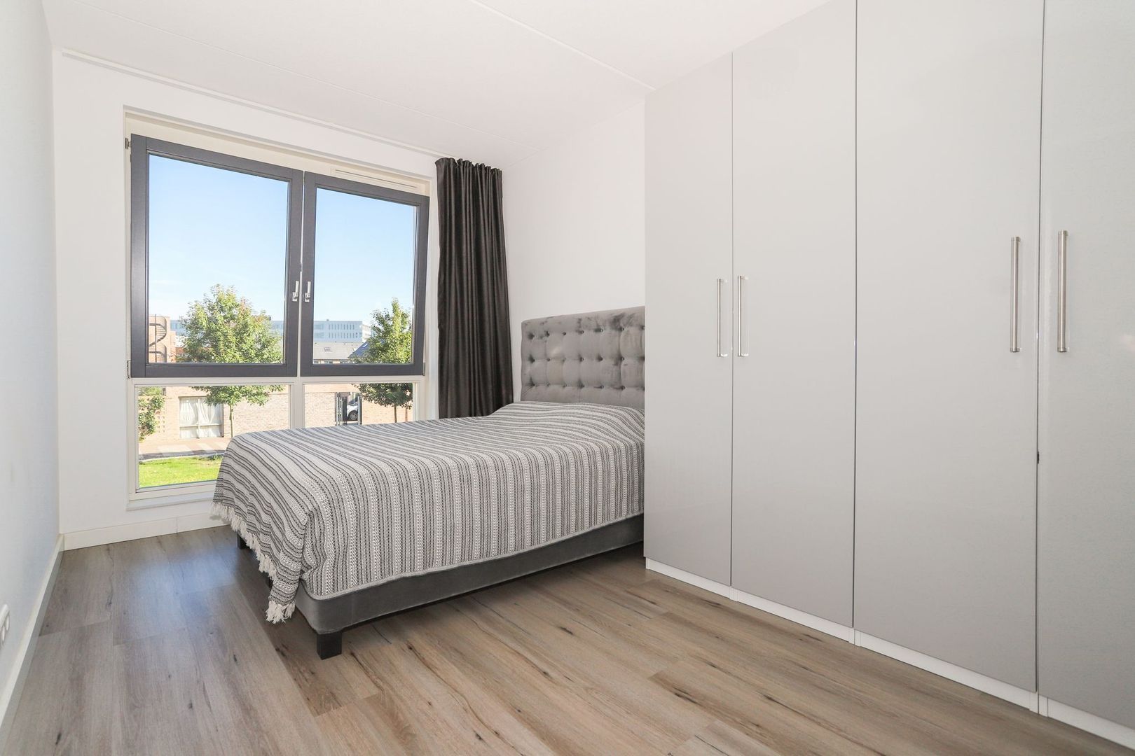 De woon-en eetkamer zijn heerlijk licht door de grote raampartijen aan zowel de voor als achterzijde van de woning. De wanden en het plafond zijn strak gestukt en er ligt een nette PVC vloer in. De woon-en eetkamer zijn praktisch in te delen met aan de voorzijde van de woning de moderne witte keuken met hoge kastenwand en een bar. De keuken is uitgevoerd met inbouwapparatuur zoals een inductiekookplaat, afzuigkap, oven, magnetron, koelkast en een vaatwasser. Verder is hier voldoende opbergruimte aanwezig.