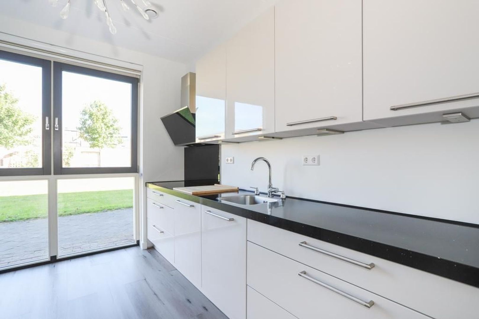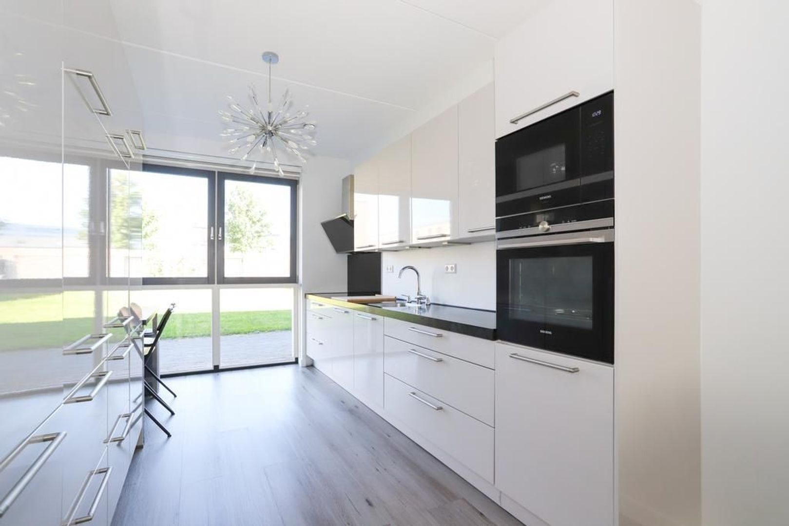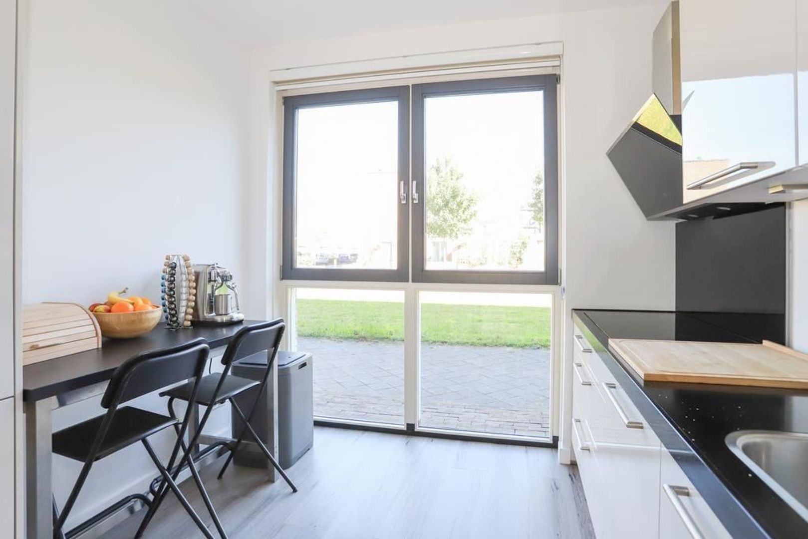 De woon-en eetkamer zijn heerlijk licht door de grote raampartijen aan zowel de voor als achterzijde van de woning. De wanden en het plafond zijn strak gestukt en er ligt een nette PVC vloer in. De woon-en eetkamer zijn praktisch in te delen met aan de voorzijde van de woning de moderne witte keuken met hoge kastenwand en een bar. De keuken is uitgevoerd met inbouwapparatuur zoals een inductiekookplaat, afzuigkap, oven, magnetron, koelkast en een vaatwasser. Verder is hier voldoende opbergruimte aanwezig.