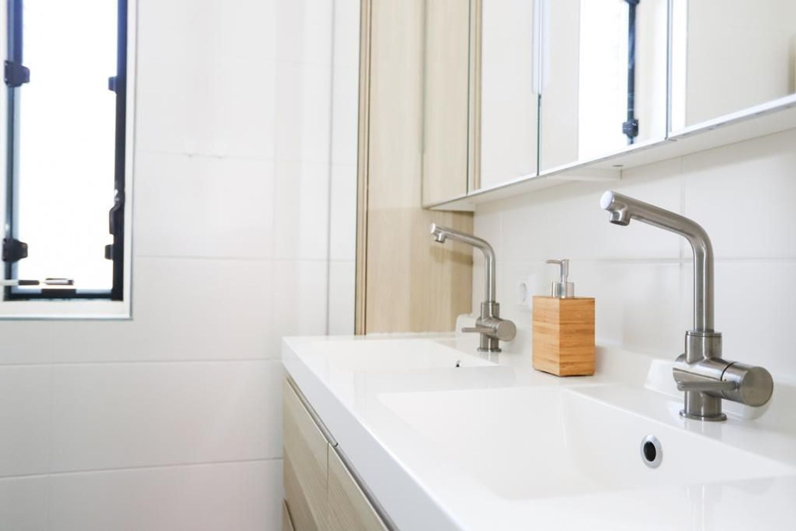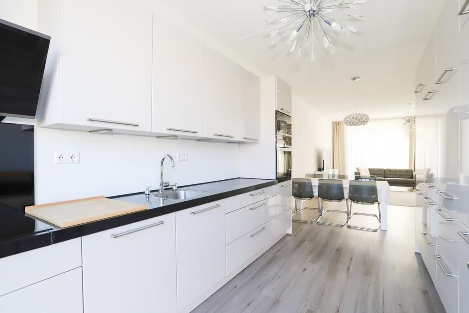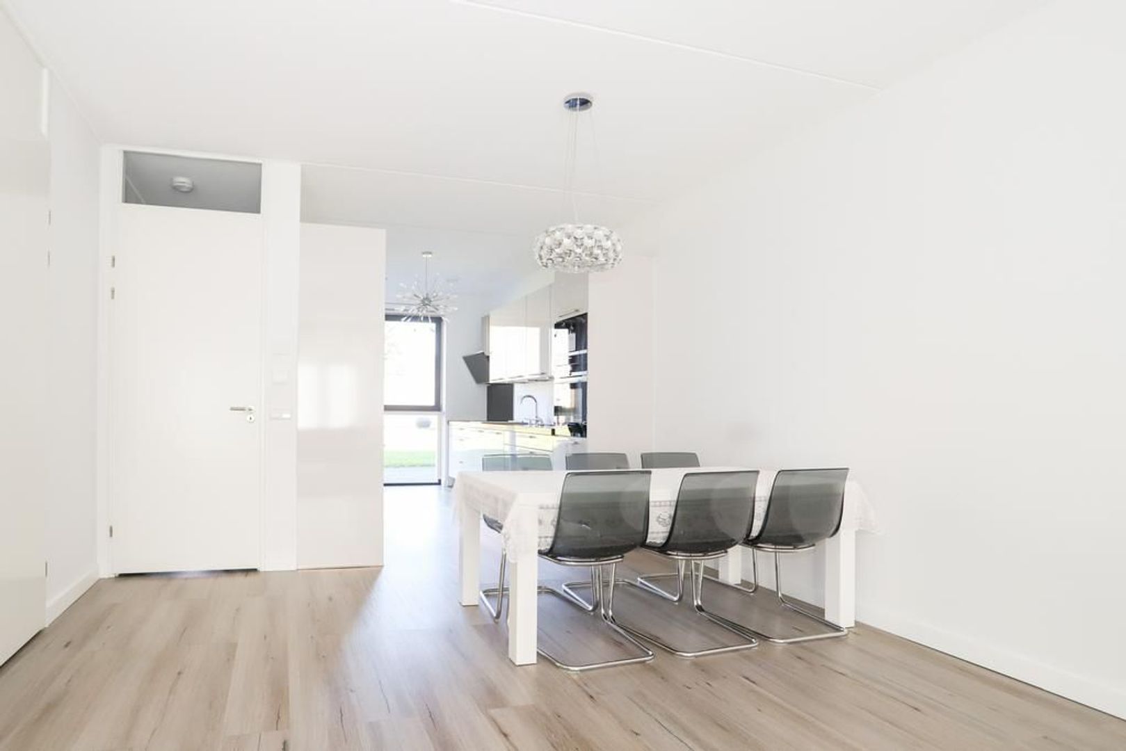 De woon-en eetkamer zijn heerlijk licht door de grote raampartijen aan zowel de voor als achterzijde van de woning. De wanden en het plafond zijn strak gestukt en er ligt een nette PVC vloer in. De woon-en eetkamer zijn praktisch in te delen met aan de voorzijde van de woning de moderne witte keuken met hoge kastenwand en een bar. De keuken is uitgevoerd met inbouwapparatuur zoals een inductiekookplaat, afzuigkap, oven, magnetron, koelkast en een vaatwasser. Verder is hier voldoende opbergruimte aanwezig.