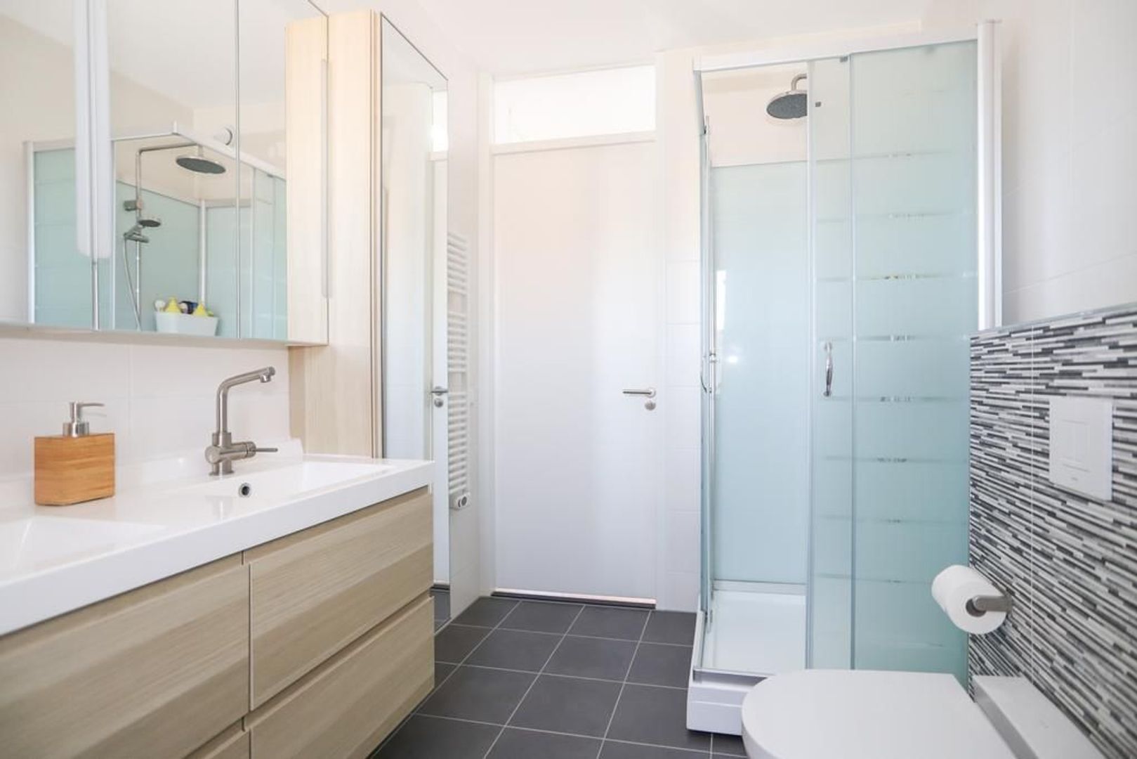 Eerste verdieping: Overloop. Op deze verdieping zijn er drie slaapkamers van ruim formaat gesitueerd. Ze zijn alle licht en goed onderhouden. De moderne badkamer is uitgevoerd met vloerverwarming en is voorzien van een inloopdouche, dubbele wastafel met meubel en een tweede toilet.