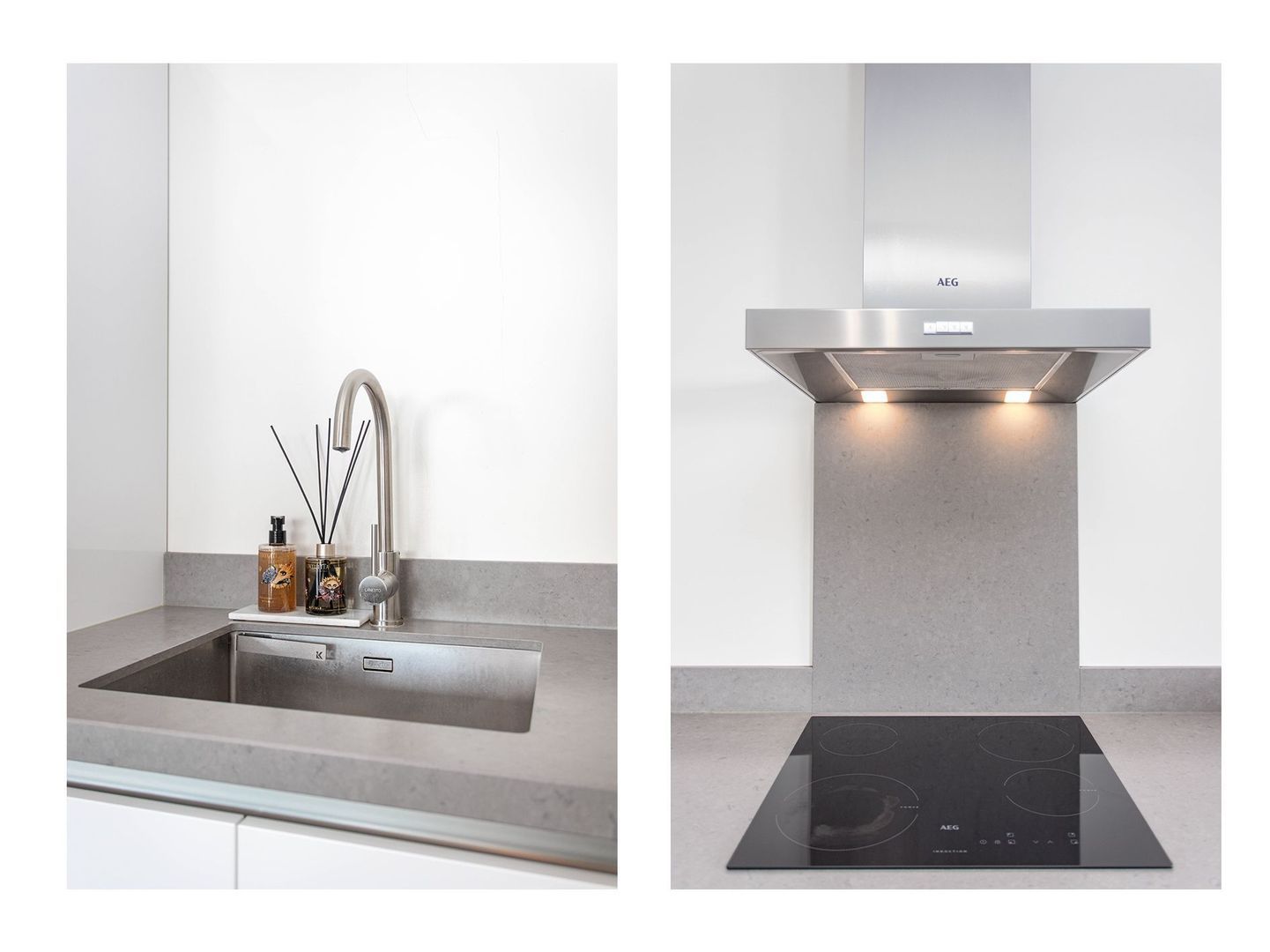 Vanuit de woonkamer is de verrassend ruime woonkeuken bereikbaar, voorzien van een kastenwand, opgesteld in een L-vorm die elke kookliefhebber zal bekoren. Naast de royale werkruimte is alle gewenste apparatuur aanwezig, waaronder een inductiekookplaat.