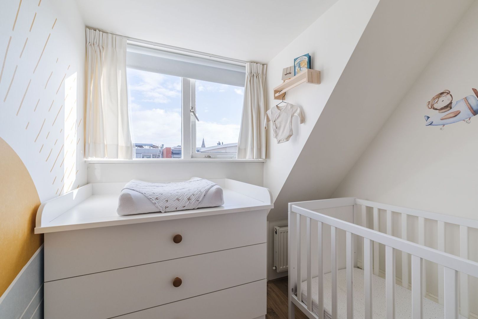 Deze verdieping biedt een overloop met vaste trap naar de derde verdieping, twee kamers aan de voorzijde met dakkapel en een ruime slaapkamer aan de achterzijde. De slaapkamer aan de voorzijde fungeert als royale logeerkamer en kantoor. De tweede kamer aan de voorzijde is momenteel in gebruik als babykamer, maar kun je ook als kantoor inrichten. Aan de achterzijde bevindt zich een slaapkamer met uitzicht op het dakterras. Deze biedt voldoende ruimte voor een groot tweepersoonsbed en een garderobekast.