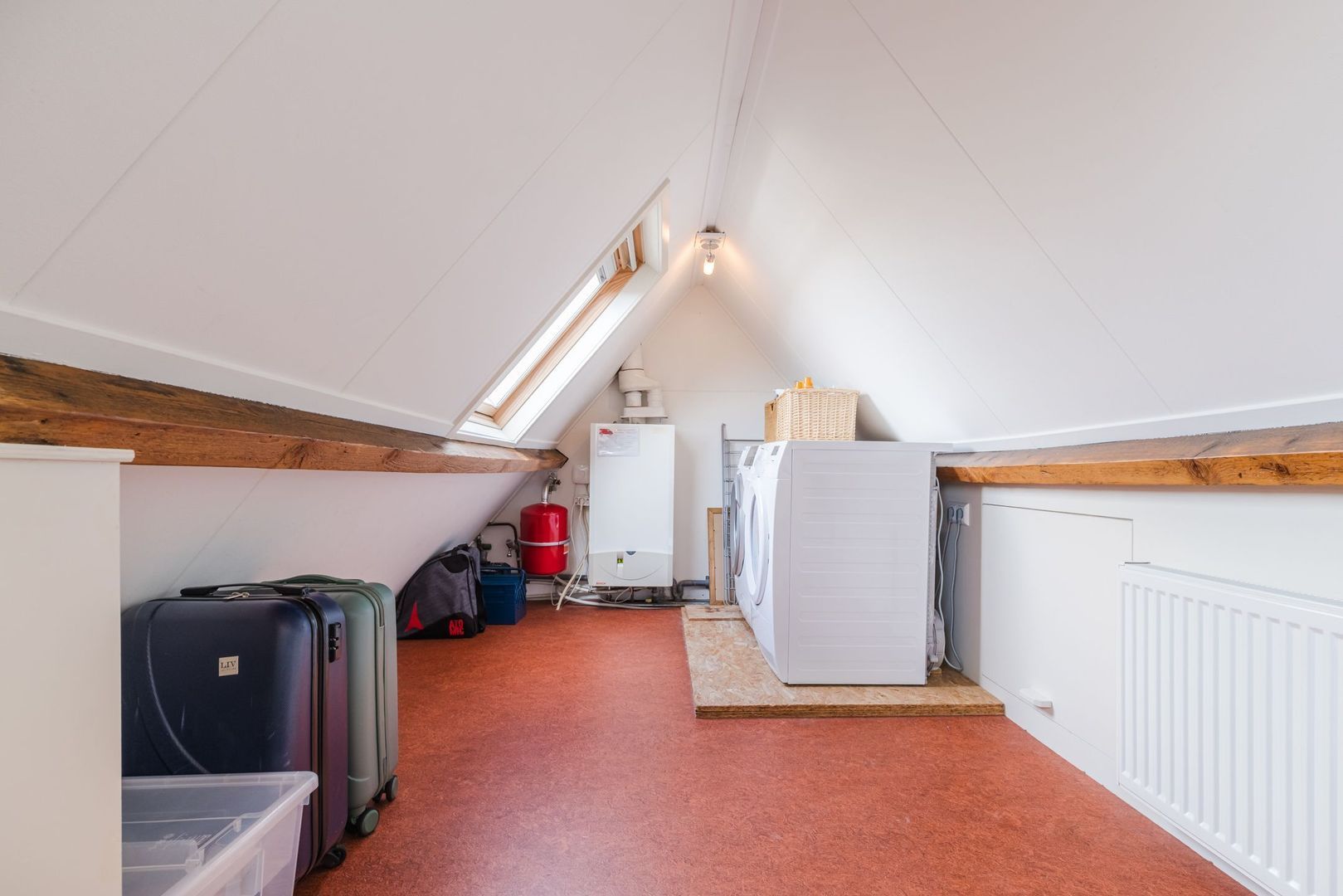 De zolderverdieping is bereikbaar via een vaste trap en deze extra kamer biedt ruimte voor bergruimte, de opstelplaats van de cv-installatie en de wasmachine.