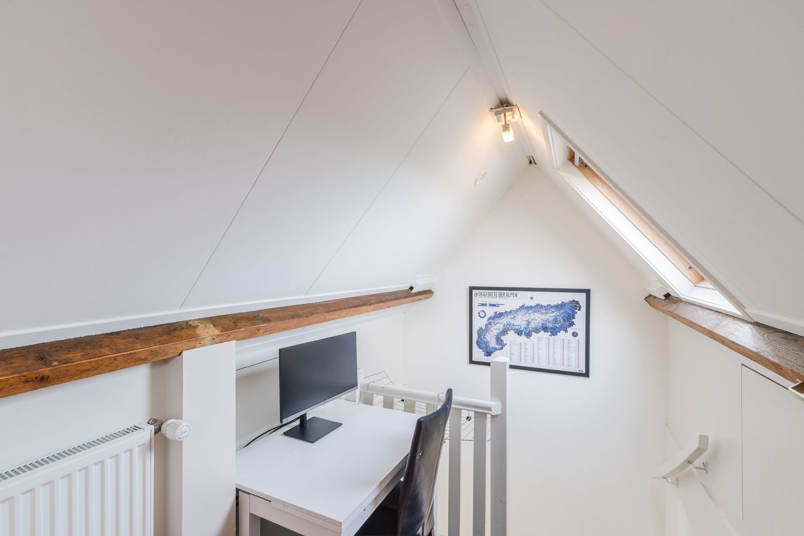 Op de zolderverdieping bevindt zich een overloop met werkruimte, veel bergruimte, de wasmachine- en drogeraansluiting en de cv-opstelling. Twee Velux-dakramen zorgen voor een lichte en prettige werk- en opbergruimte.