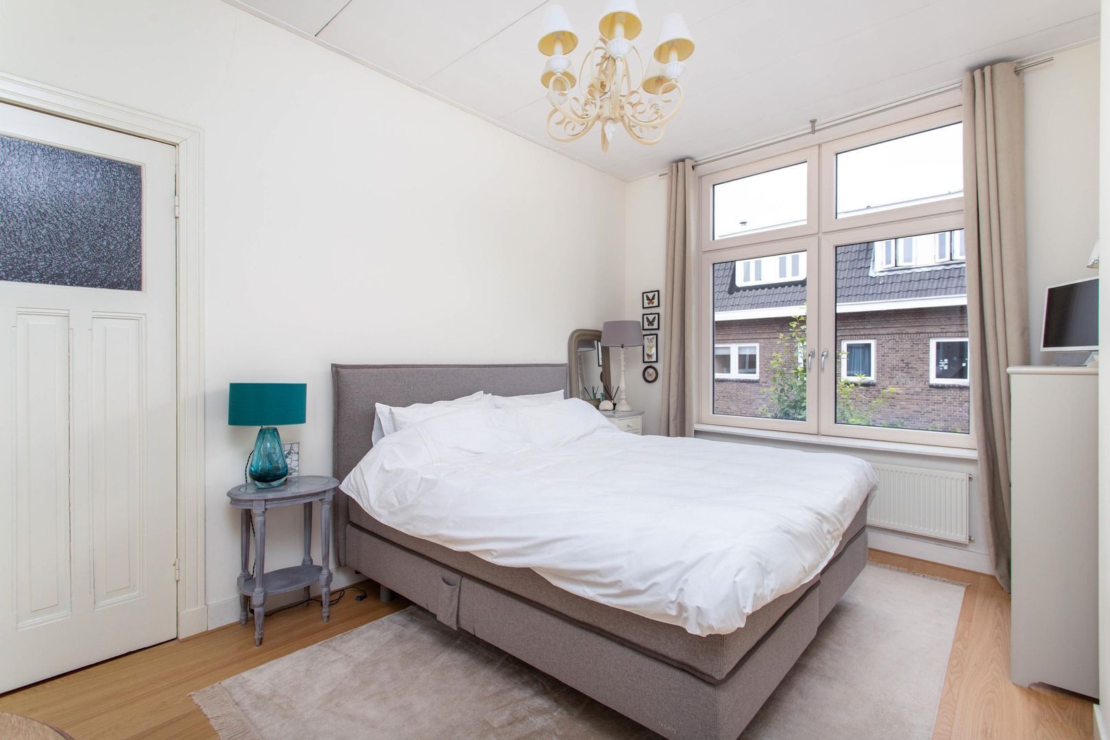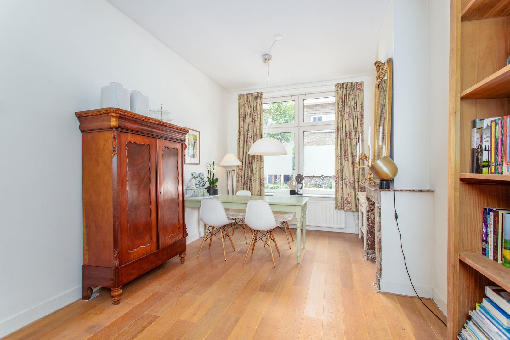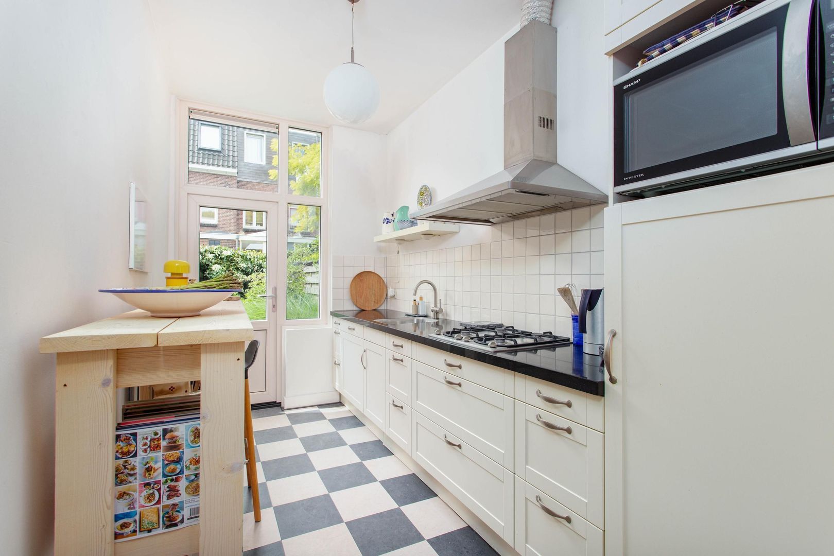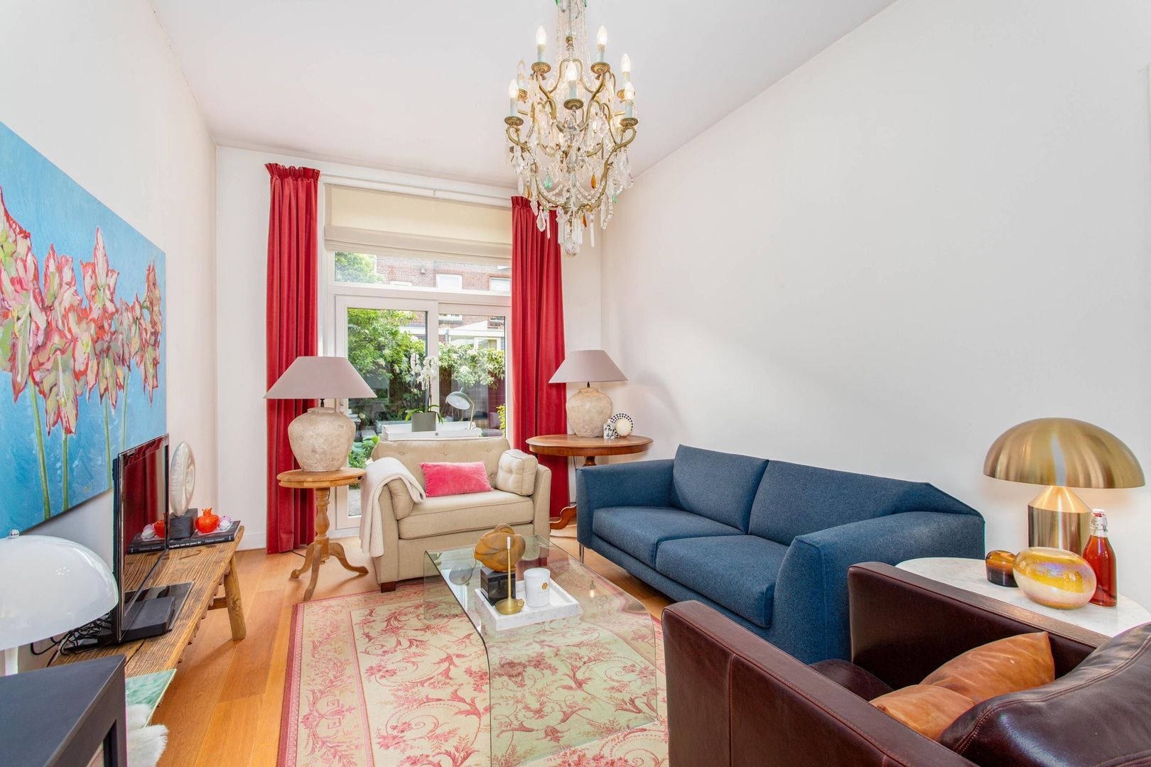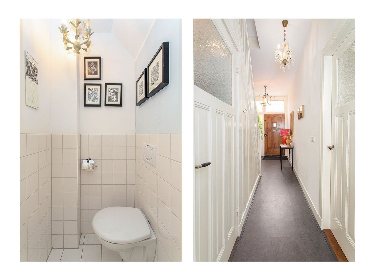 Je betreedt de woning via de karakteristieke voordeur, waarna je in de hal aankomt. Deze hal biedt toegang tot de woonkamer, de keuken, het toilet en de trapopgang. De woonkamer heeft een prettige indeling met aan de voorzijde ruimte voor een lange eettafel en aan de achterzijde een gezellige zithoek. De marmeren schouw, houten lamelparket vloer en de drie meter hoge plafonds geven de ruimte een sfeervol gevoel. De nette keuken is voorzien van een zwart composiet blad, witte kasten en zilveren details en beschikt over de volgende inbouwapparatuur: een koelkast met vriesvak, een 4-pits gasfornuis met afzuigkap en een vaatwasser. Zowel via de woonkamer als de keuken is de achtertuin bereikbaar. De achtertuin heeft een topligging op het zonnige zuidwesten en is door al het groen en de speelse indeling een heerlijke plek om van de buitenlucht te genieten.
