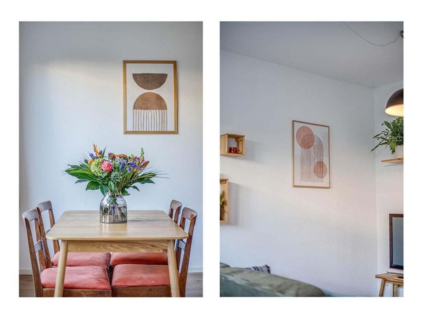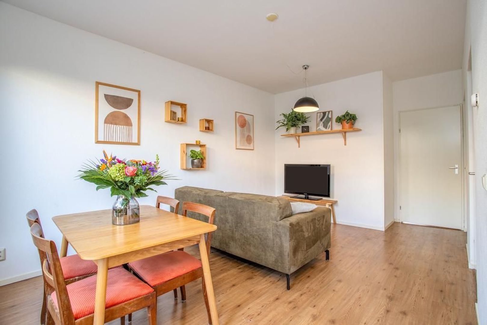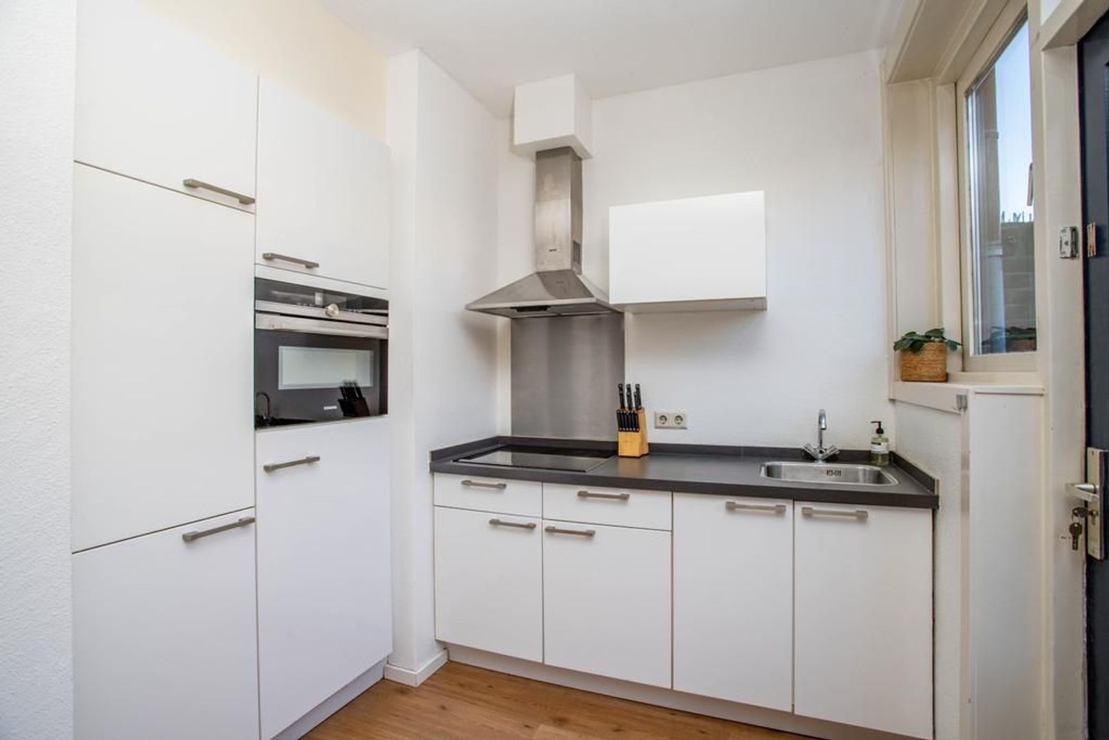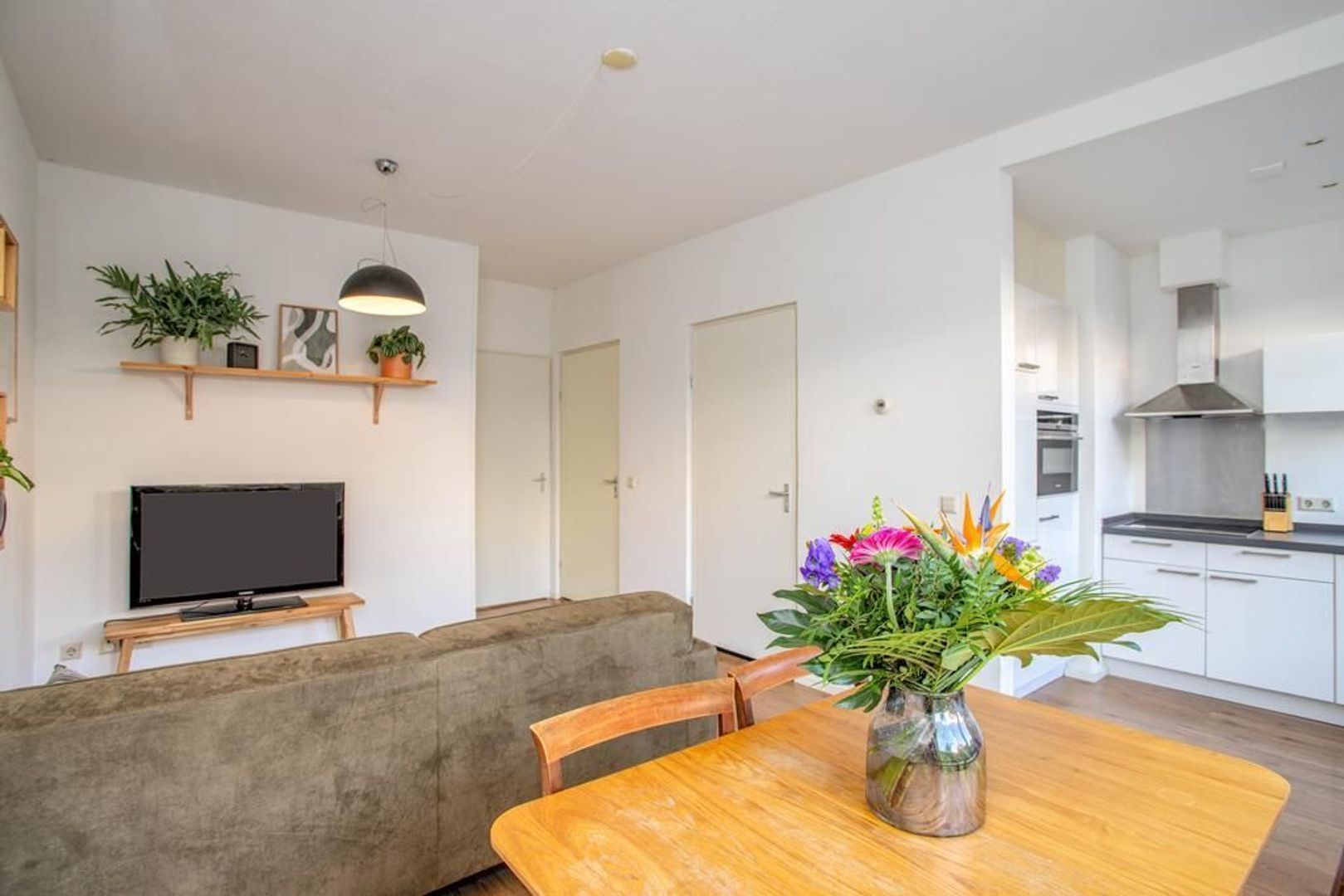 Je komt de woning binnen via de hal, die direct uitkomt in de lichte woonkamer. Het eetgedeelte grenst aan de open keuken, ideaal om gezellig te tafelen met vrienden en familie. De moderne keuken is van alle gemakken voorzien, zoals een koelkast en combi-oven.