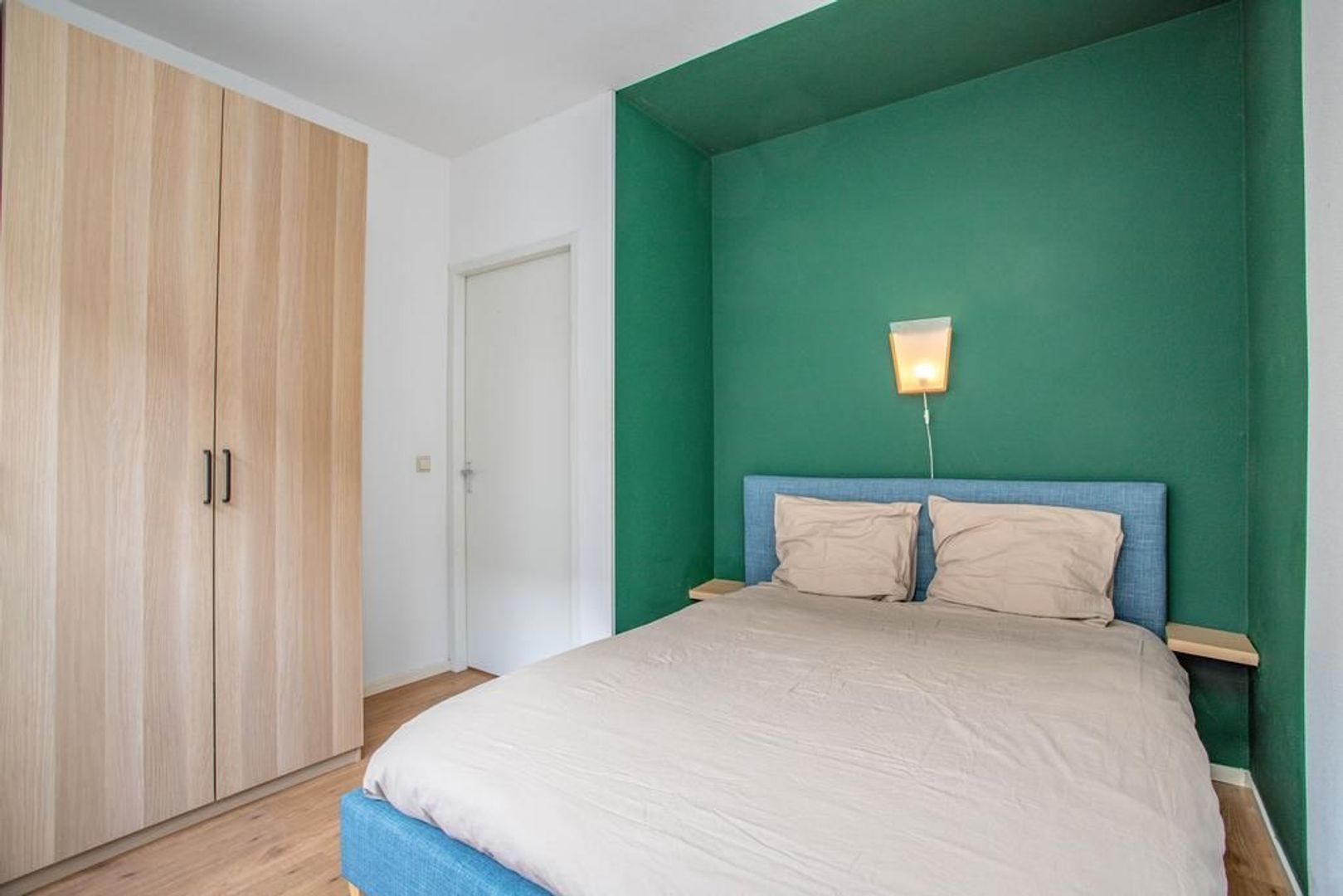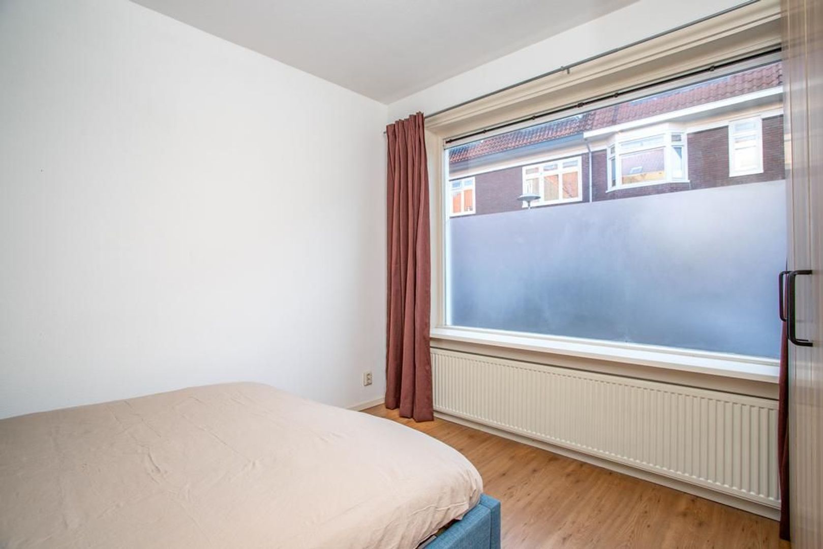De ruime slaapkamer aan de voorkant biedt voldoende ruimte voor een groot tweepersoonsbed en een grote linnenkast.