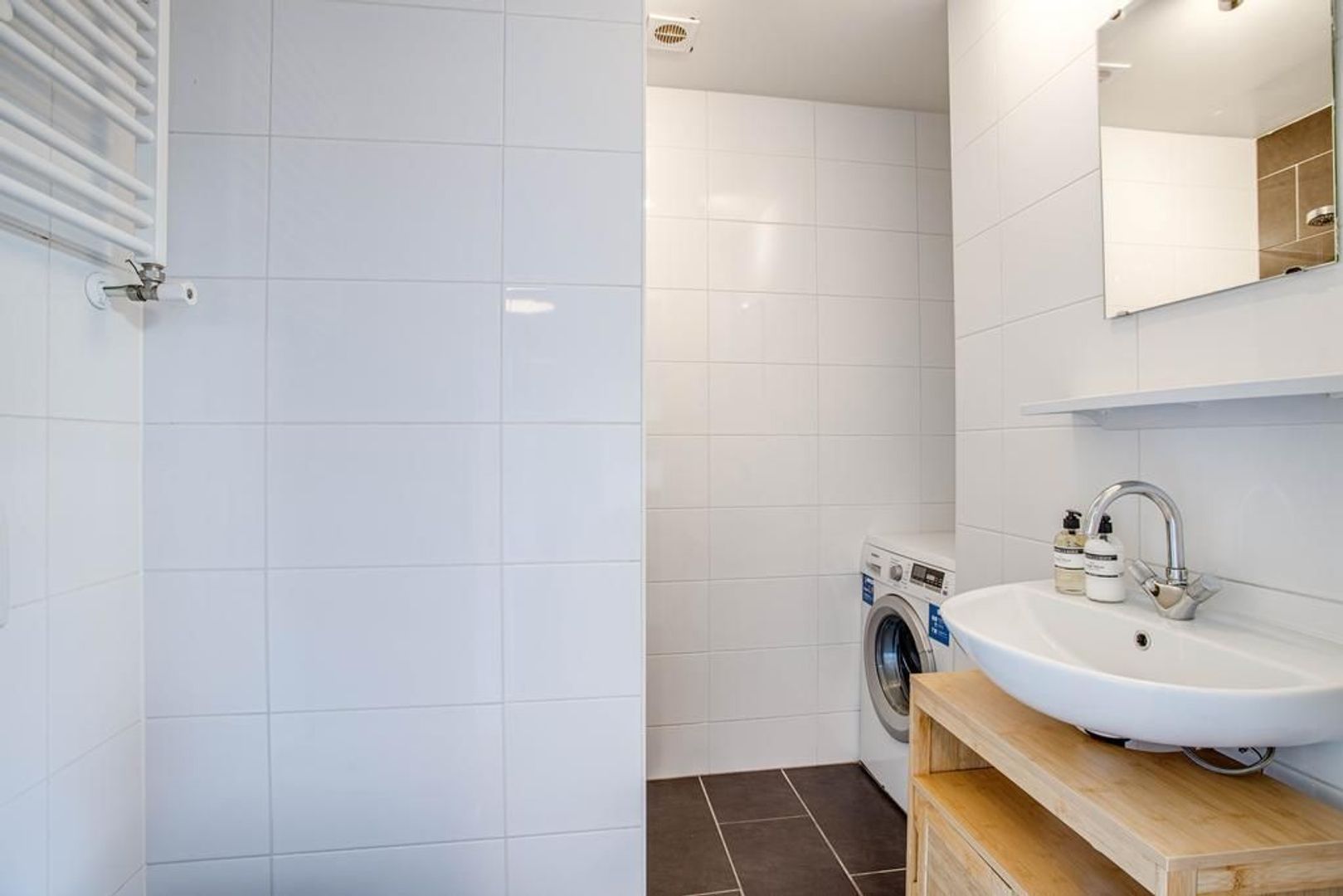 De badkamer is uitgerust met een douche, wc en wastafel. Tevens is er een opstelplaats voor de wasmachine.