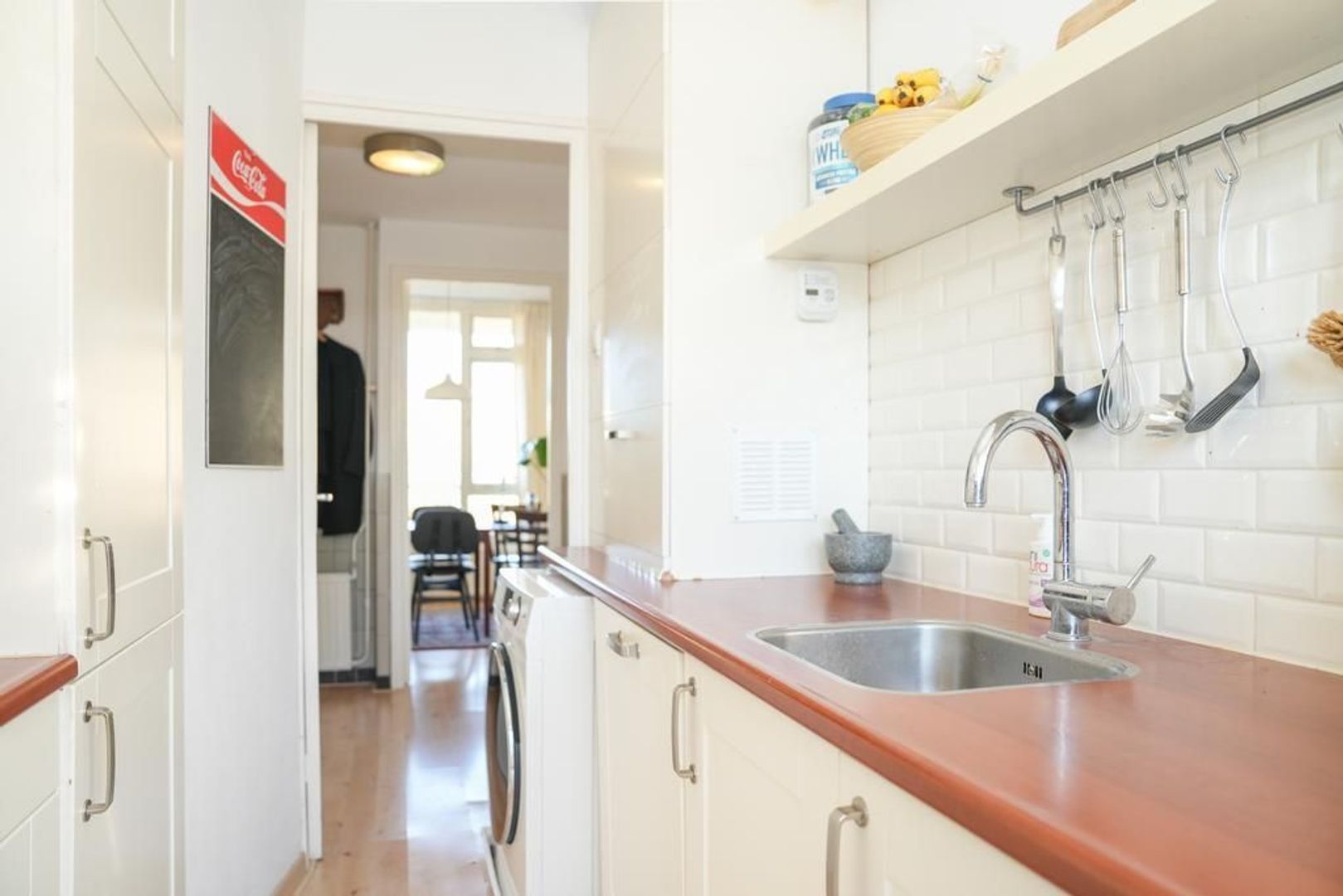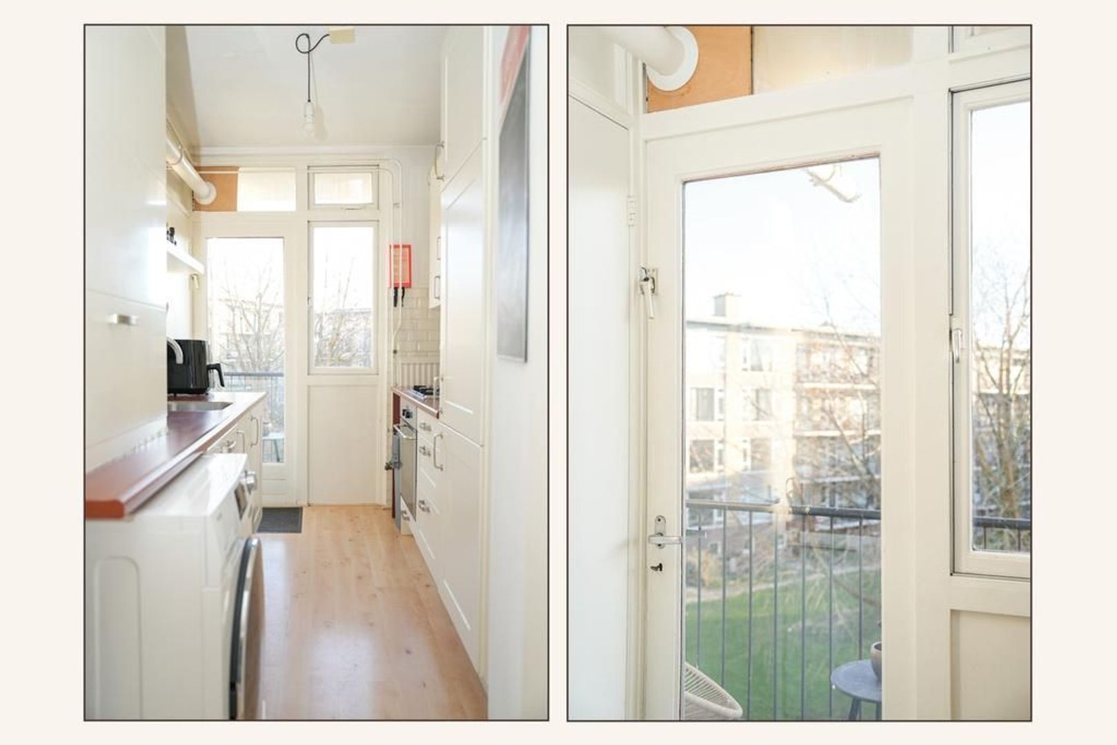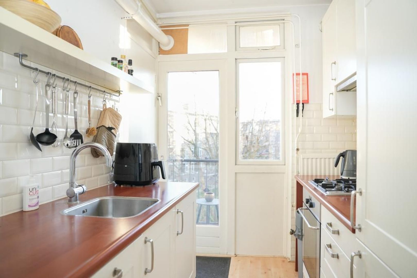 De keuken is voorzien van inbouwapparatuur zoals een 4-pitsgastoestel, afzuigkap, koelkast, vriezer en een vaatwasser. Ook de witgoedaansluiting is hier aanwezig. Via de keuken is het tweede kleinere balkon toegankelijk.