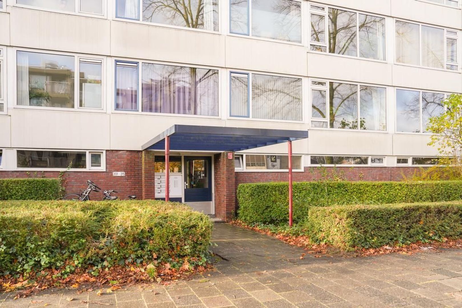Gezamenlijke entree met brievenbussen, bellentableau, trapopgang en toegang naar de bergingen.