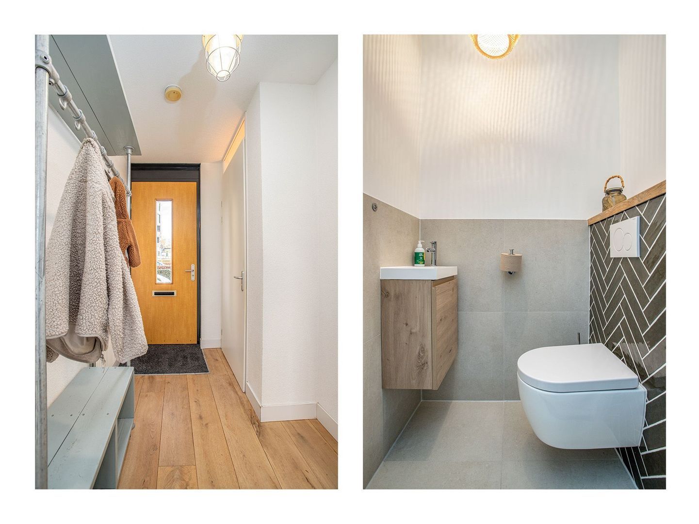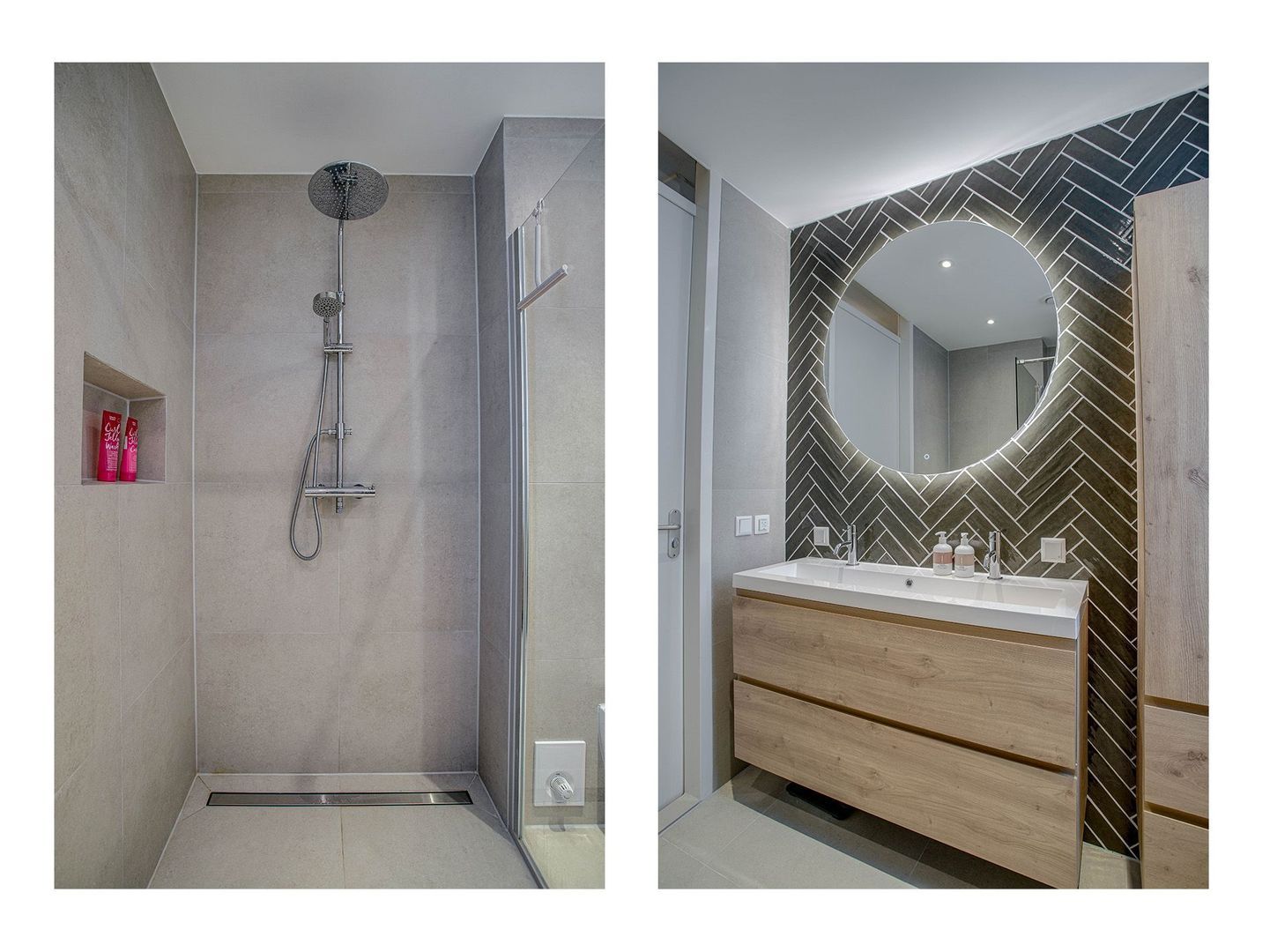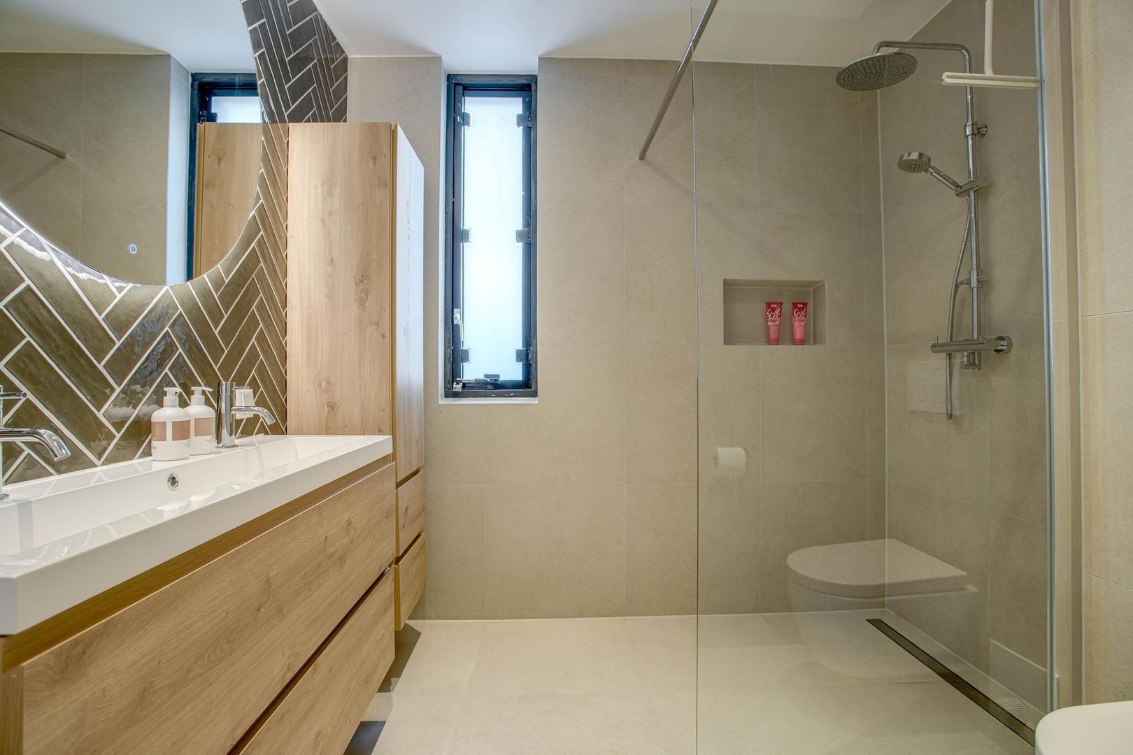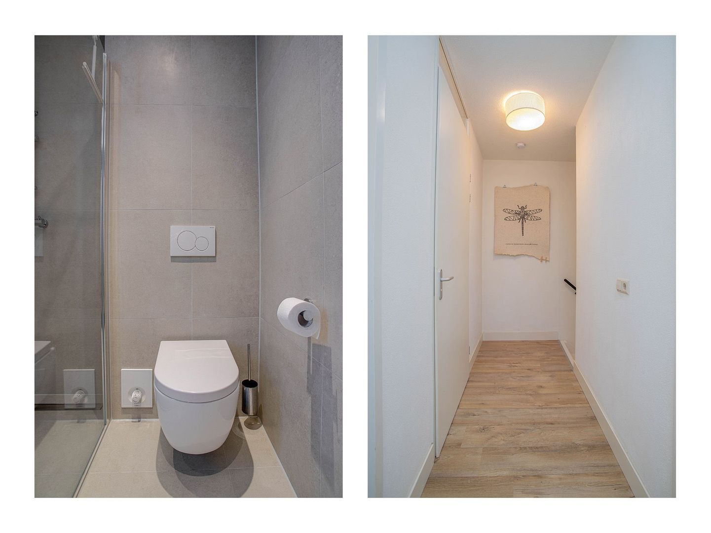 De badkamer, die in 2024 volledig is gerenoveerd en is ruim van formaat. De badkamer heeft een tweede toilet, een inloopdouche en is voorzien van een grote dubbele wastafel met meubel.