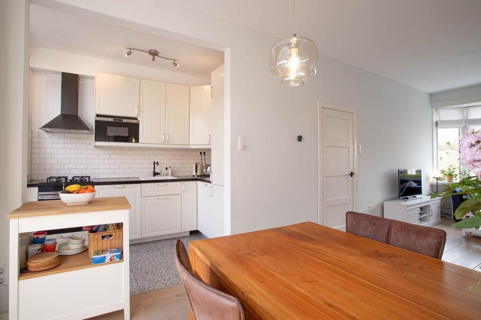 De open keuken is aangrenzend aan de eetkamer gelegen. De keuken is verzorgd en voorzien van de volgende inbouwapparatuur: gasfornuis, afzuigkap, oven, magnetron, koelkast en vriezer.