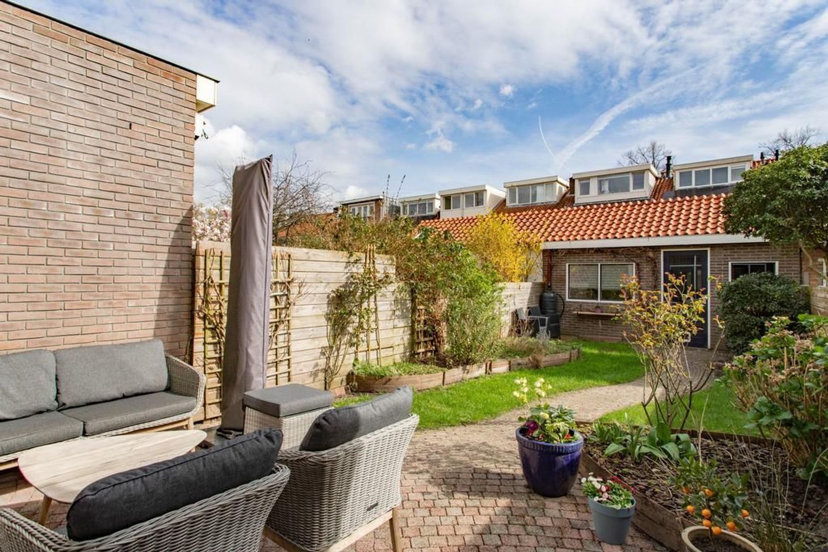 • Voortuin en achtertuin op het zuidoosten waardoor er altijd een plek in de zon én schaduw te vinden is (achtertuin voorzien van achterom en berging);