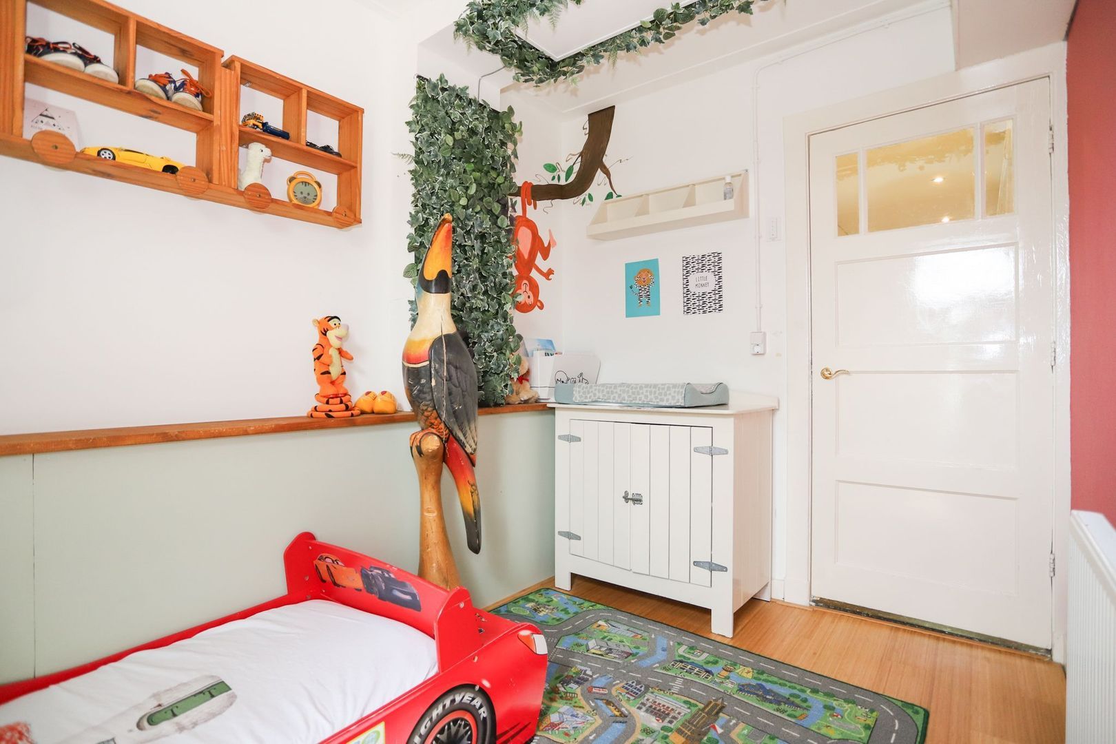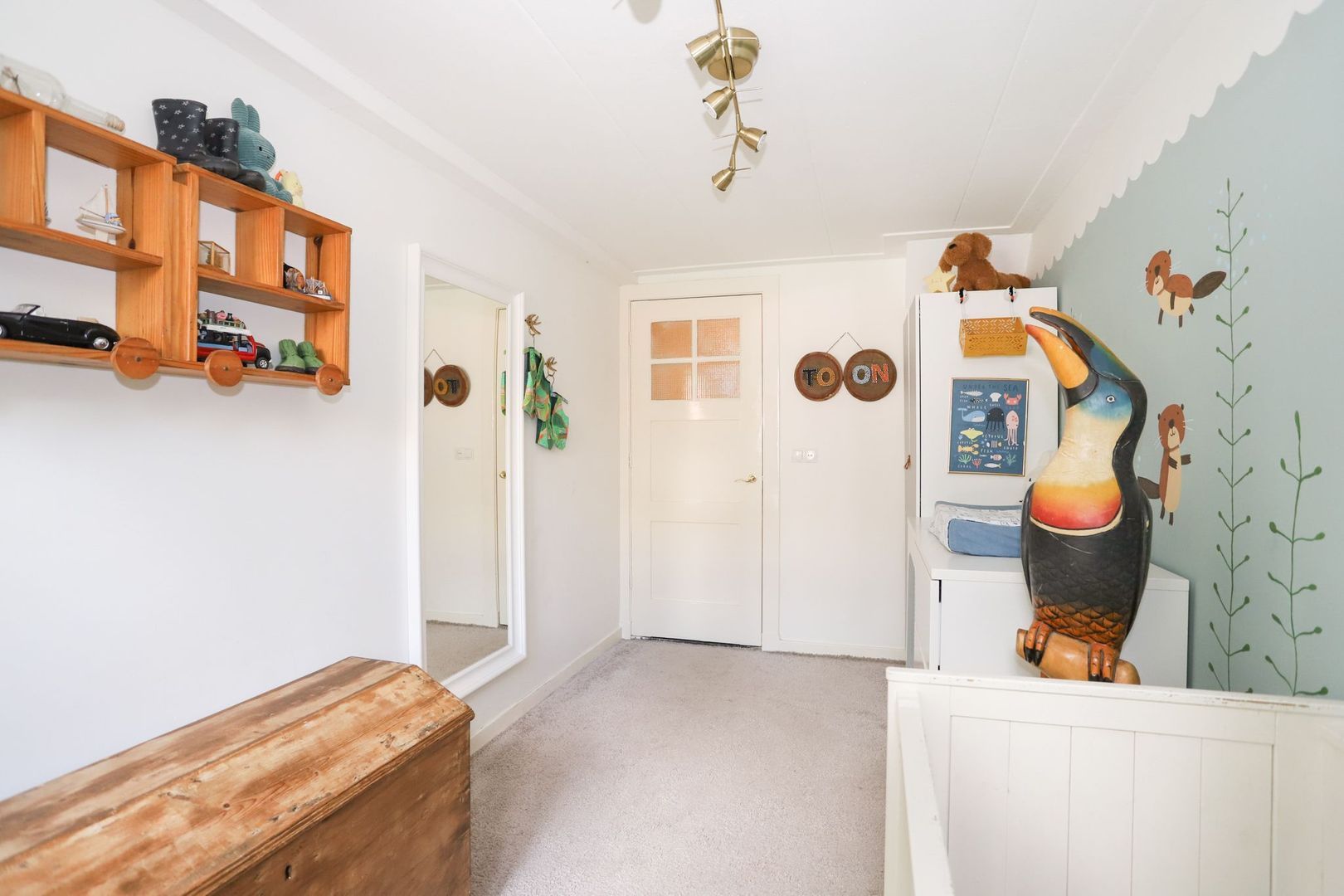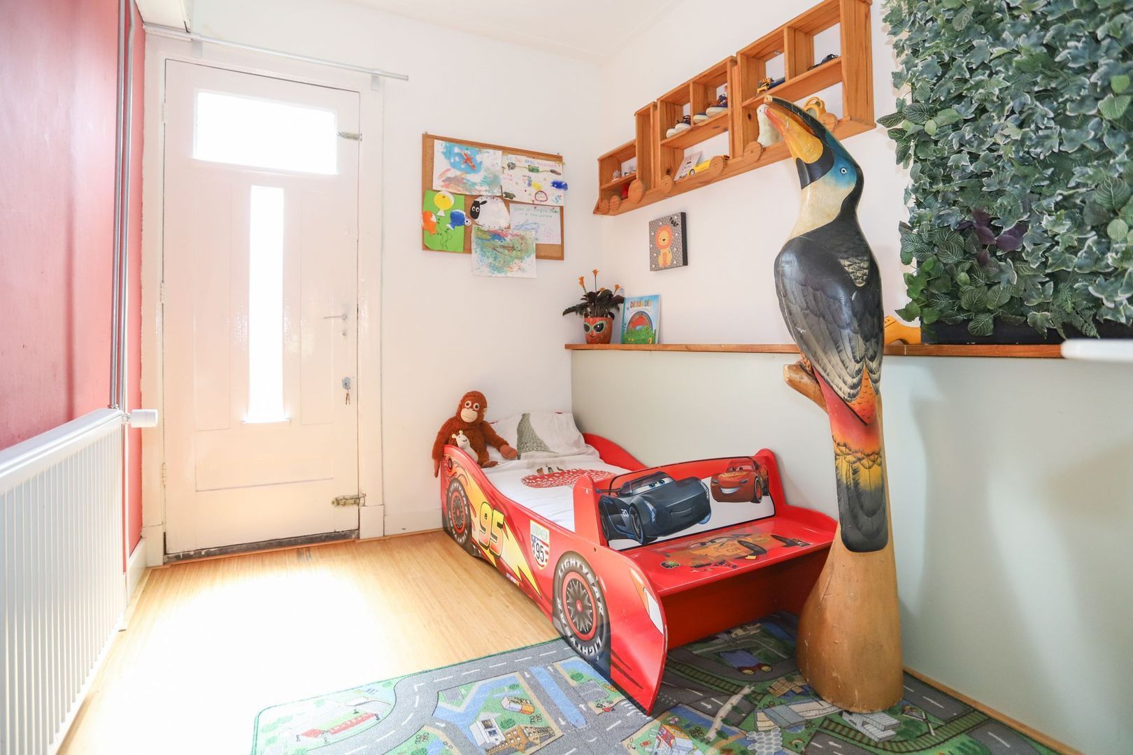 Via de kleinere slaapkamer aan de voorzijde is de voortuin toegankelijk. Hier kan je heerlijk genieten van de zon want hij is gelegen op het zonnige zuiden. Tevens kan je hier vandaan ook de stoep bereiken. In de zomer bloeit in de voortuin de mooie rozenstruik en is dit de perfecte plaats voor een moestuin.