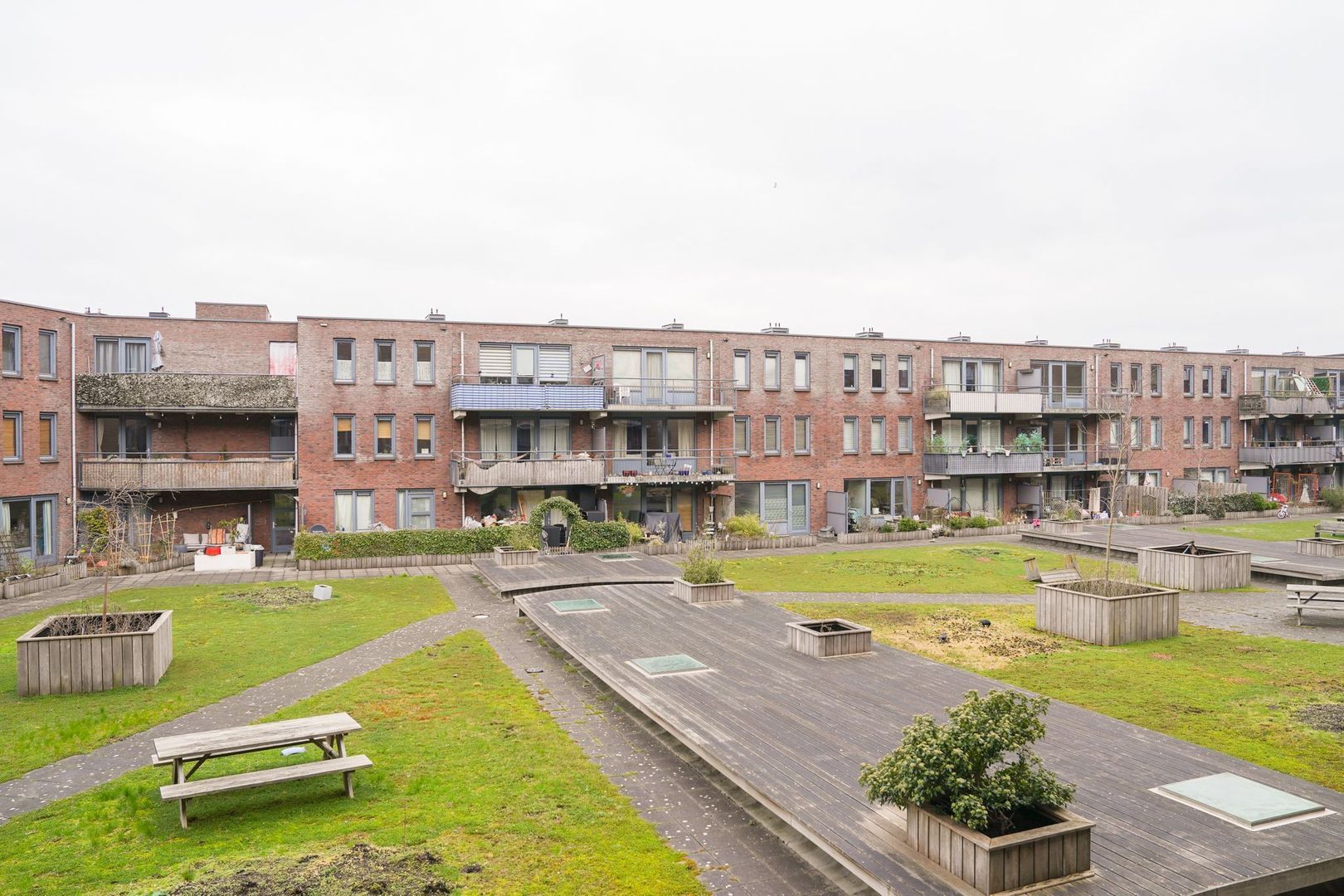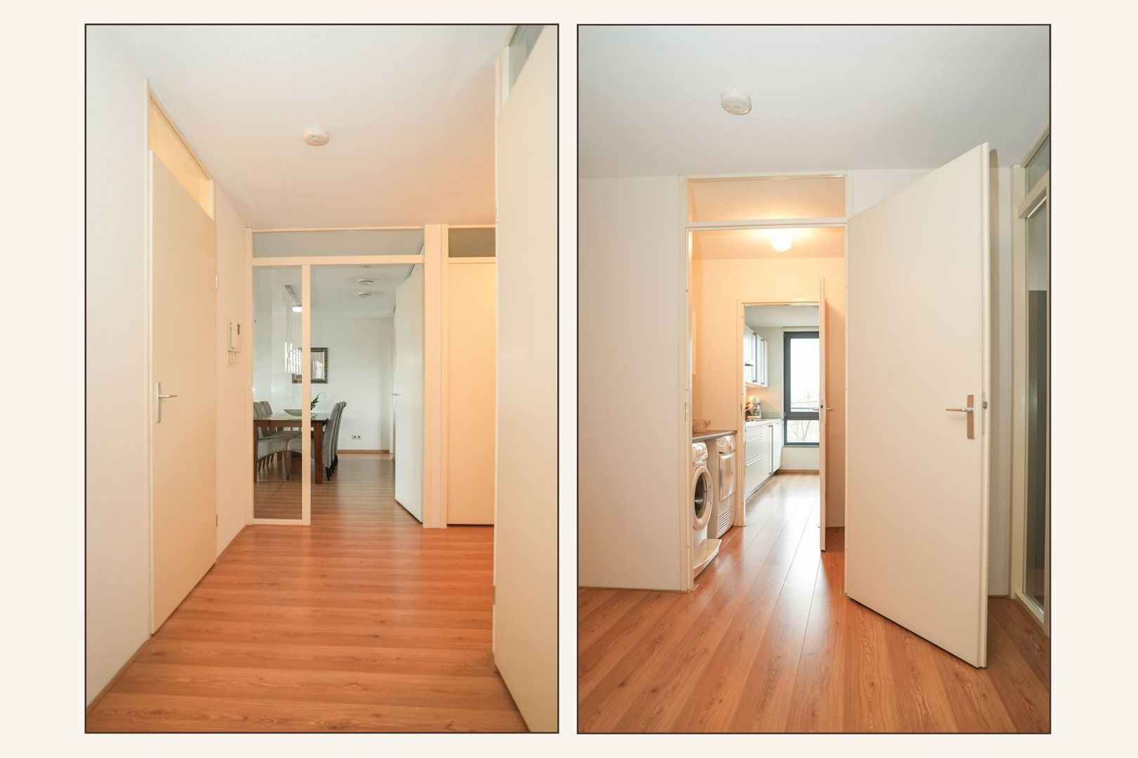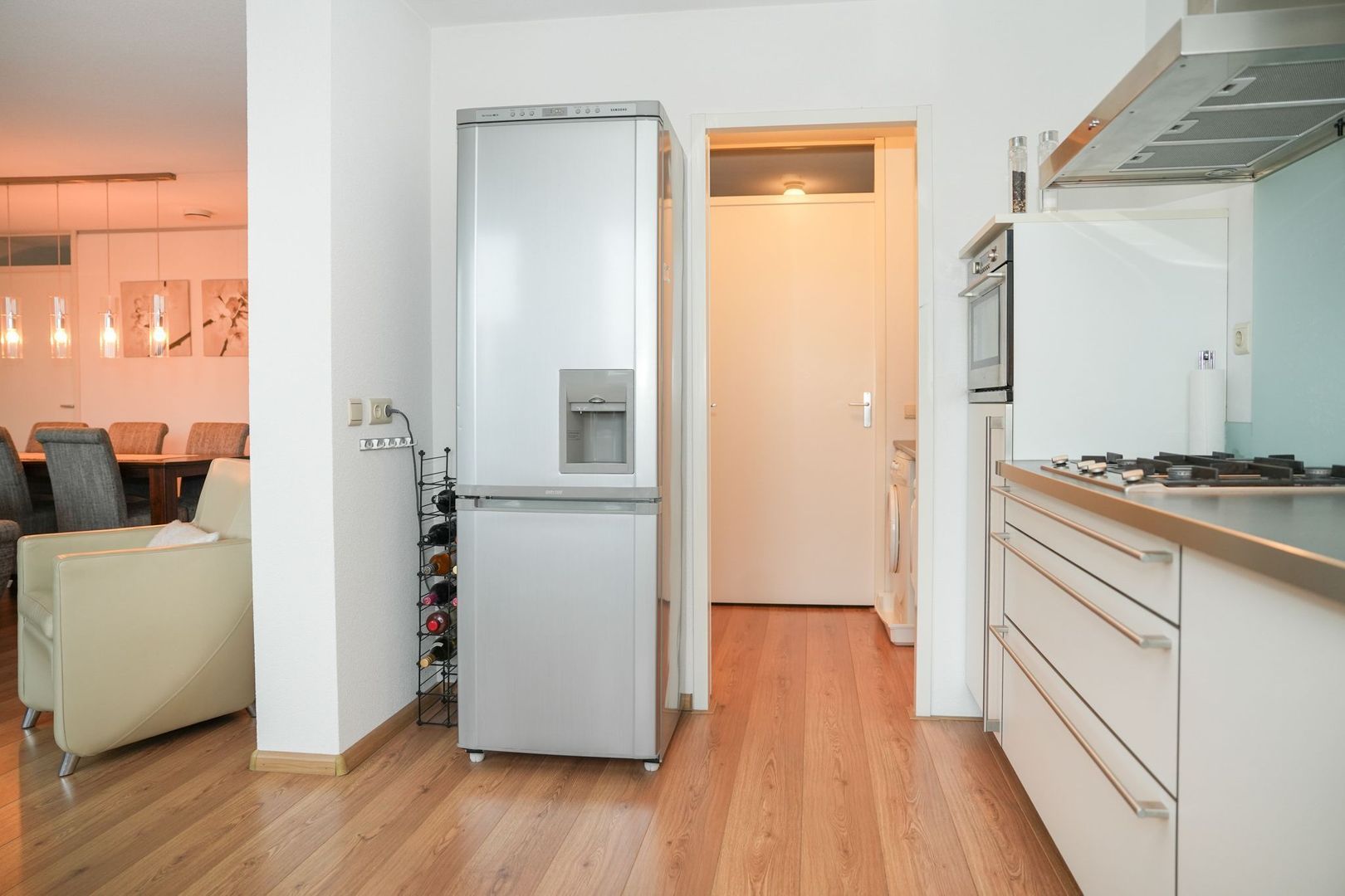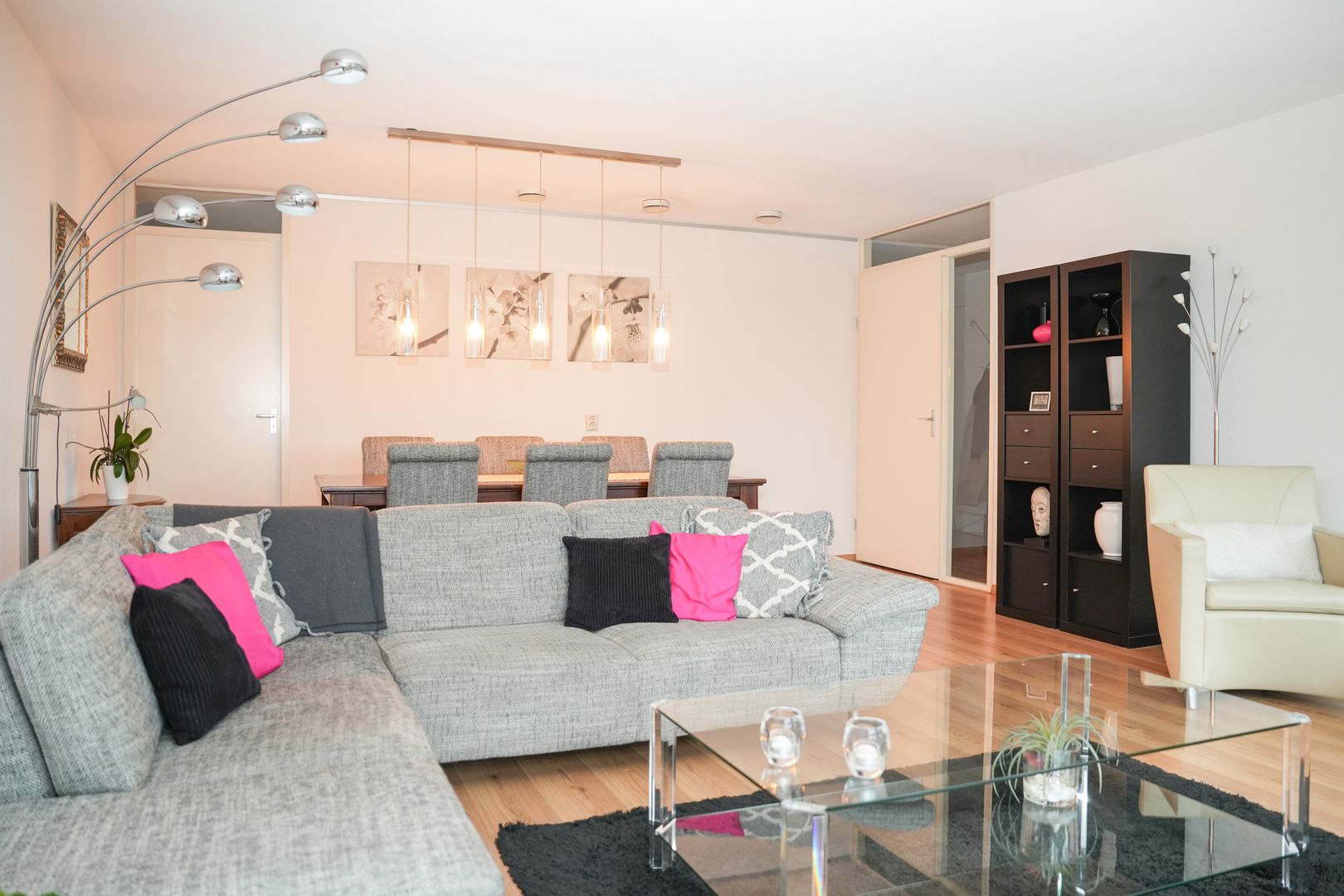 Ruime hal/entree met toegang tot alle vertrekken waaronder de royale woonkamer. De woonkamer kenmerkt zich door de riante raampartijen wat bijdraagt aan een fijne lichtinval in deze ruimte. De open keuken heeft een moderne uitstraling en is voorzien van inbouwapparatuur en een losse koel/vrieskast. De woonkamer heeft net als het gehele appartement een verzorgd afwerkingsniveau en is voorzien van een nette laminaatvloer en frisse afwerking op de wanden. Vanuit de kamer is een fijn uitzicht naar buiten en een hoge mate van privacy en alle ramen zijn voorzien van zonne(screens). Vanuit de woonkamer is een van de slaapkamers bereikbaar die vervolgens weer toegang geeft tot het fijne balkon van bijna 8 m2. Het balkon heeft een hoge mate van privacy en heeft een fraai uitzicht op de gemeenschappelijke binnentuin.
