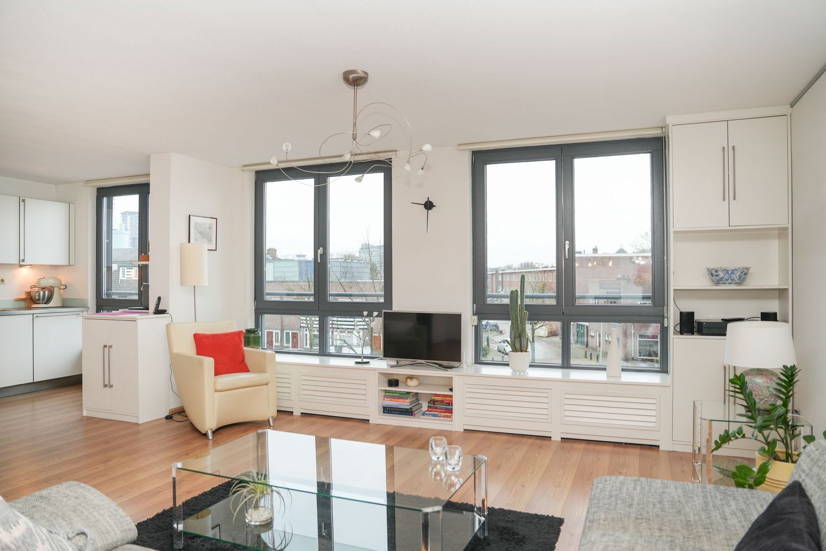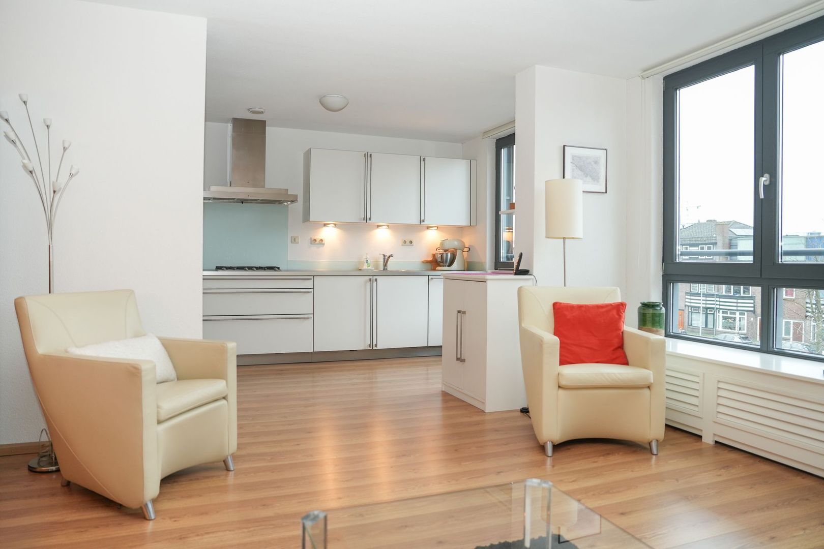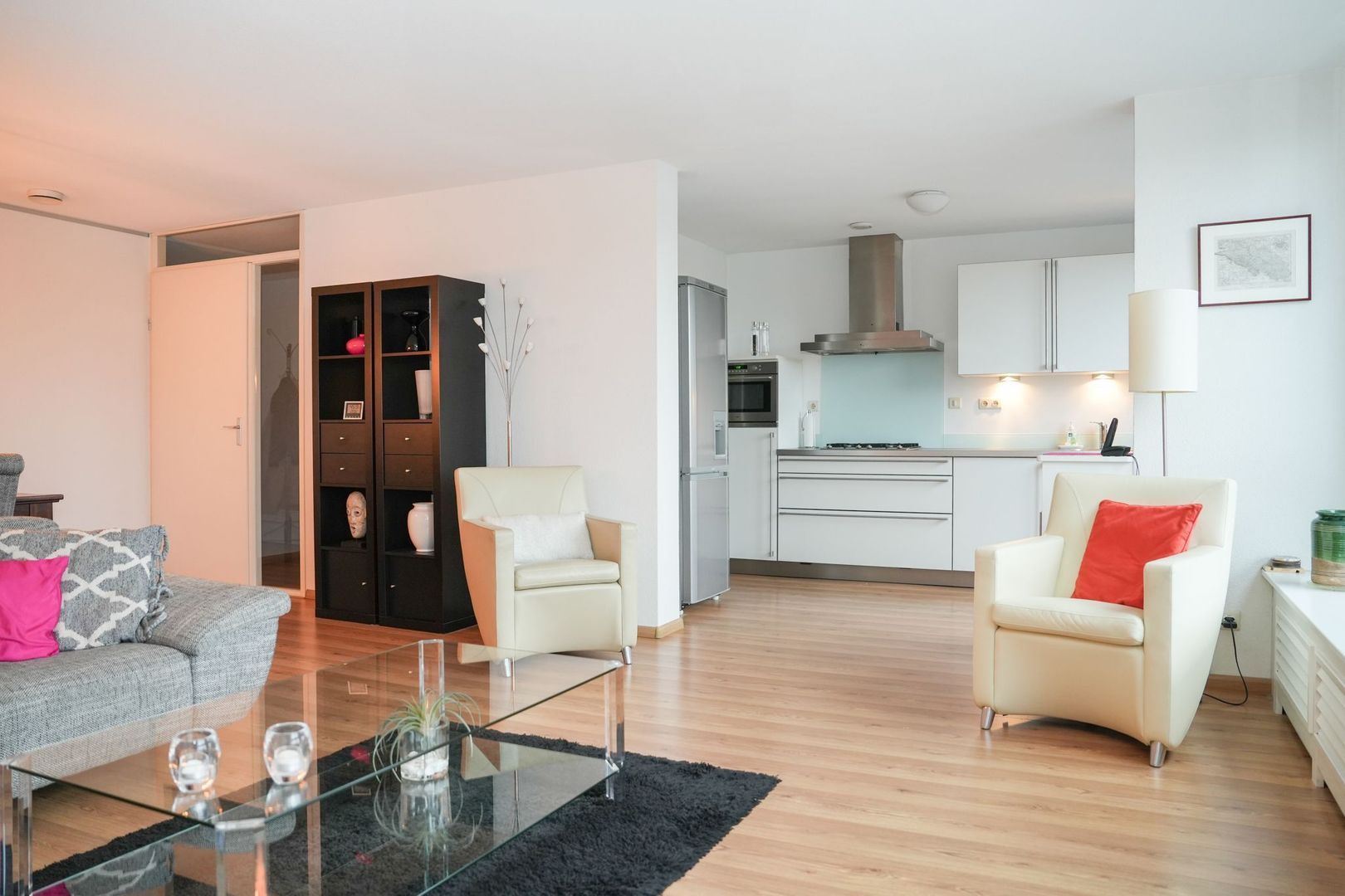 Kenmerkend voor de woonkamer, met open keuken, is de frisse afwerking op wanden, plafonds en vloer. Maar bovenal de grote raampartijen spreken tot de verbeelding. Vanwege de ligging op het zuiden is dit appartement bovengemiddeld licht heeft een fraai uitzicht richting de stad. Alle ramen zijn voorzien van elektrische (zonne)screens. Aan de achterzijde van het appartement is een ruim balkon gelegen dat voorziet in veel privacy en uitzicht op de fraaie gemeenschappelijke binnentuin.