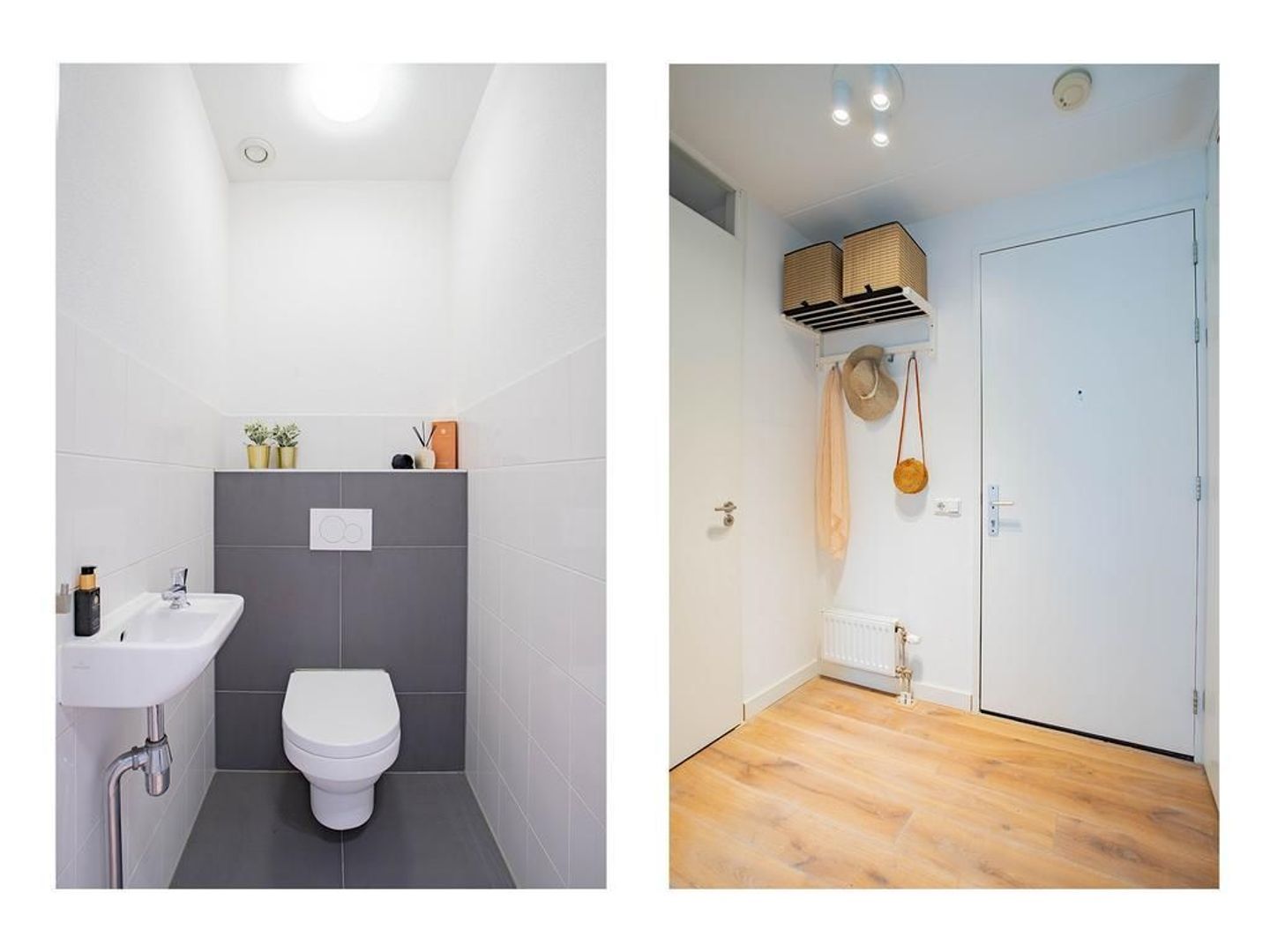 Gezamenlijke ingang via het portiek. Entree met separaat toilet en inbouwkasten. De entree geeft toegang tot de woonkamer. De lichte en frisse woonkamer is voorzien van een strakke wand- en vloerafwerking. De parketvloer in de woning is recent opnieuw geschuurd en geolied. Door de grote schuifpui komt er veel natuurlijk daglicht binnen waardoor de ruimte fijn aanvoelt. In de woonkamer is voldoende ruimte voor het creëren van een gezellige zithoek. Via de schuifpui in de woonkamer is het balkon toegankelijk. Het balkon is gesitueerd over de gehele breedte van de woonkamer, zomers dient het balkon echt als een verlening van de woonkamer. Het balkon is gelegen op het zuidwesten, dankzij deze ligging heb je hier het overgrote gedeelte van de dag de zon.