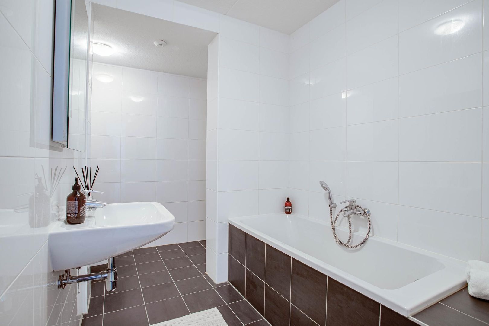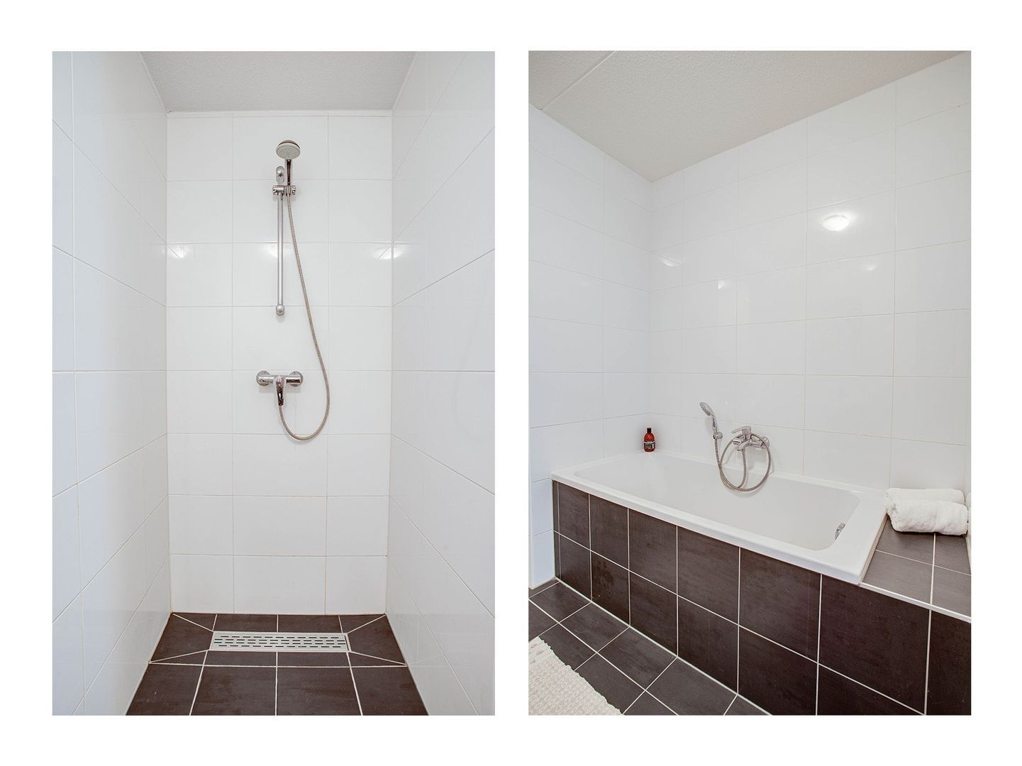De badkamer bevindt zich aan het einde van de gang. De royale badkamer heeft een verzorgde uitstraling en is voorzien van een ligbad, een inloopdouche, een toilet en een wastafel.