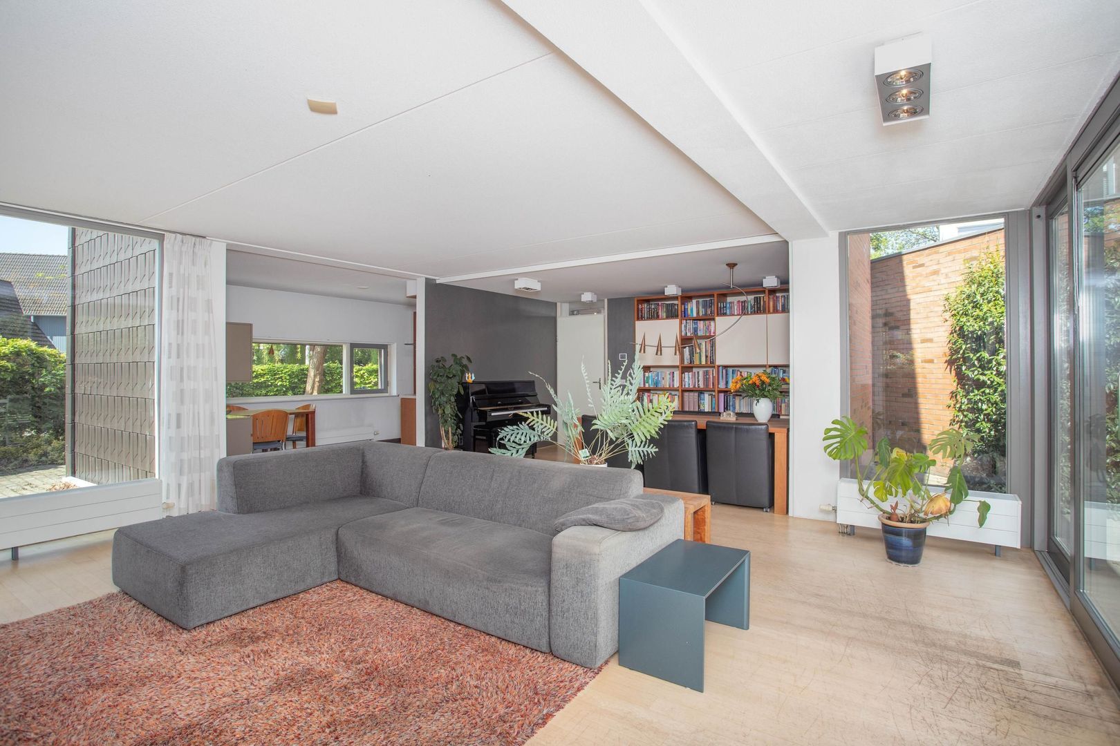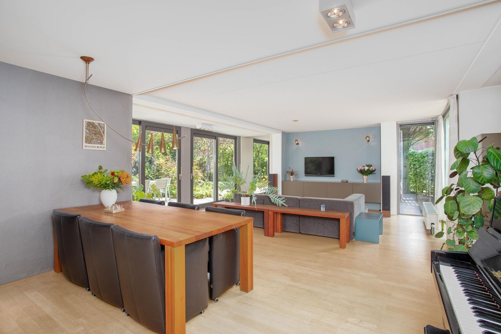 De royale woonkamer is opvallend licht dankzij de grote raampartijen en biedt via een dubbele schuifpui directe toegang tot de fraai aangelegde achtertuin op het zonnige zuidoosten. Deze schuifpui zorgt voor een prettig uitzicht en een naadloze verbinding tussen binnen en buiten. Aansluitend aan de woonkamer ligt de riante halfopen eetkeuken, die is voorzien van diverse inbouwapparatuur, waaronder een koelkast, afzuigkap, combi-oven, vaatwasser en inductiekookplaat.
