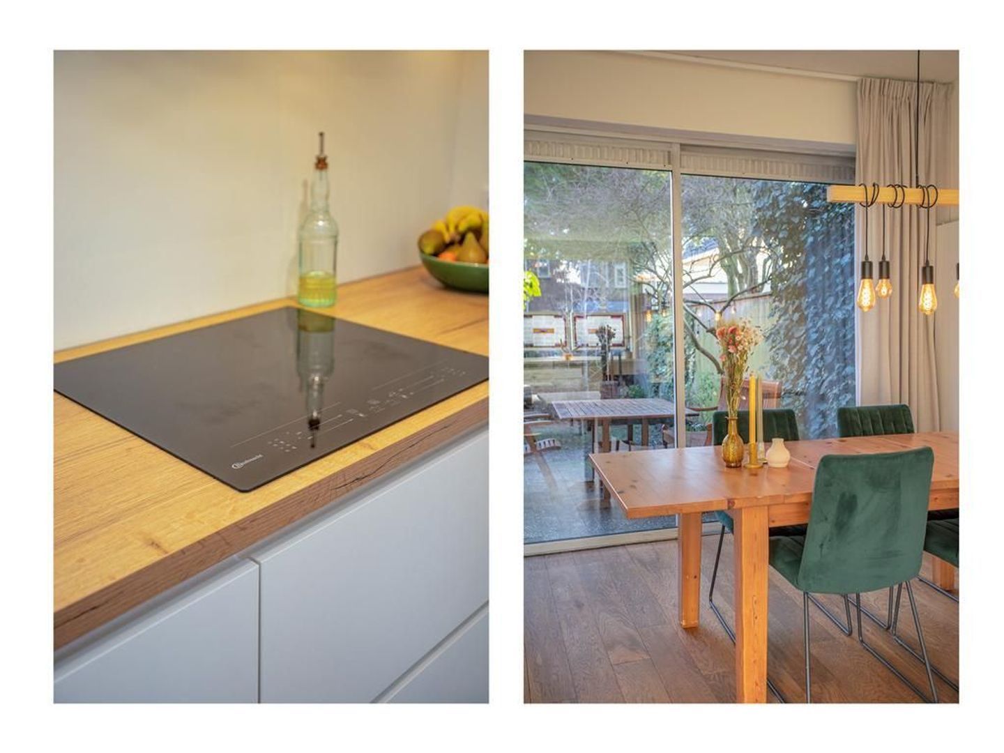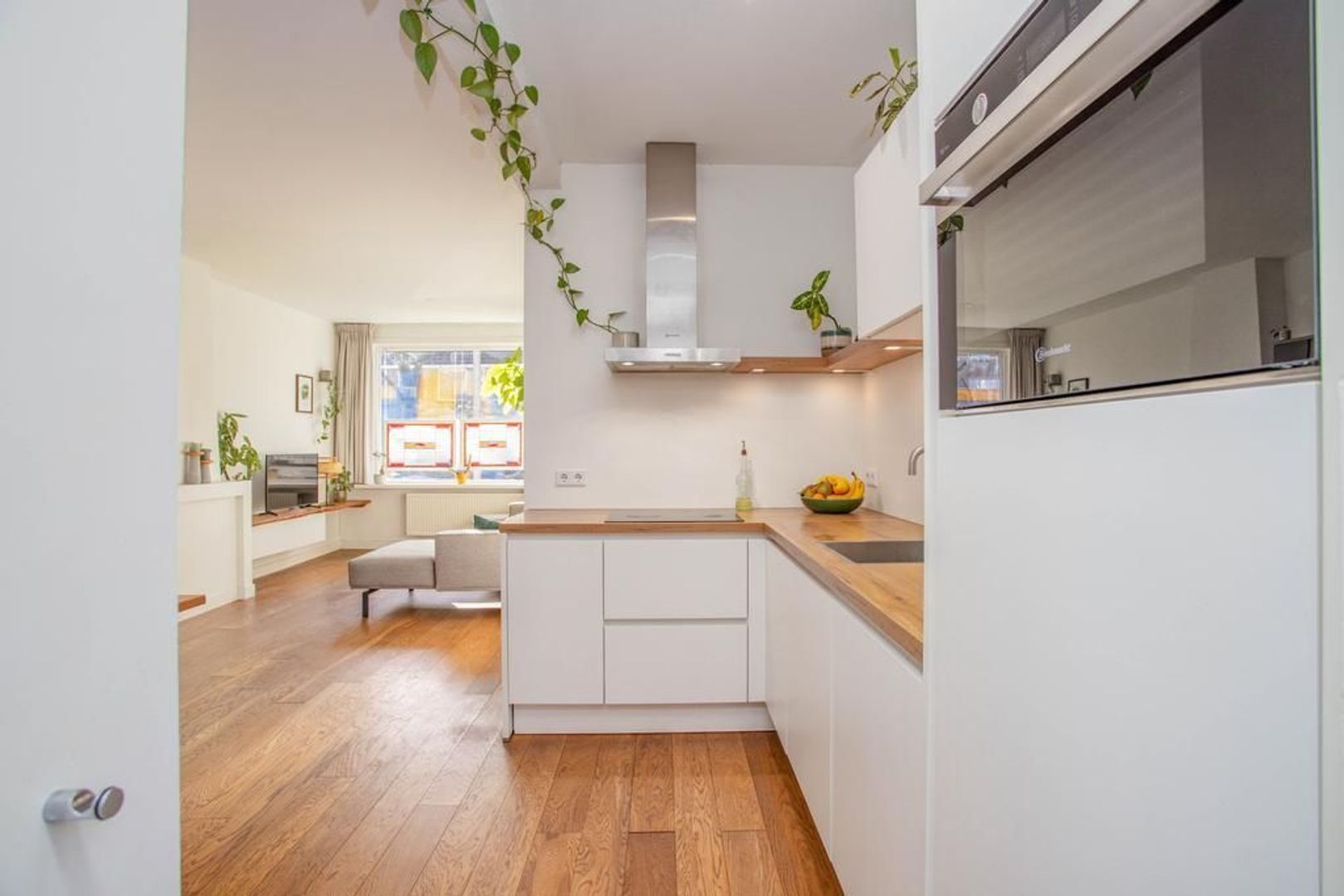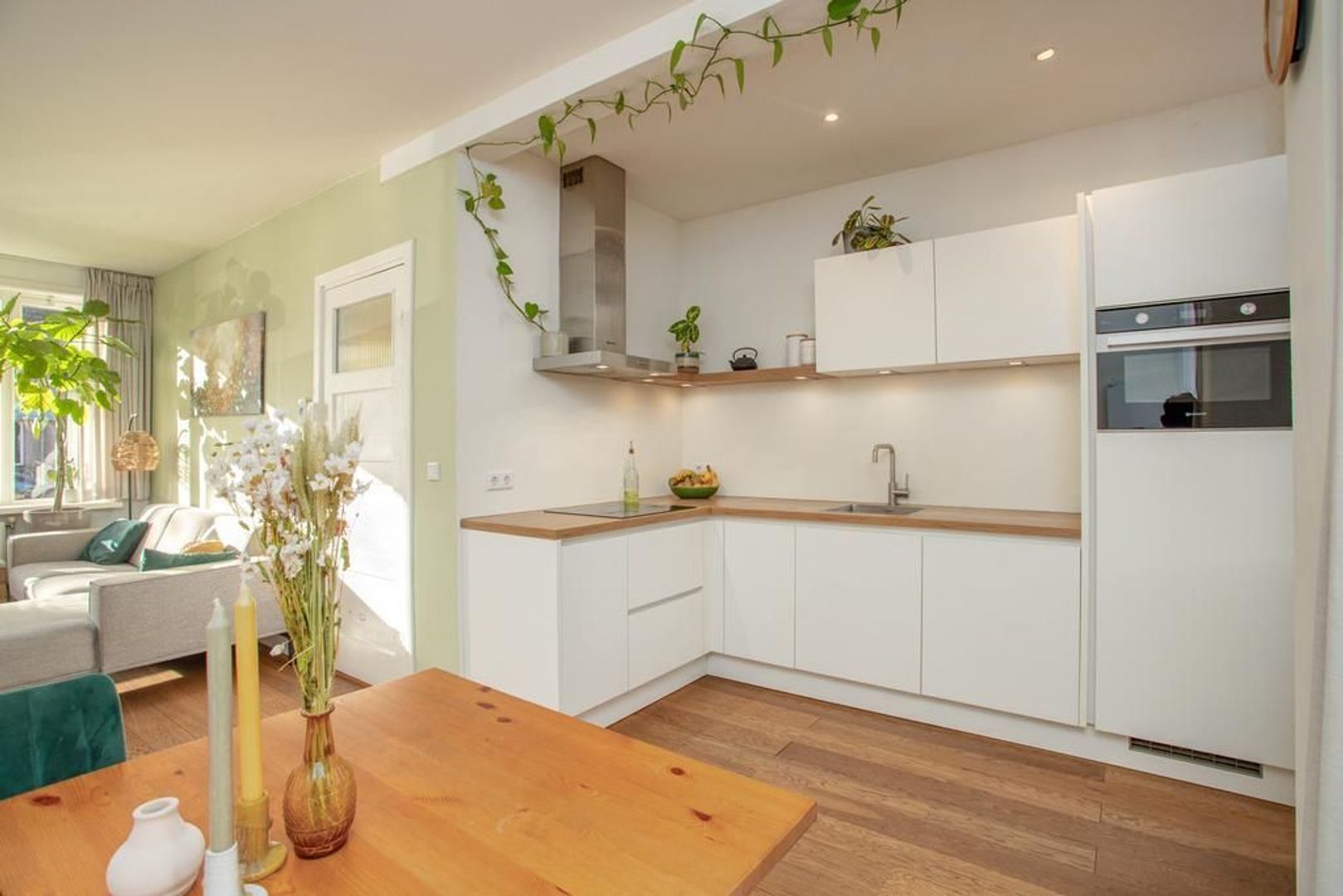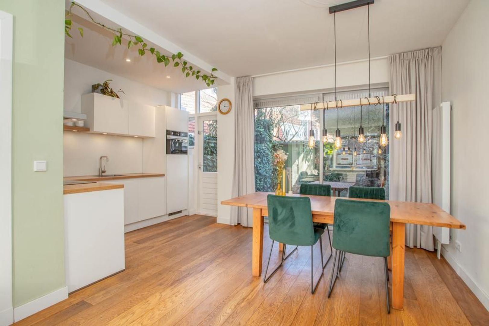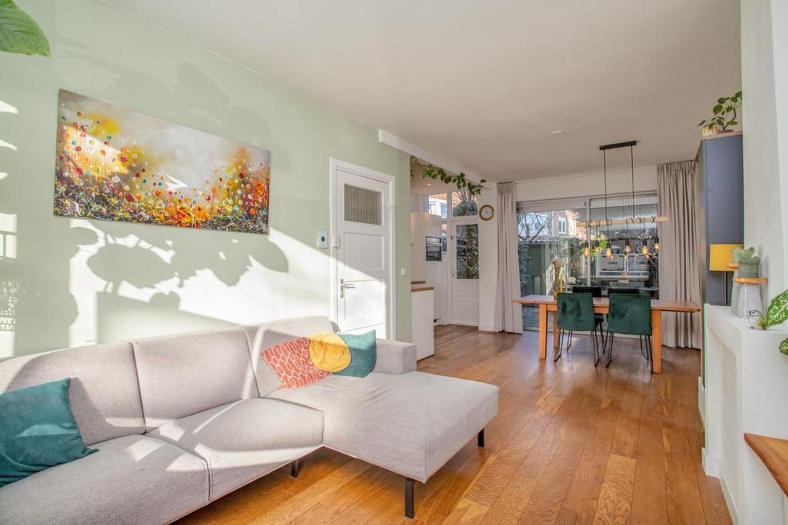 De woning betreed je via de brede stoep, waarna je in de hal aankomt. De hal geeft toegang tot de woon- en eetkamer, het toilet, de trapopgang en de meterkast. De woonkamer bevindt zich aan de voorzijde van de woning, waardoor je een prettig uitzicht hebt op de straat en hier een gezellige zithoek kunt creëren. De woning kenmerkt zich door de authentieke glas-in-loodramen. De karakteristieke schouw zorgt voor een scheiding tussen de open woon- en eetkamer. In de eetkamer is er ruimte voor een grote eettafel. Door de open keuken en de grote schuifpui ontstaat er een nog ruimtelijker gevoel in de kamer. De witte keuken, die in 2021 is geplaatst, heeft een strakke afwerking en is voorzien van een houten blad. De keuken beschikt over de volgende inbouwapparatuur: inductiekookplaat, afzuigkap, vaatwasser, combi-oven en een koelkast. Ook vanuit de keuken is de tuin te betreden. De tuin is deels betegeld en deels voorzien van groen, waaronder een grote groene boom. In de tuin heb je veel privacy en achterin staat een handige houten berging.