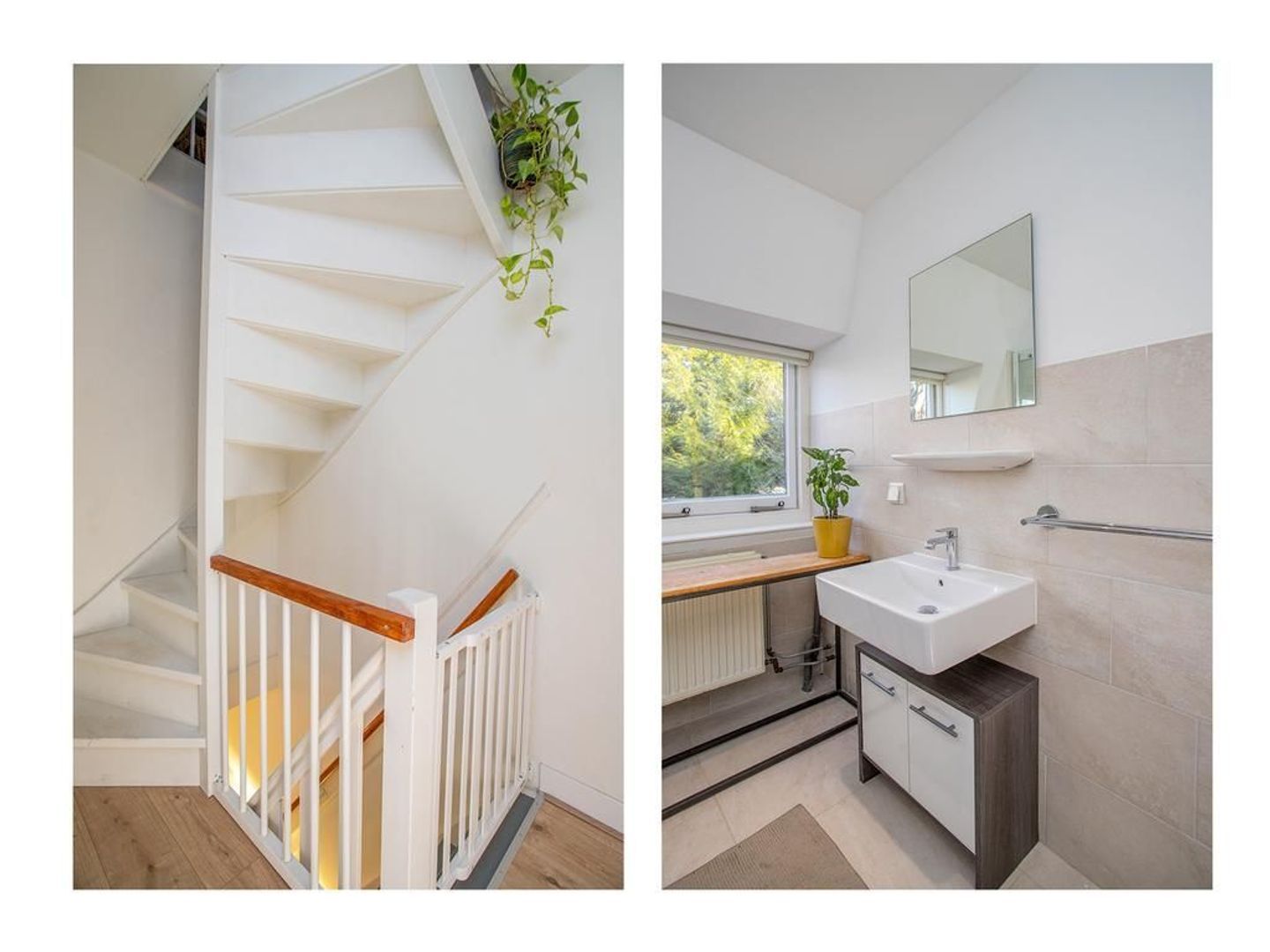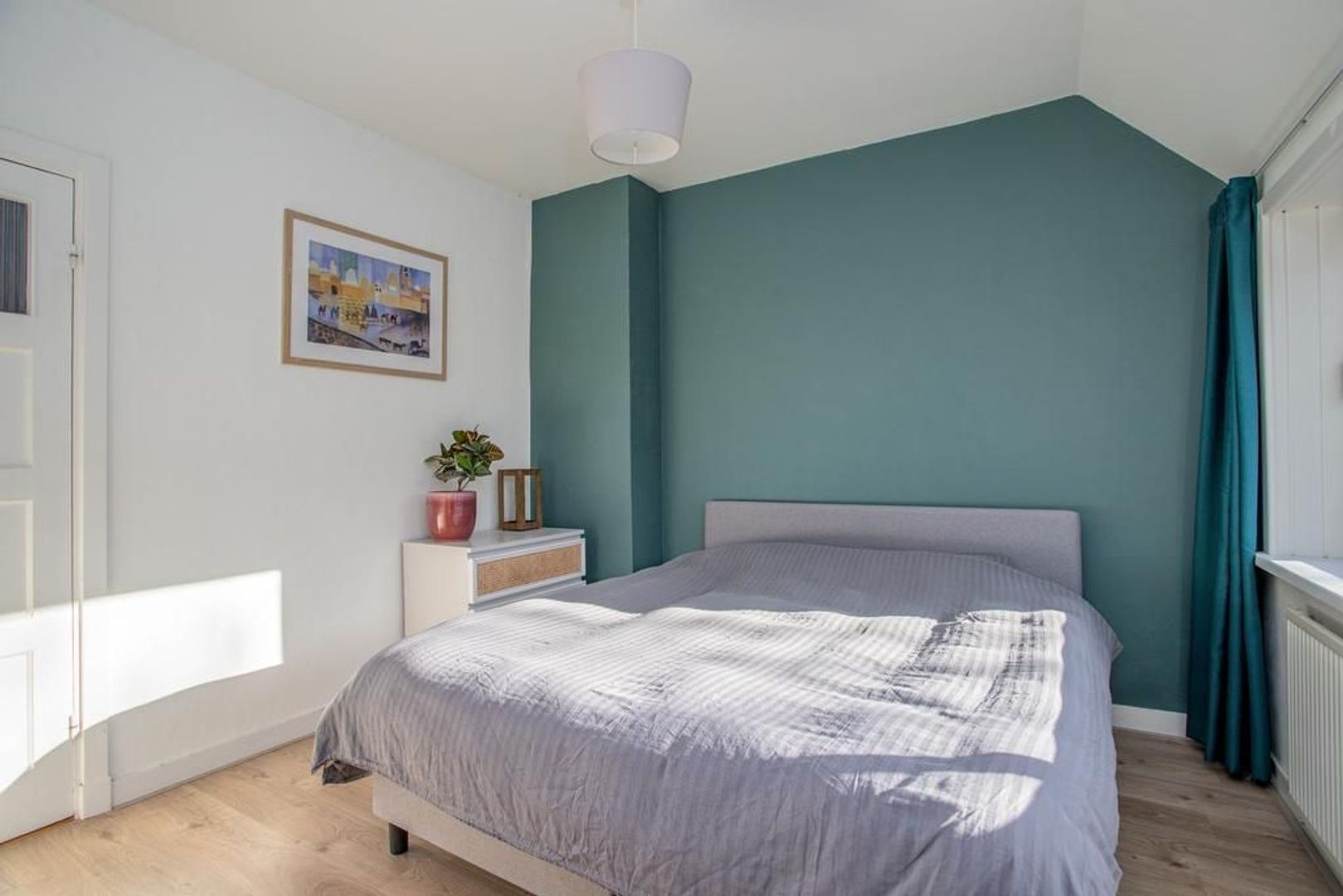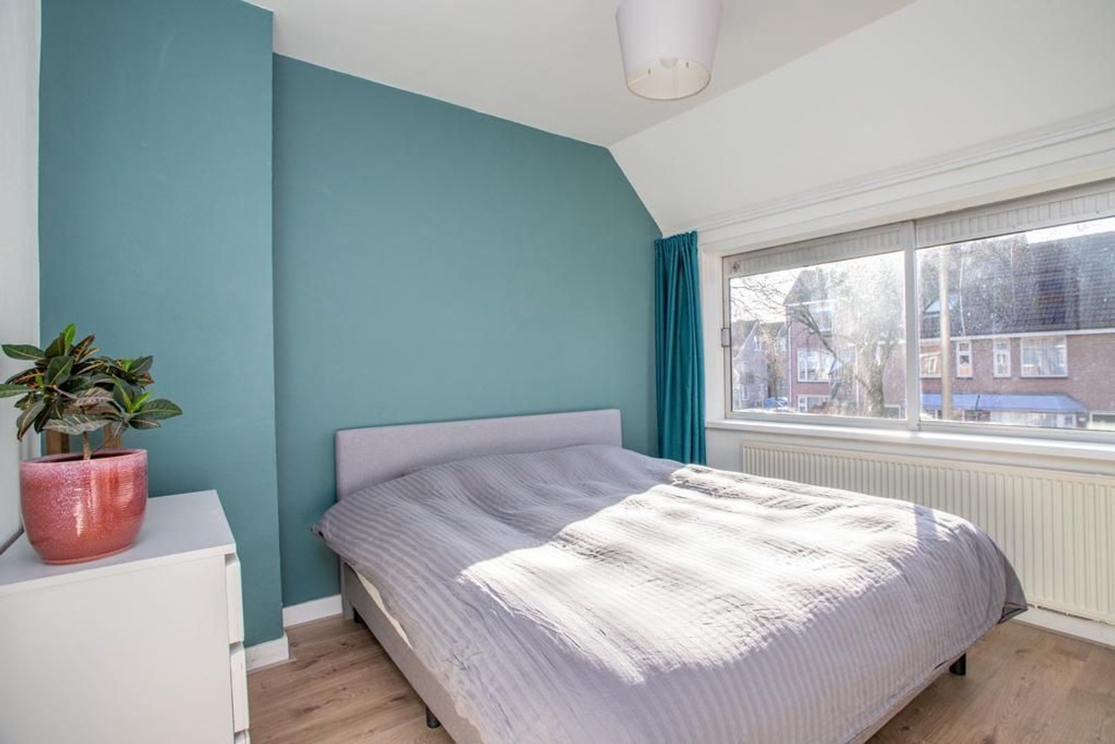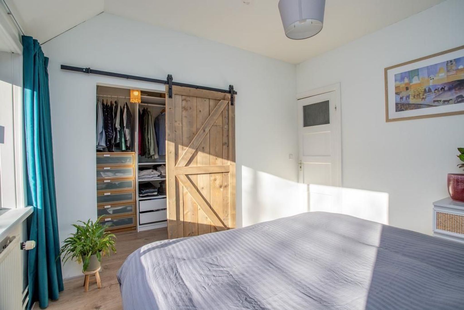 Via de overloop heb je toegang tot de twee slaapkamers en de badkamer. De hoofdslaapkamer is gelegen aan de voorzijde van de woning, waardoor je vanuit deze kamer een prettig uitzicht hebt op de straat. De kamer heeft een fijn formaat en heeft zelfs een aansluitende inloopkast, welke afgesloten kan worden met een industriële houten schuifdeur. De andere slaapkamer is gelegen aan de achterzijde van de woning en kijkt dus uit op de tuin. Deze kamer kan perfect dienen als kinderkamer. De moderne badkamer is zeer neutraal door de lichte tegels en is voorzien van een toilet, douche, wastafel en wastafelmeubel.