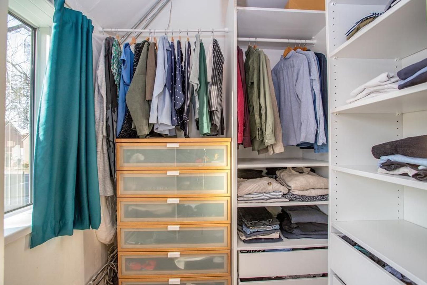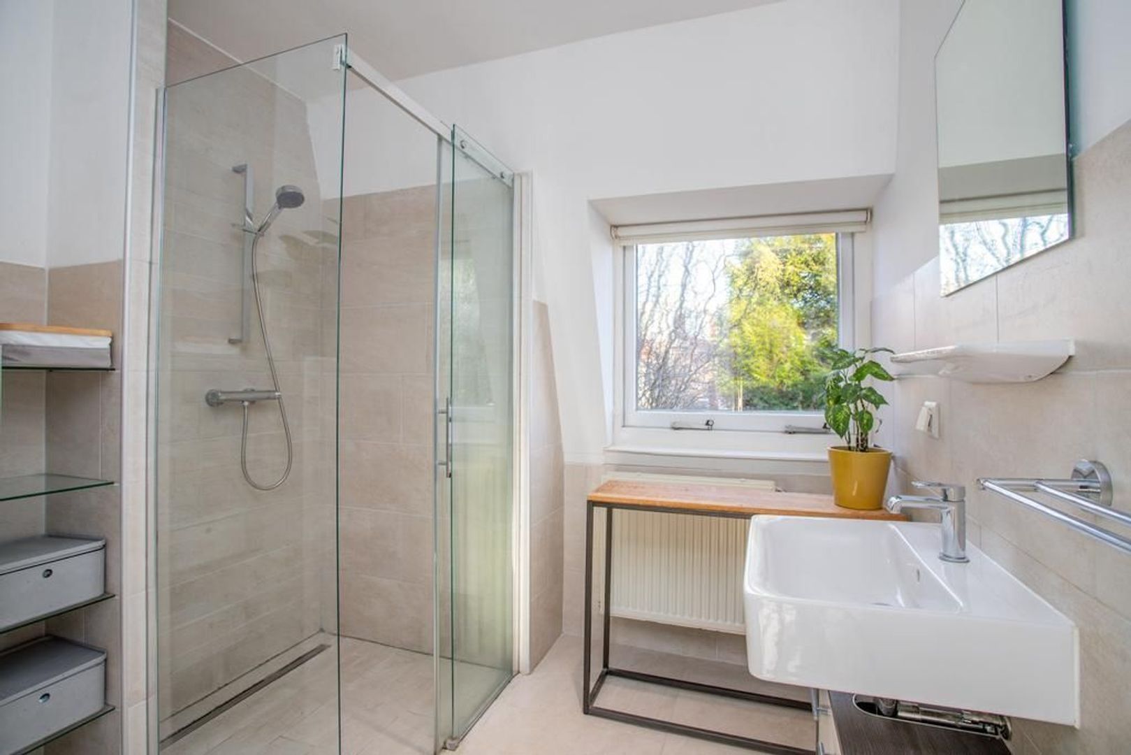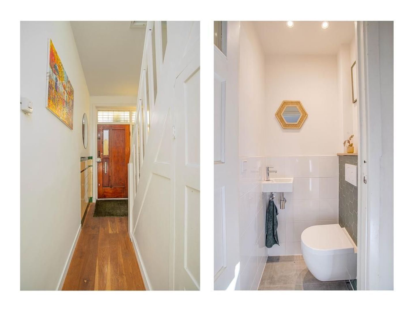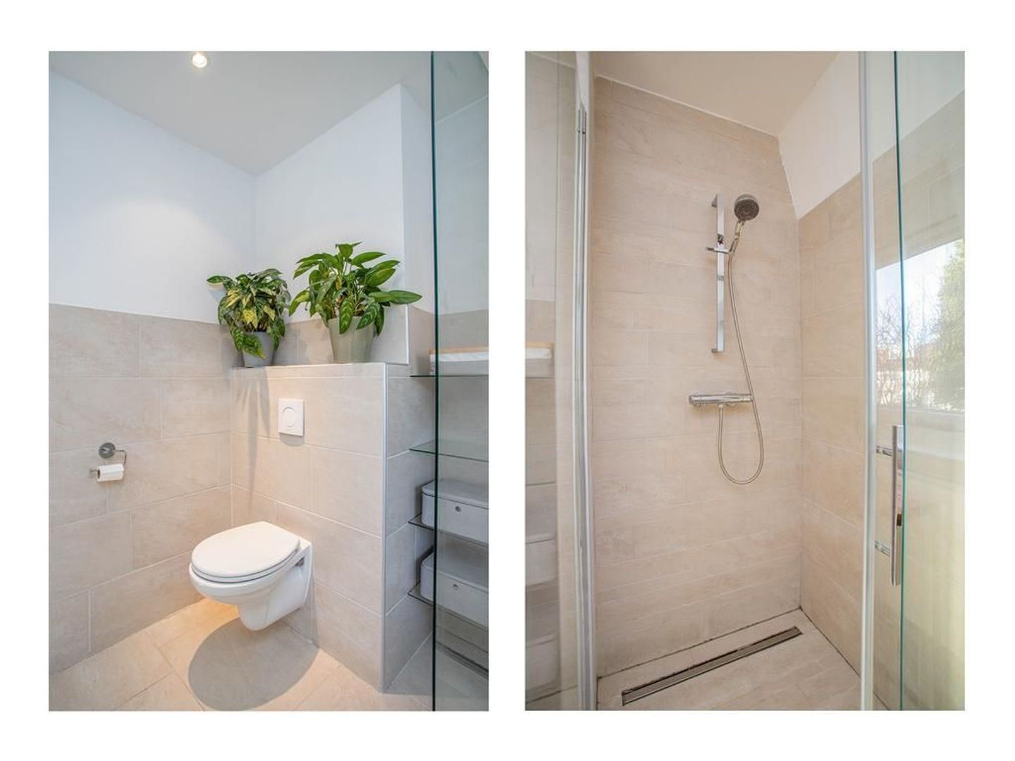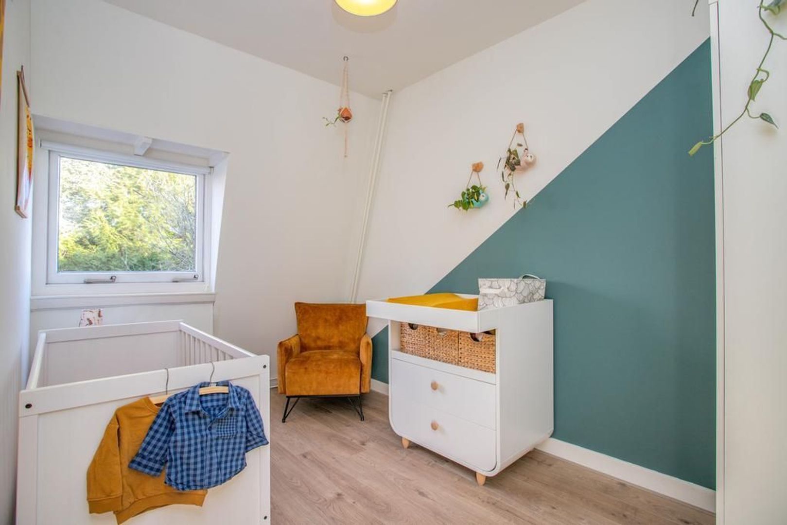 Via de overloop heb je toegang tot de twee slaapkamers en de badkamer. De hoofdslaapkamer is gelegen aan de voorzijde van de woning, waardoor je vanuit deze kamer een prettig uitzicht hebt op de straat. De kamer heeft een fijn formaat en heeft zelfs een aansluitende inloopkast, welke afgesloten kan worden met een industriële houten schuifdeur. De andere slaapkamer is gelegen aan de achterzijde van de woning en kijkt dus uit op de tuin. Deze kamer kan perfect dienen als kinderkamer. De moderne badkamer is zeer neutraal door de lichte tegels en is voorzien van een toilet, douche, wastafel en wastafelmeubel.