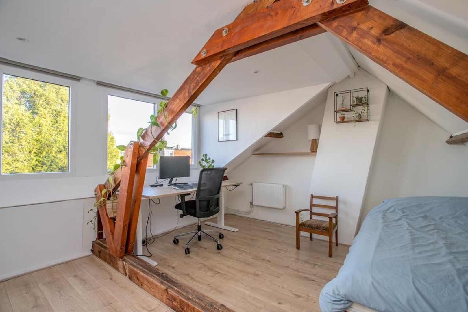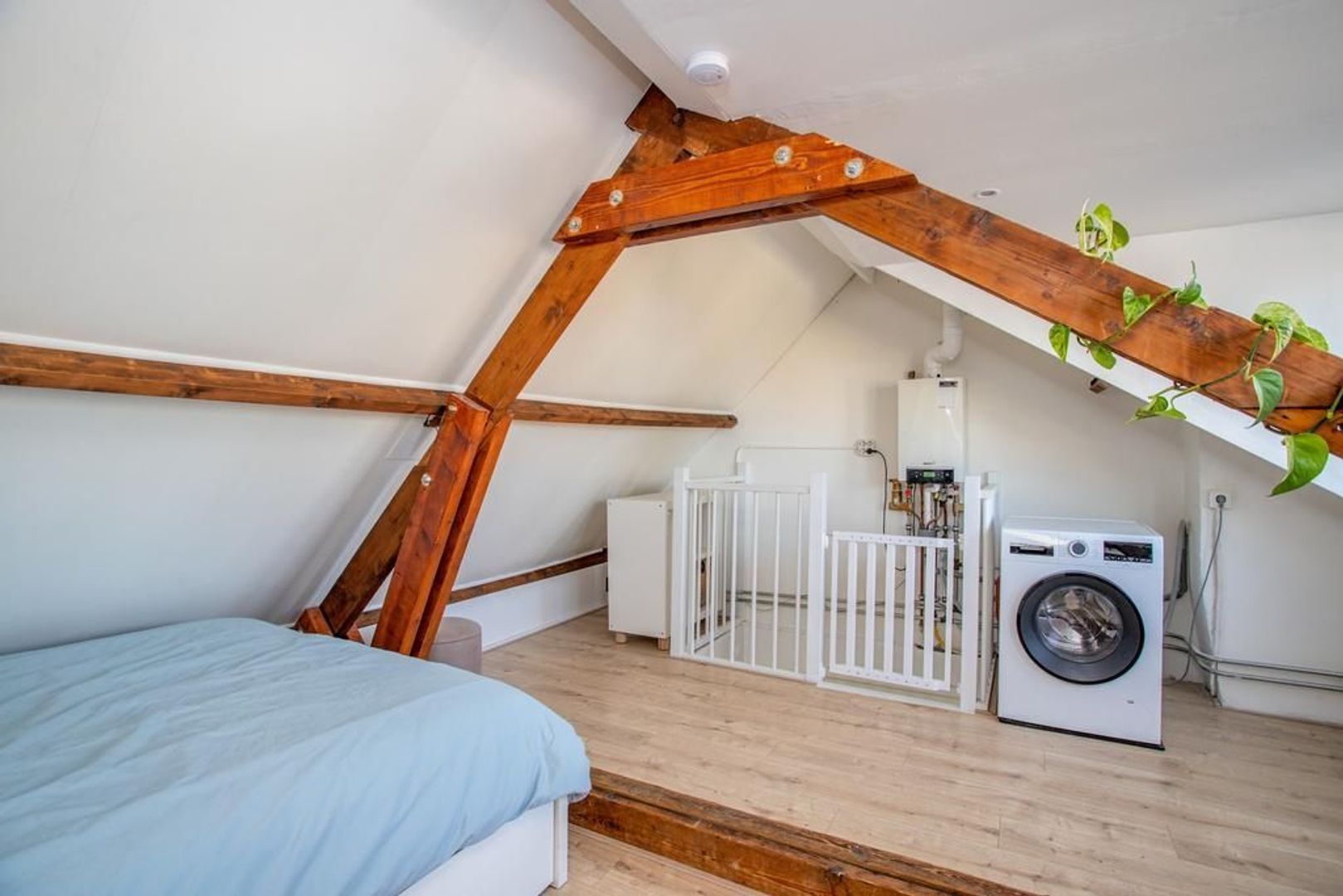De zolder van de woning beschikt over een dakkapel die in 2023 is geplaatst, waardoor je in bijna de gehele kamer kunt staan. Momenteel fungeert deze kamer als logeer- en werkkamer, en hier bevindt zich ook de wasmachineaansluiting. De houten balken voegen extra karakter toe aan de ruimte.