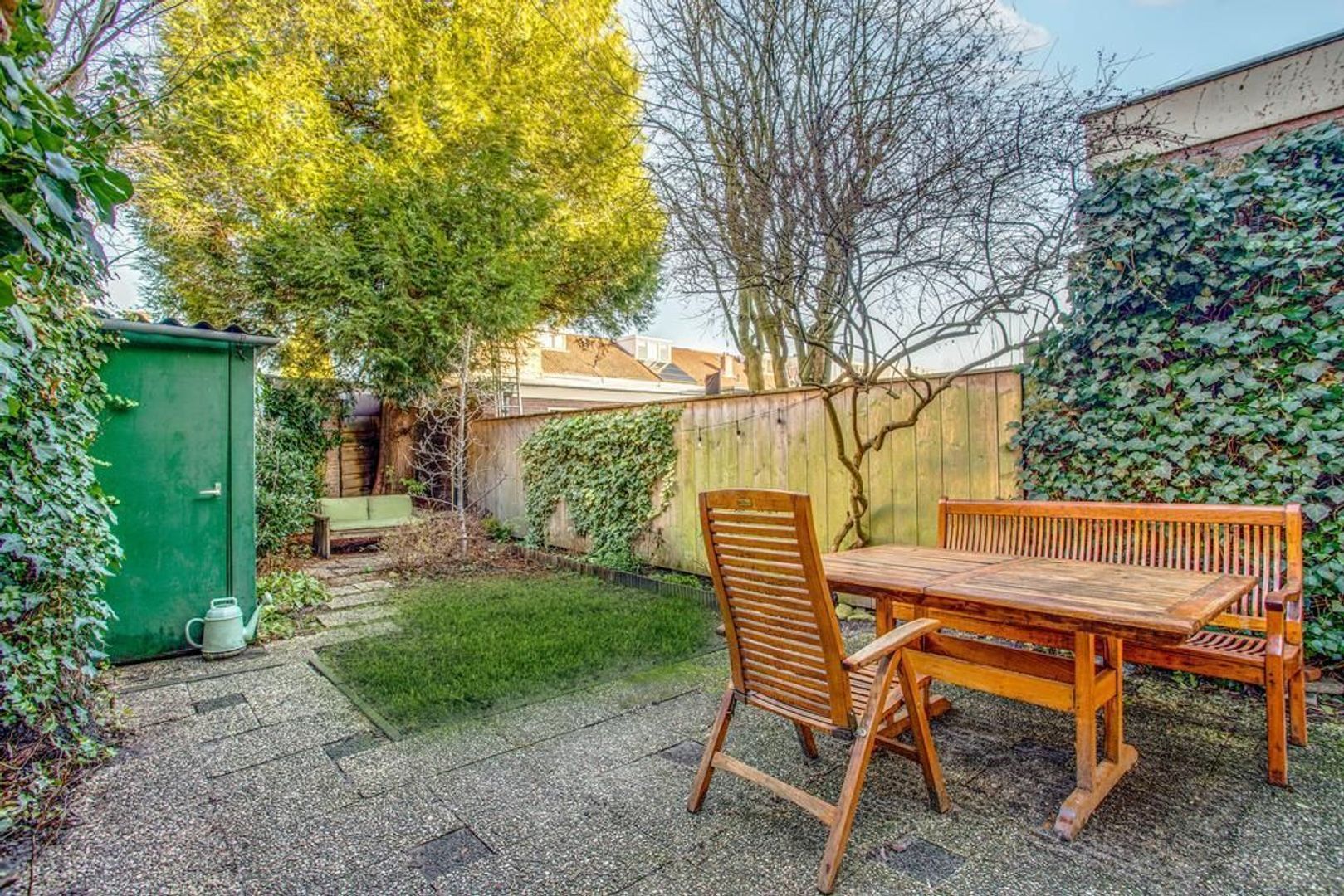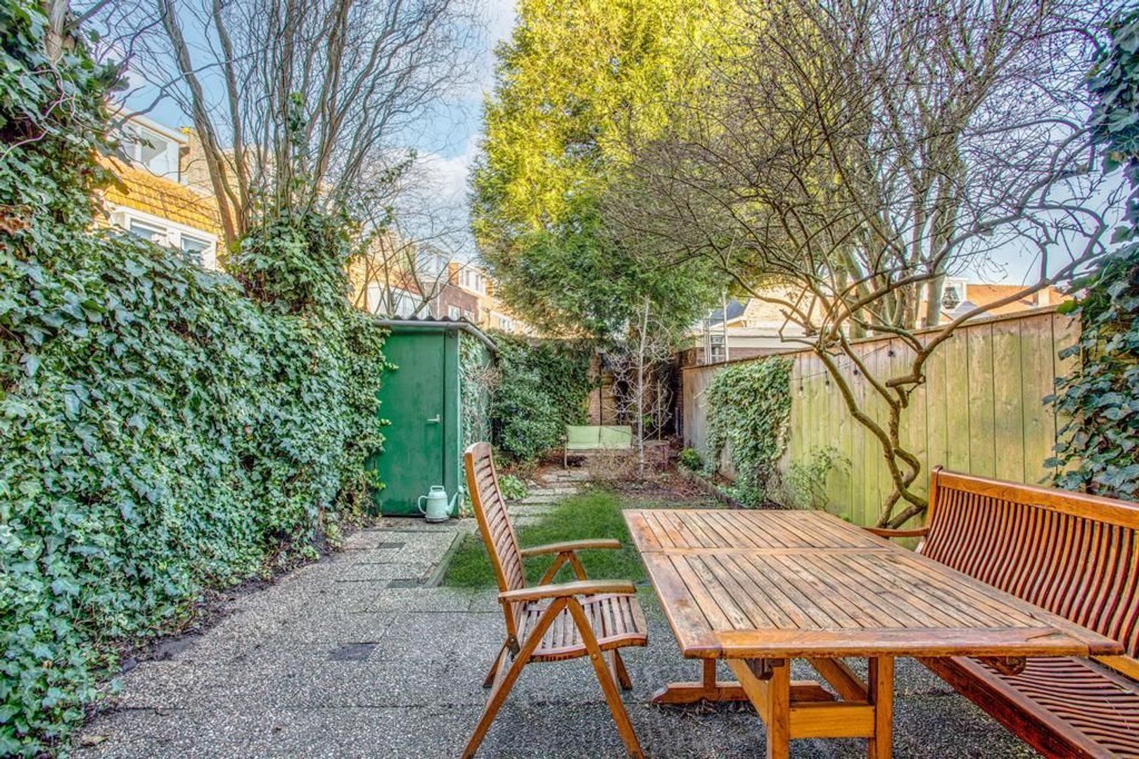 • Achtertuin op het noordoosten met in de zomer veel zon door de diepte, voorzien van berging;