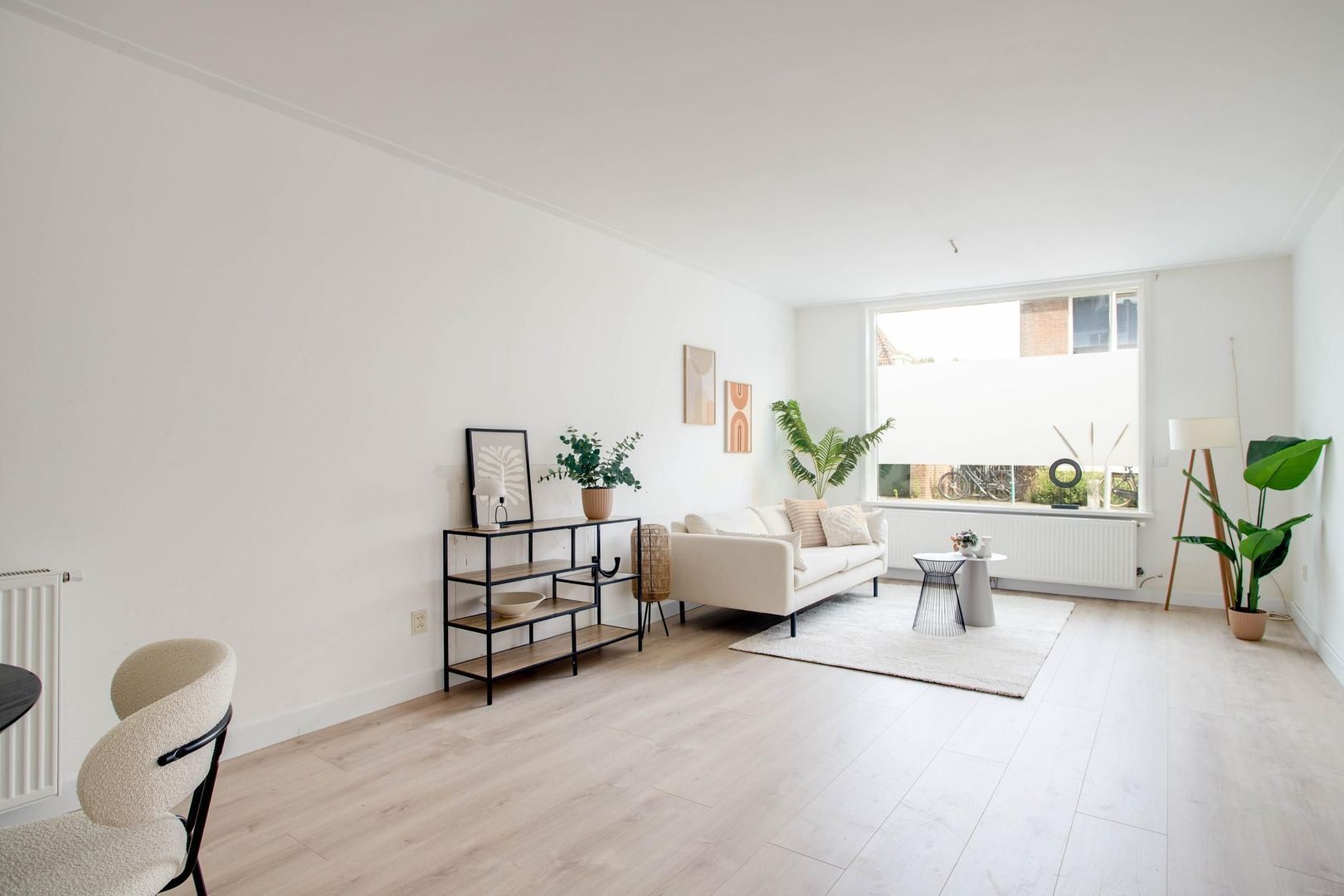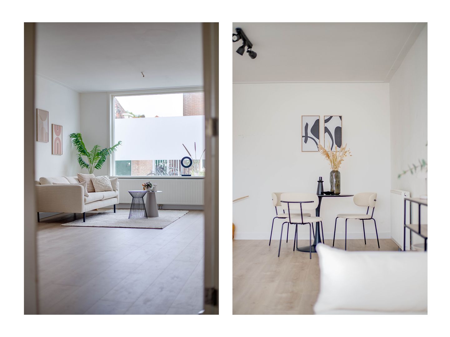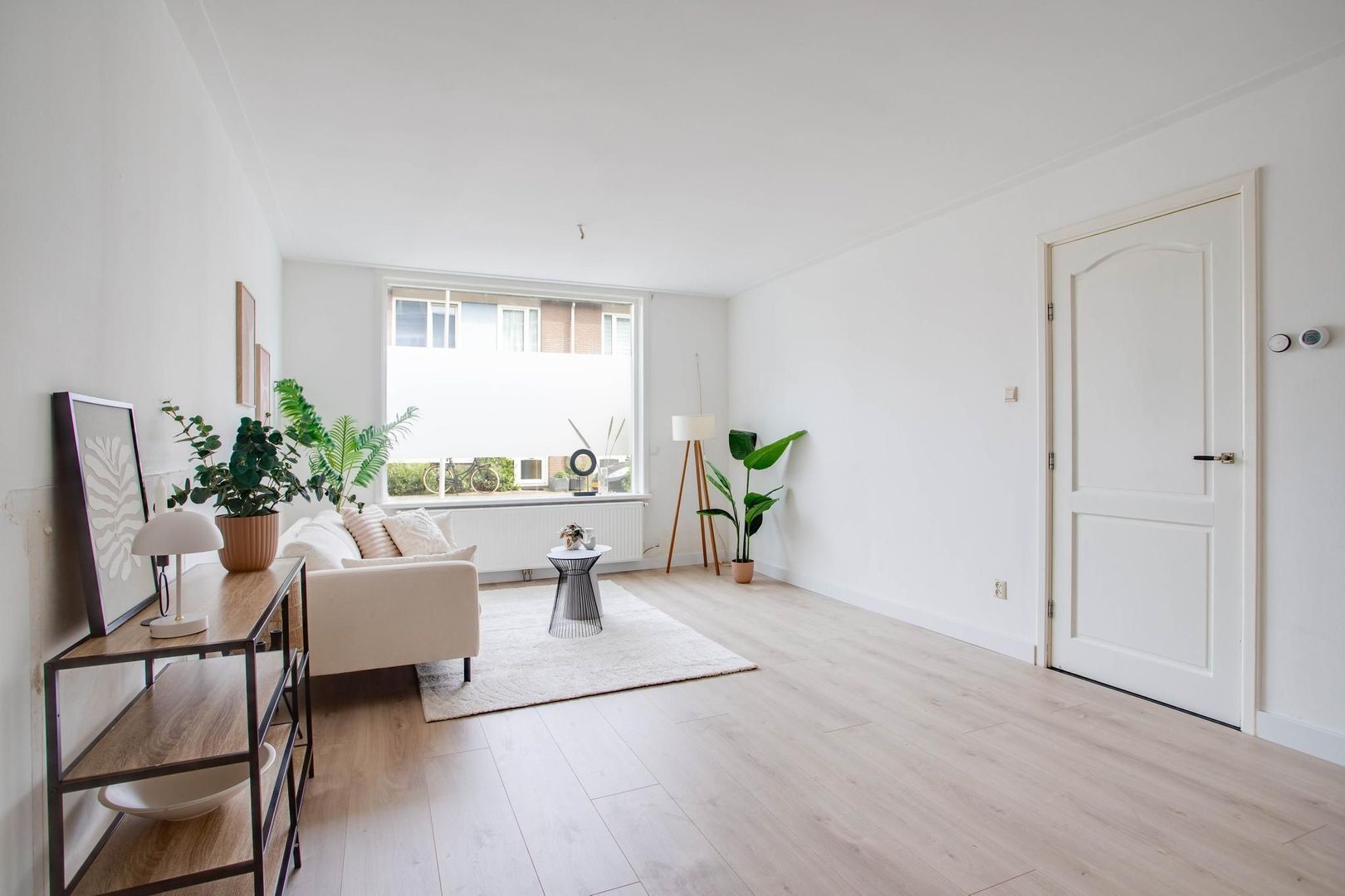 Je komt binnen in de hal, die voorzien is van een meterkast. De hal geeft toegang tot de woonkamer. De woning kenmerkt zich door de verzorgde en moderne staat van afwerking. Zo zijn de wanden voorzien van strak stuc werk en de vloer een laminaat vloer. De woonkamer is aan de voorzijde van de woning gelegen en heeft dankzij de grote raampartij een fijne daglichtinval. De ruimte laat diverse inrichtingsmogelijkheden vrij, zo is er ruim voldoende plek voor het creëren van een gezellige zithoek en een royale eethoek.