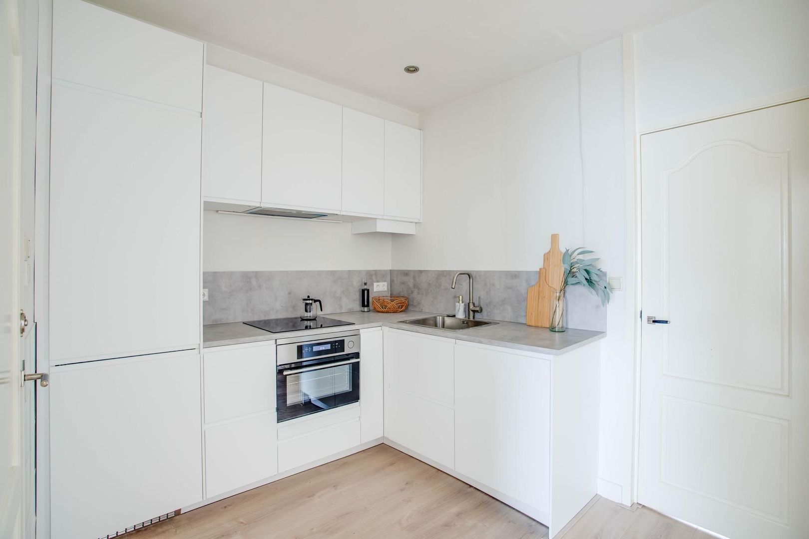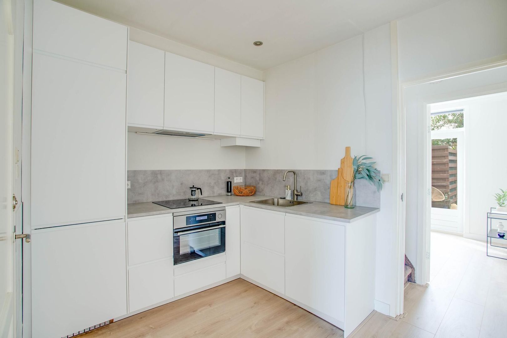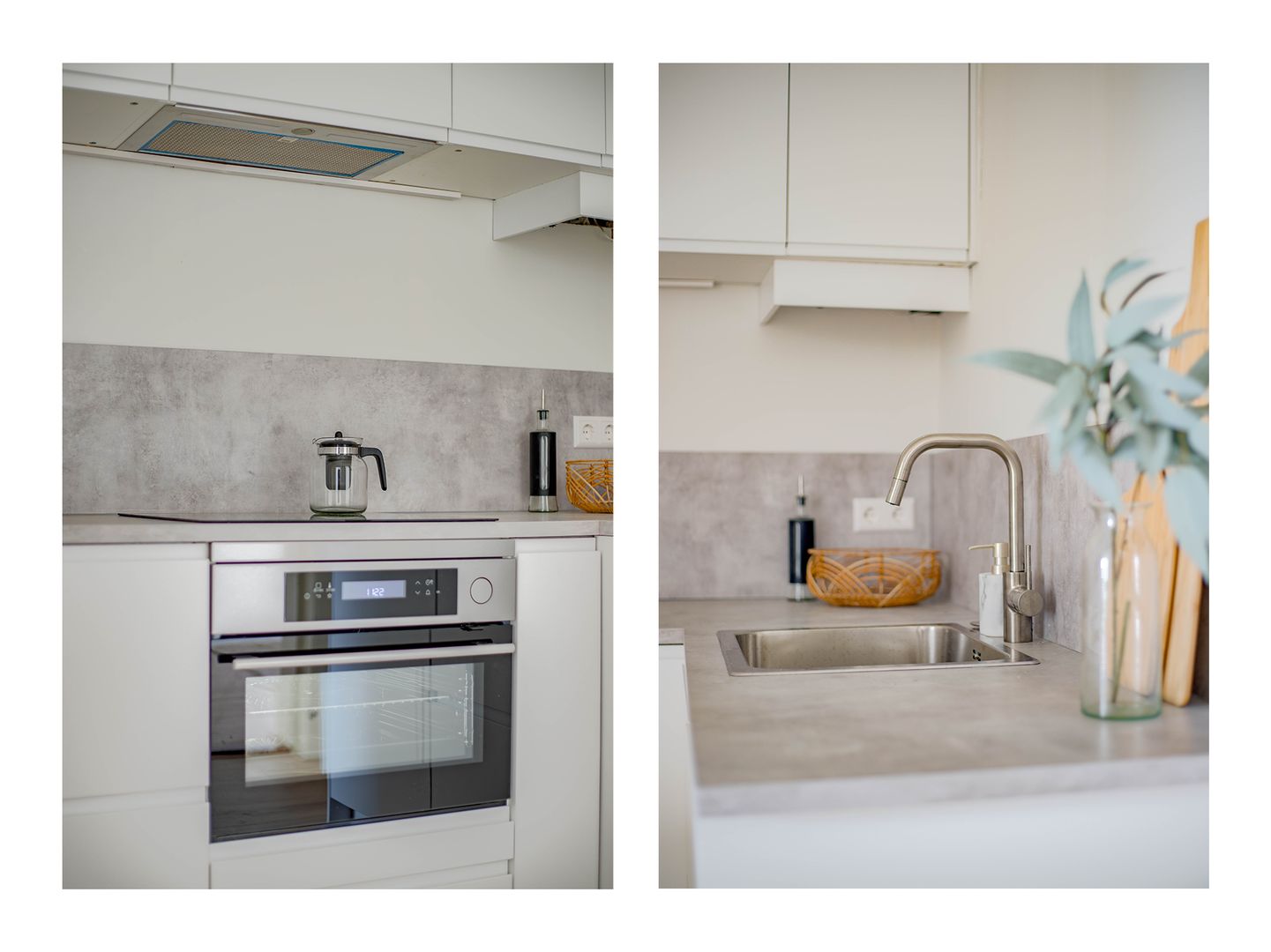 De dichte keuken grenst aan de woonkamer. De keuken uit 2024 heeft een moderne uitstraling en is voorzien van de volgende inbouwapparatuur: inductiekookplaat, oven, afzuigkap, vaatwasser, koelkast en vriezer.