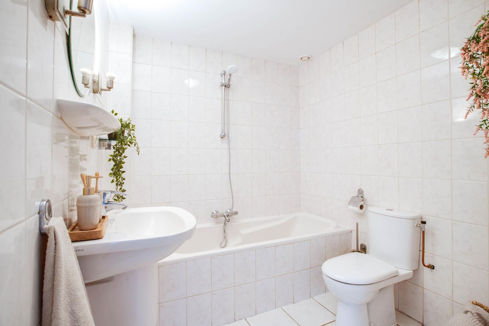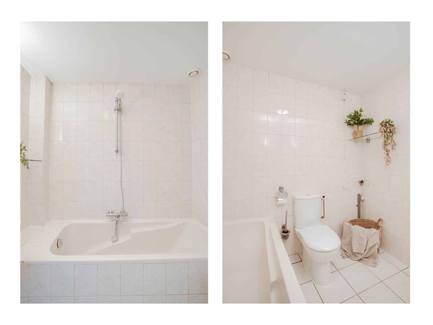 Vanuit de keuken is de badkamer toegankelijk. De badkamer is voorzien van een toilet, ligbad met douche en wastafel.
