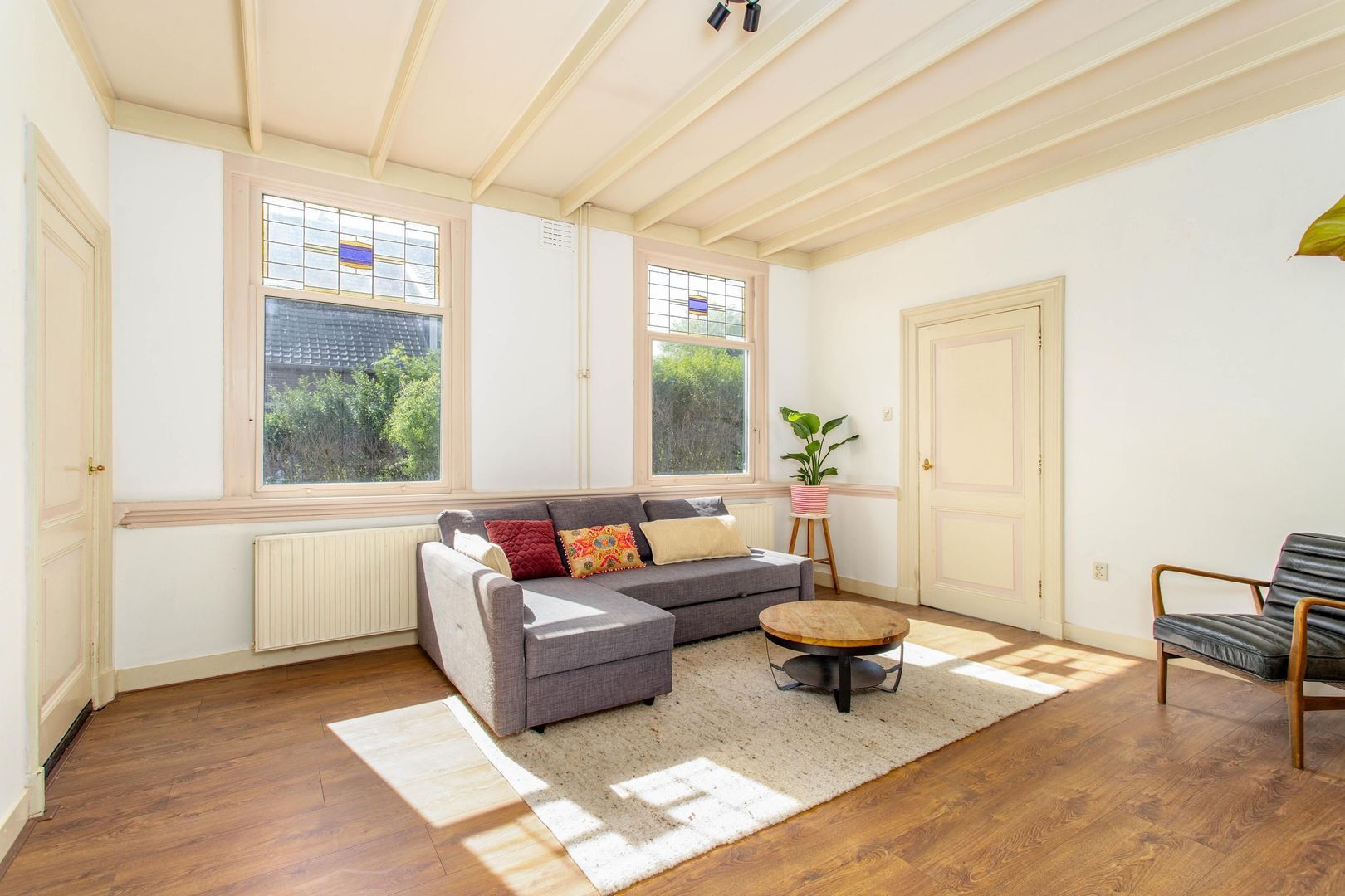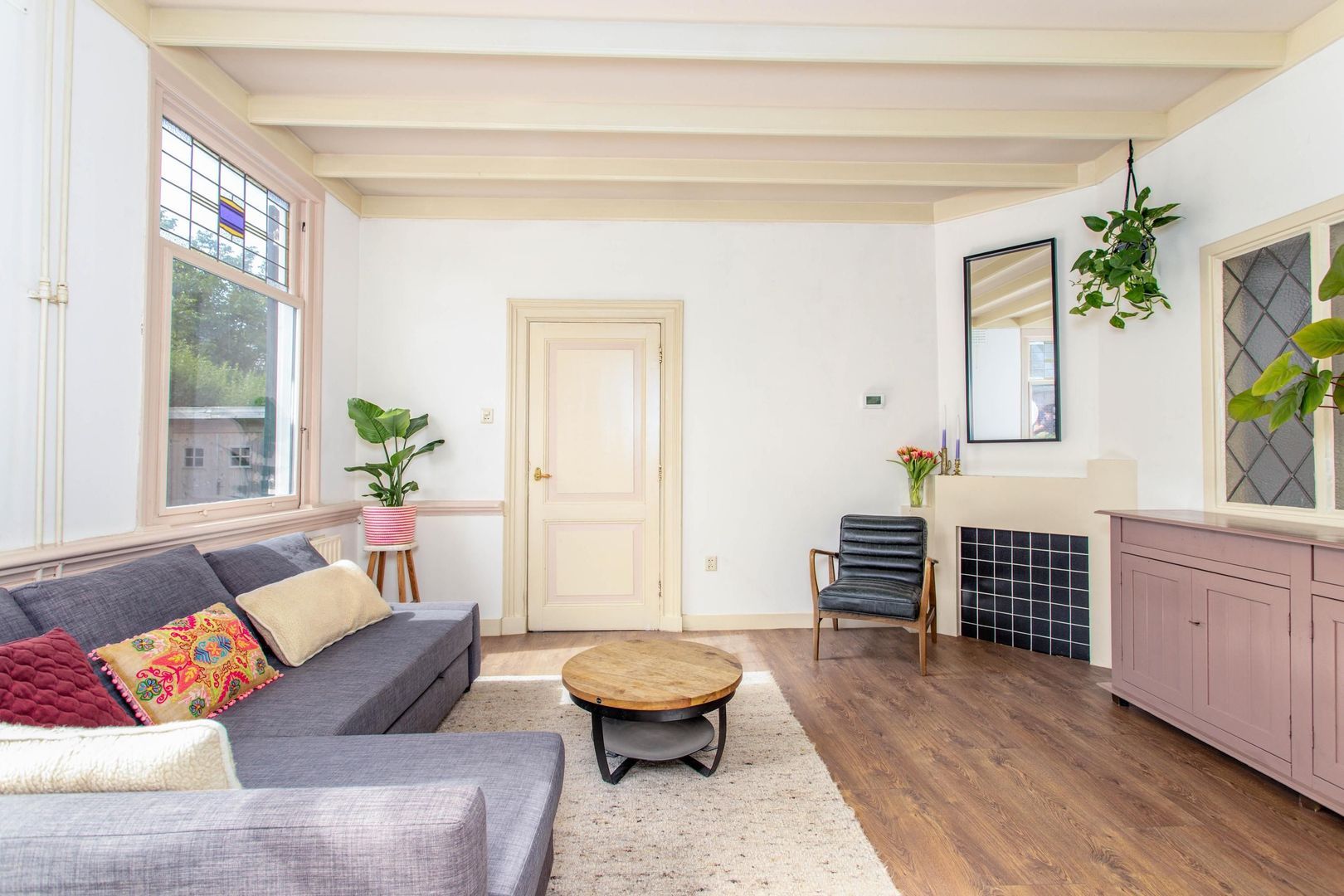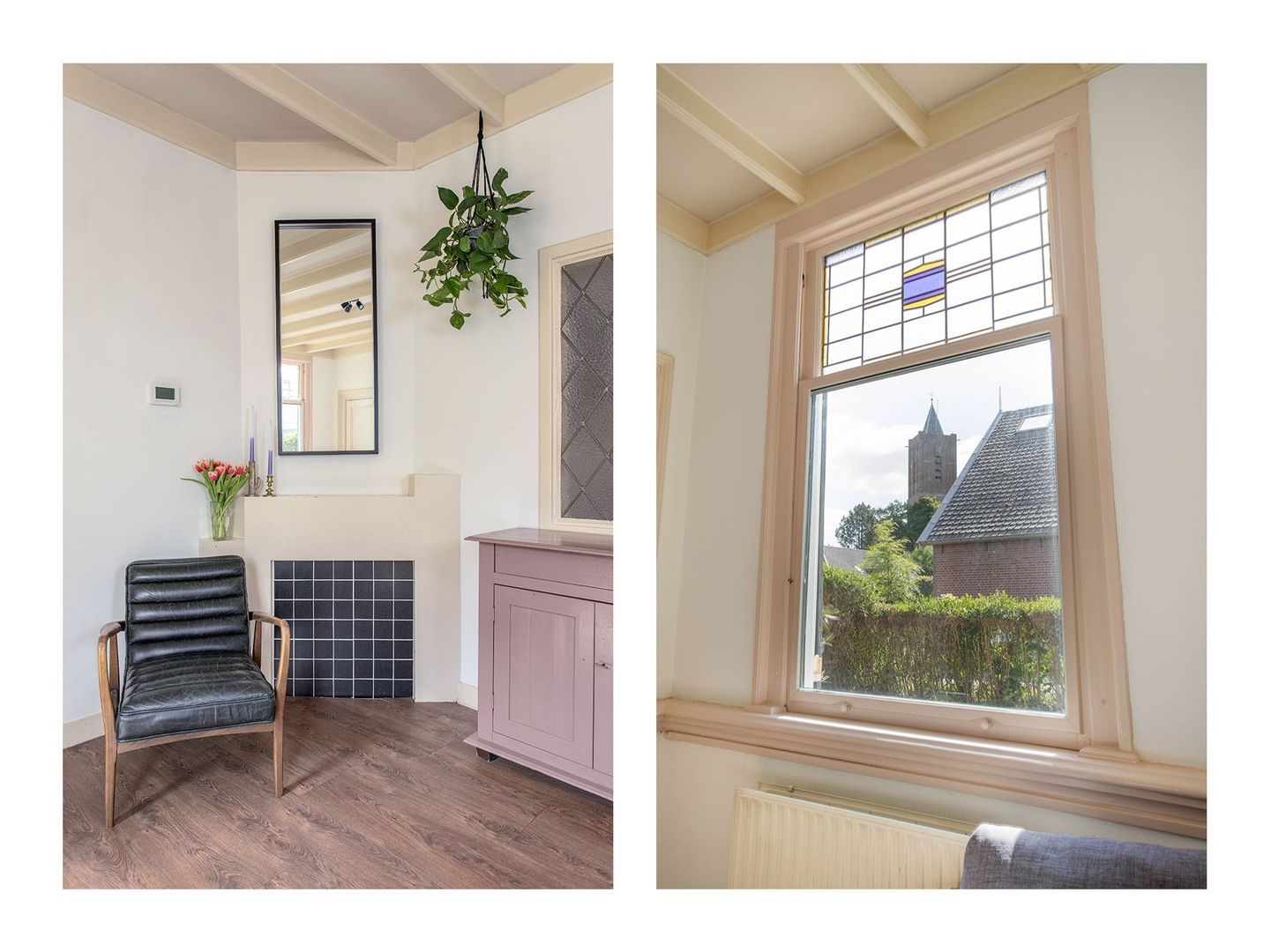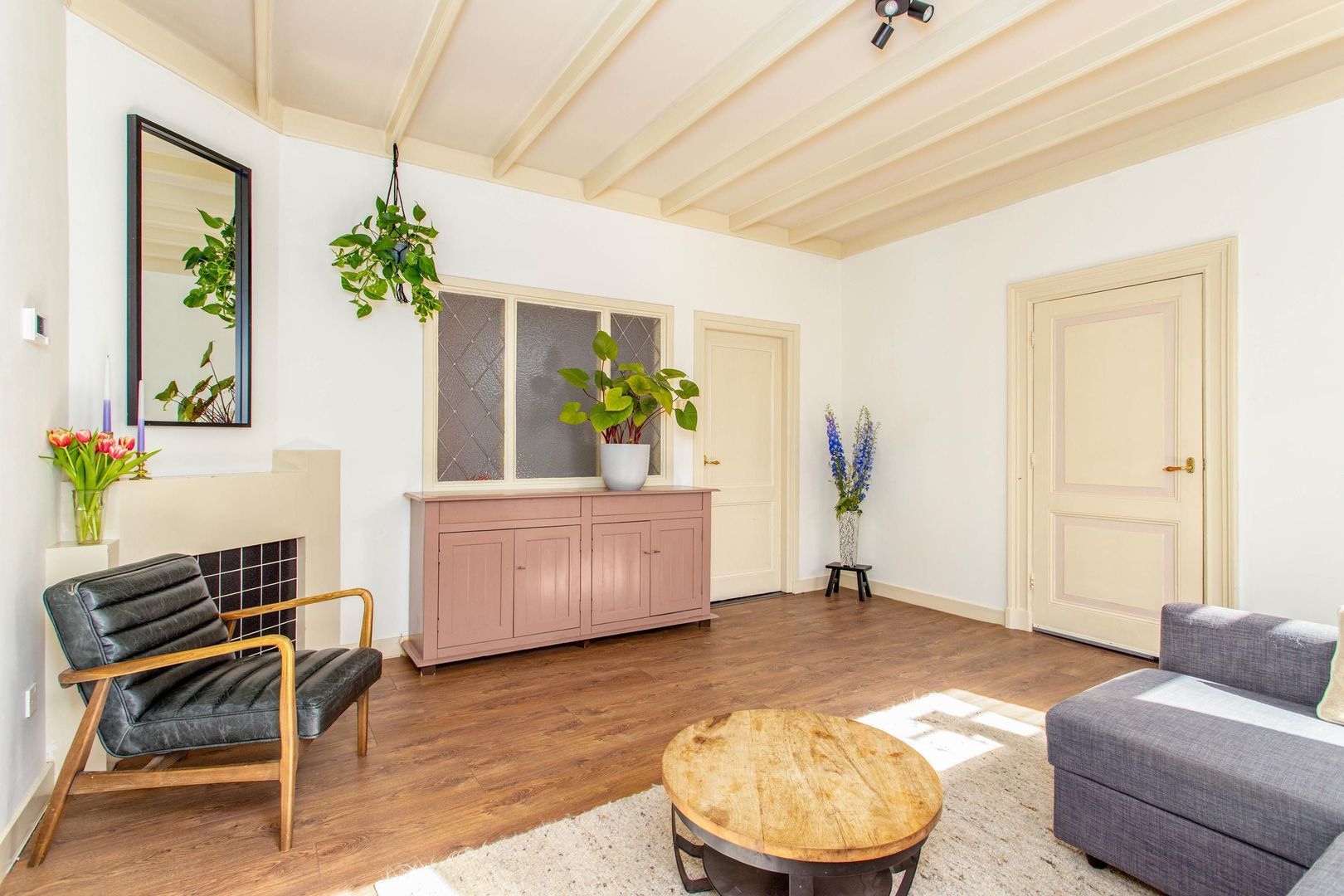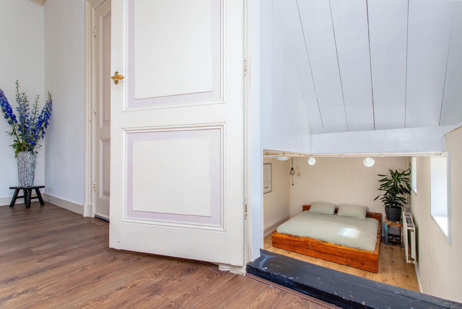 Entree/hal voorzien van een tegelvloer met toegang tot het toilet, woonkamer en keuken. Achter de ensuite deuren bevindt zich de dichte keuken, welke ruim is opgezet en voorzien van inbouwapparatuur. Via de keuken bereik je de grote badkamer, welke voorzien is van een ligbad, douche, toilet, wastafel en inbouwkasten. Lichte woonkamer voorzien van parketvloer en balken plafond. Twee slaapkamers, waarvan de ouderslaapkamer zich middels een trap(je) naar beneden bevindt. Boven de ouderslaapkamer bevindt zich de eetkamer met veel lichtinval, originele details en parketvloer.