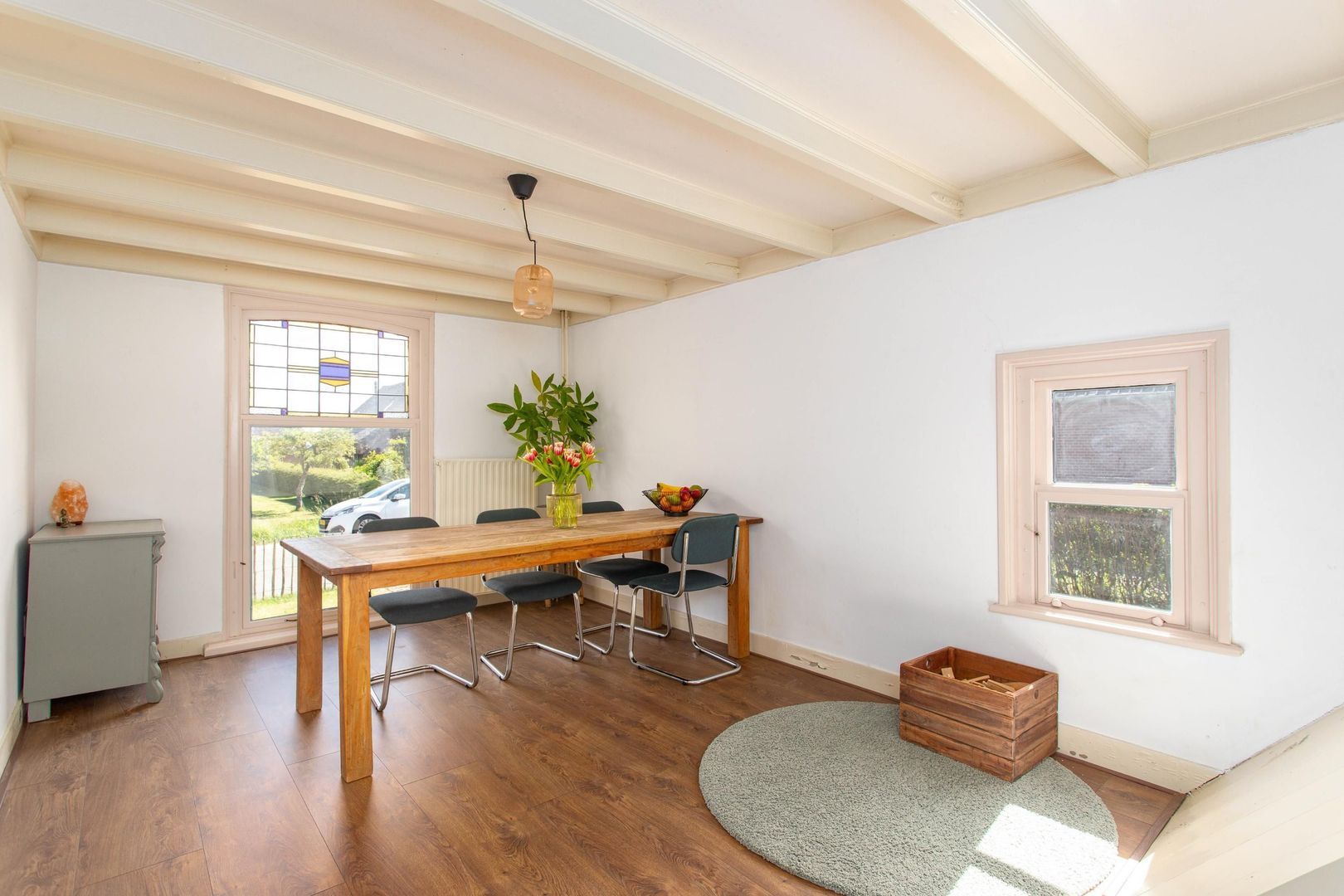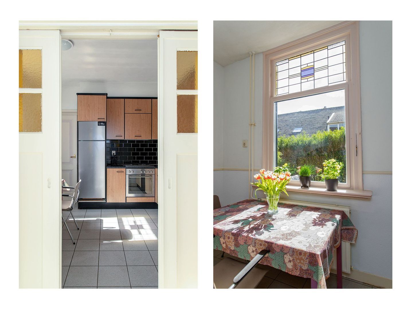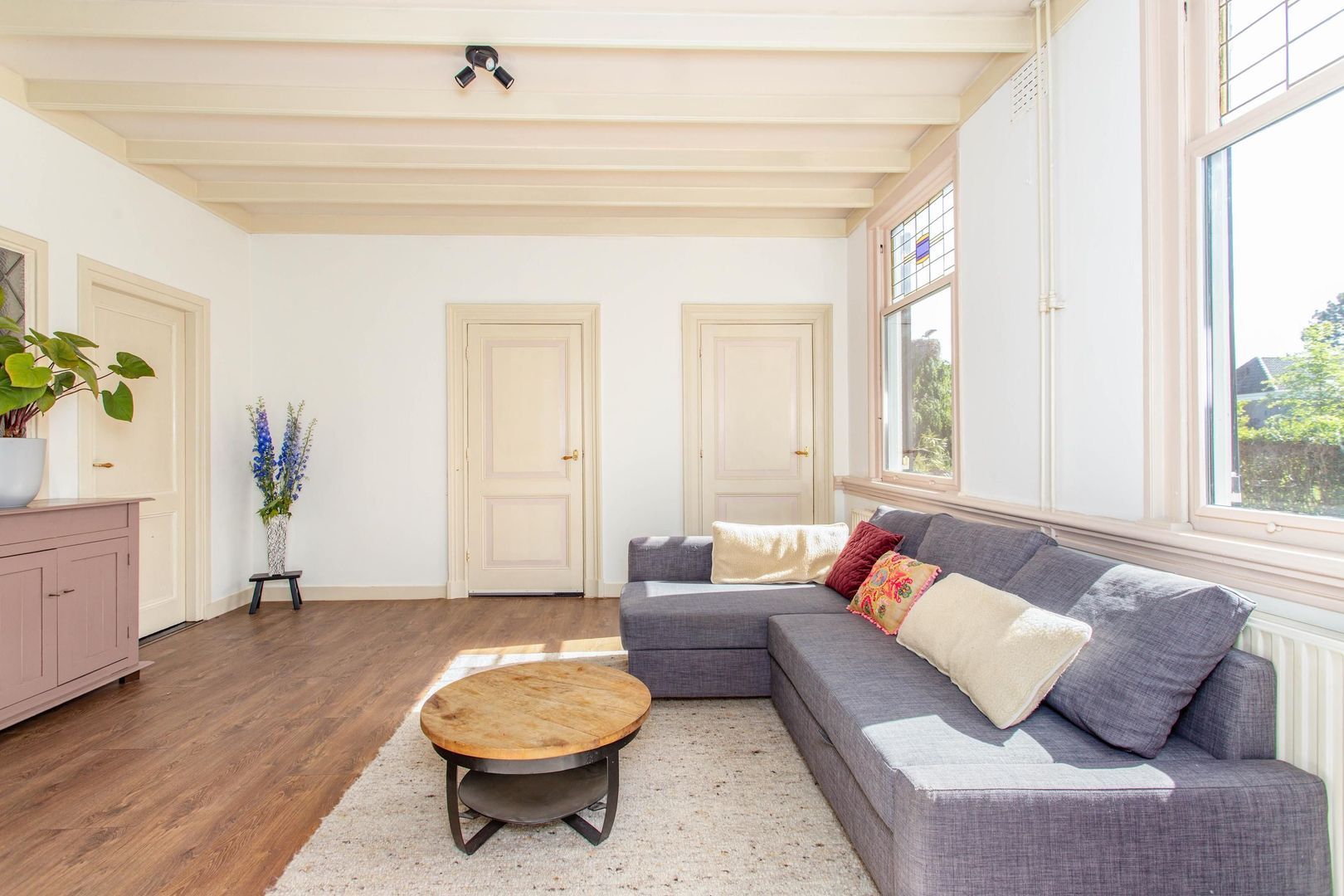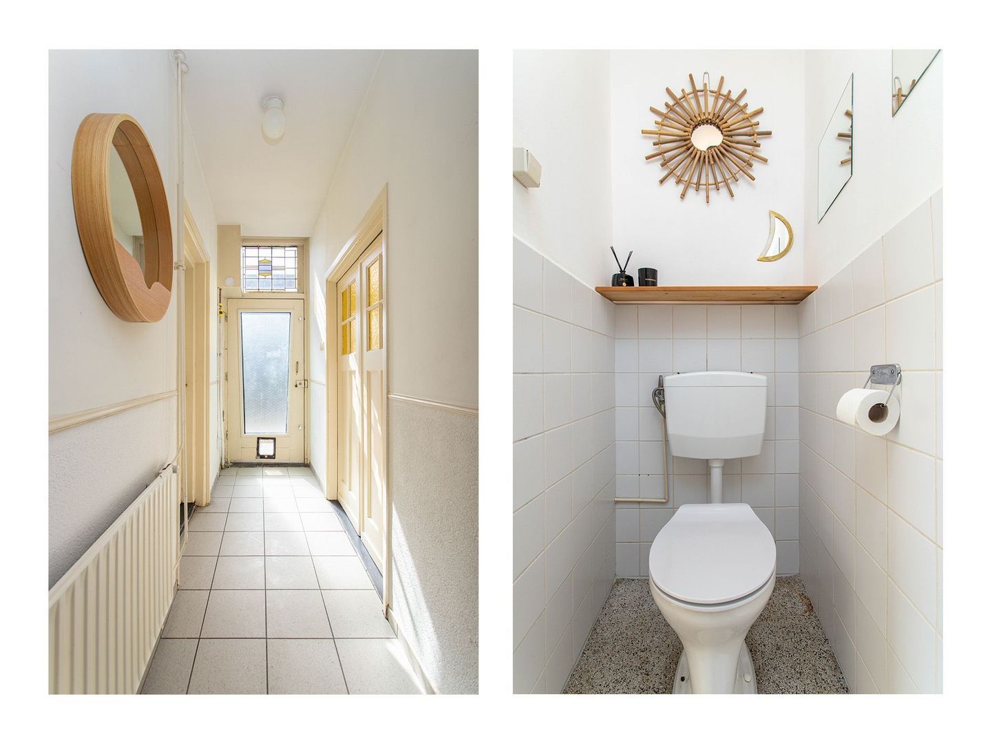 Entree/hal voorzien van een tegelvloer met toegang tot het toilet, woonkamer en keuken. Achter de ensuite deuren bevindt zich de dichte keuken, welke ruim is opgezet en voorzien van inbouwapparatuur. Via de keuken bereik je de grote badkamer, welke voorzien is van een ligbad, douche, toilet, wastafel en inbouwkasten. Lichte woonkamer voorzien van parketvloer en balken plafond. Twee slaapkamers, waarvan de ouderslaapkamer zich middels een trap(je) naar beneden bevindt. Boven de ouderslaapkamer bevindt zich de eetkamer met veel lichtinval, originele details en parketvloer.